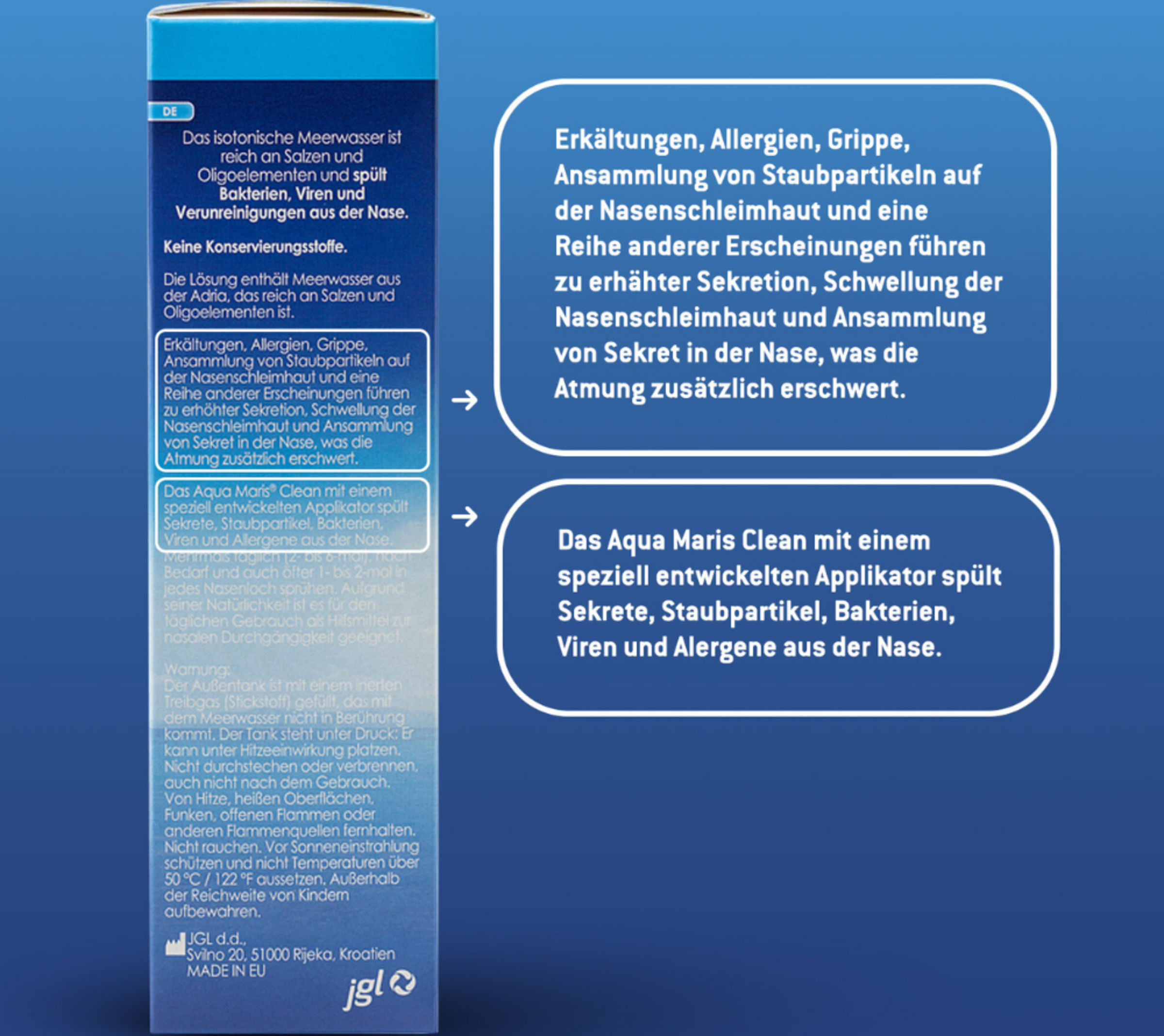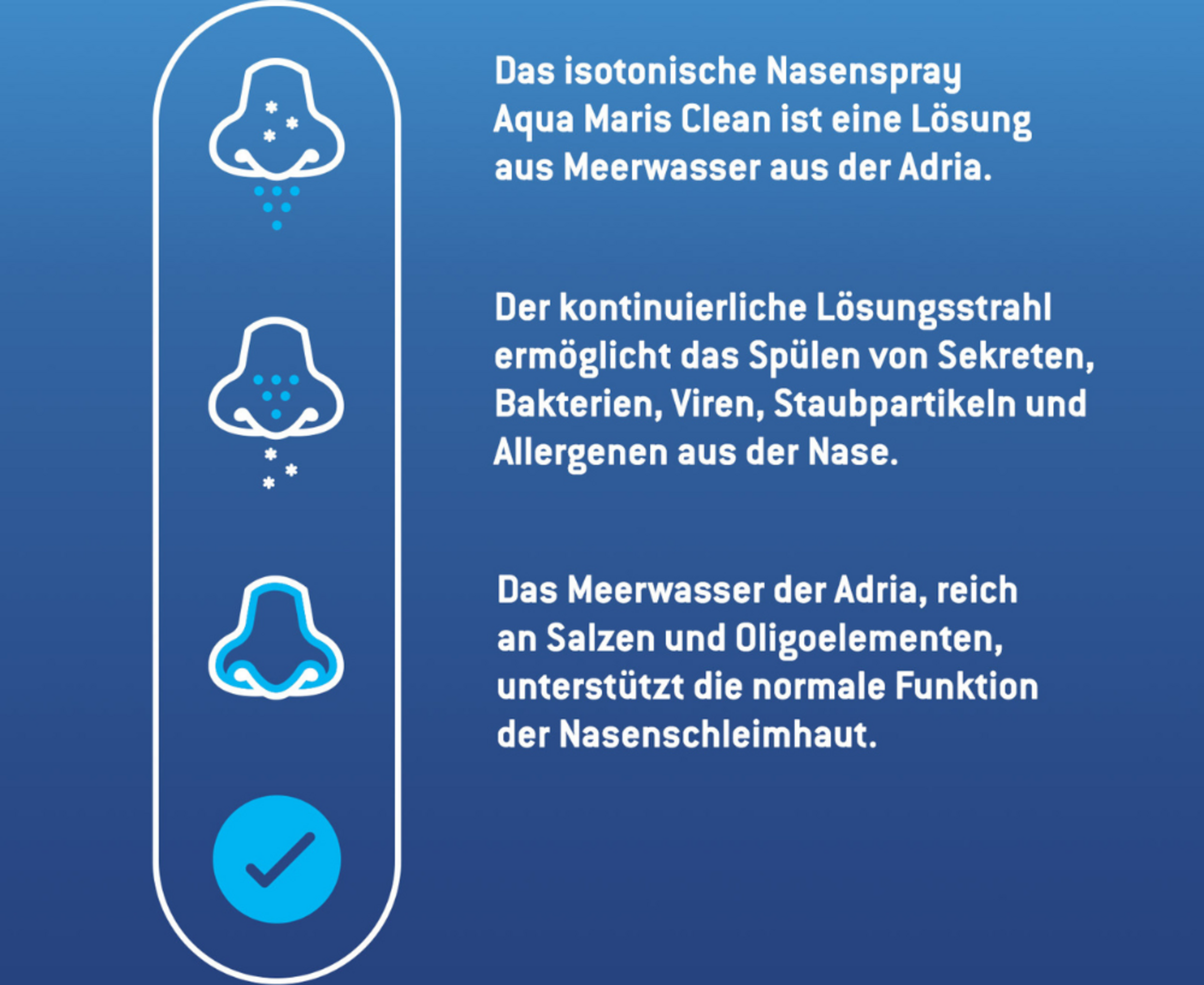 Das isotonische Meerwasser ist reich an Salzen und Oligoelementen, spült Keime und Verunreinigungen weg und fördert eine gute Durchgängigkeit der oberen Atemwege.