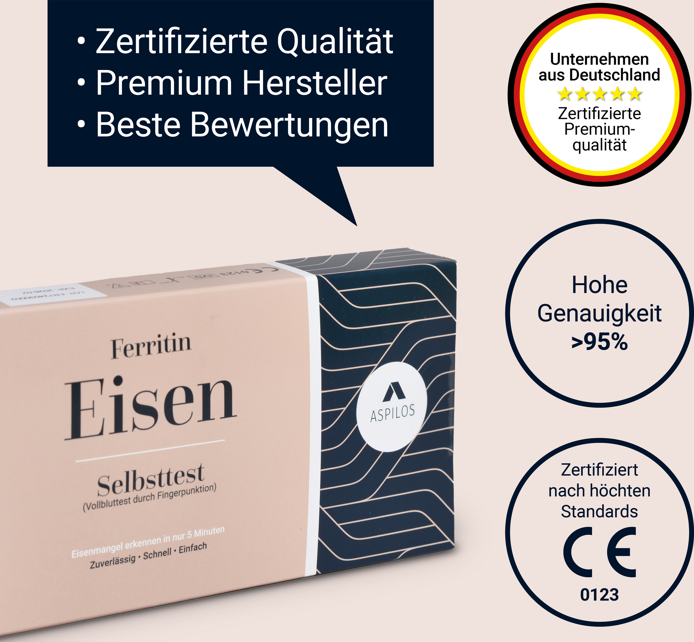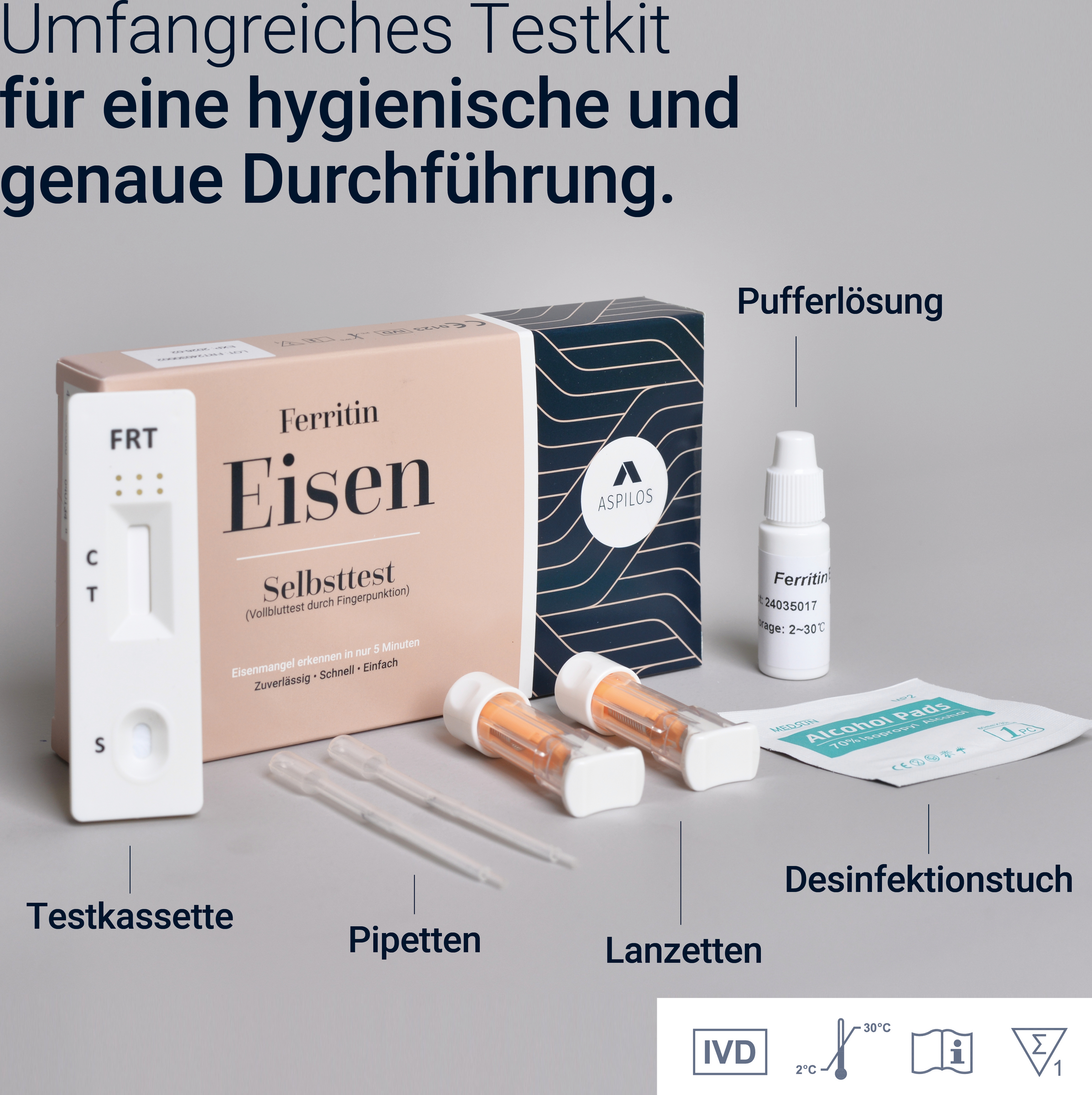 Genauigkeit: Die Ferritin-Schnelltestkassette wurde mit einem führenden kommerziellen Ferritin-CLIA-Test verglichen. Die Korrelation zwischen diesen beiden Systemen liegt bei über 95,0 %. Mit dem Ferritin Schnelltest für zuhause können Ferritinwerte im Blut von bis zu 30 ng/ml nachgewiesen werden.