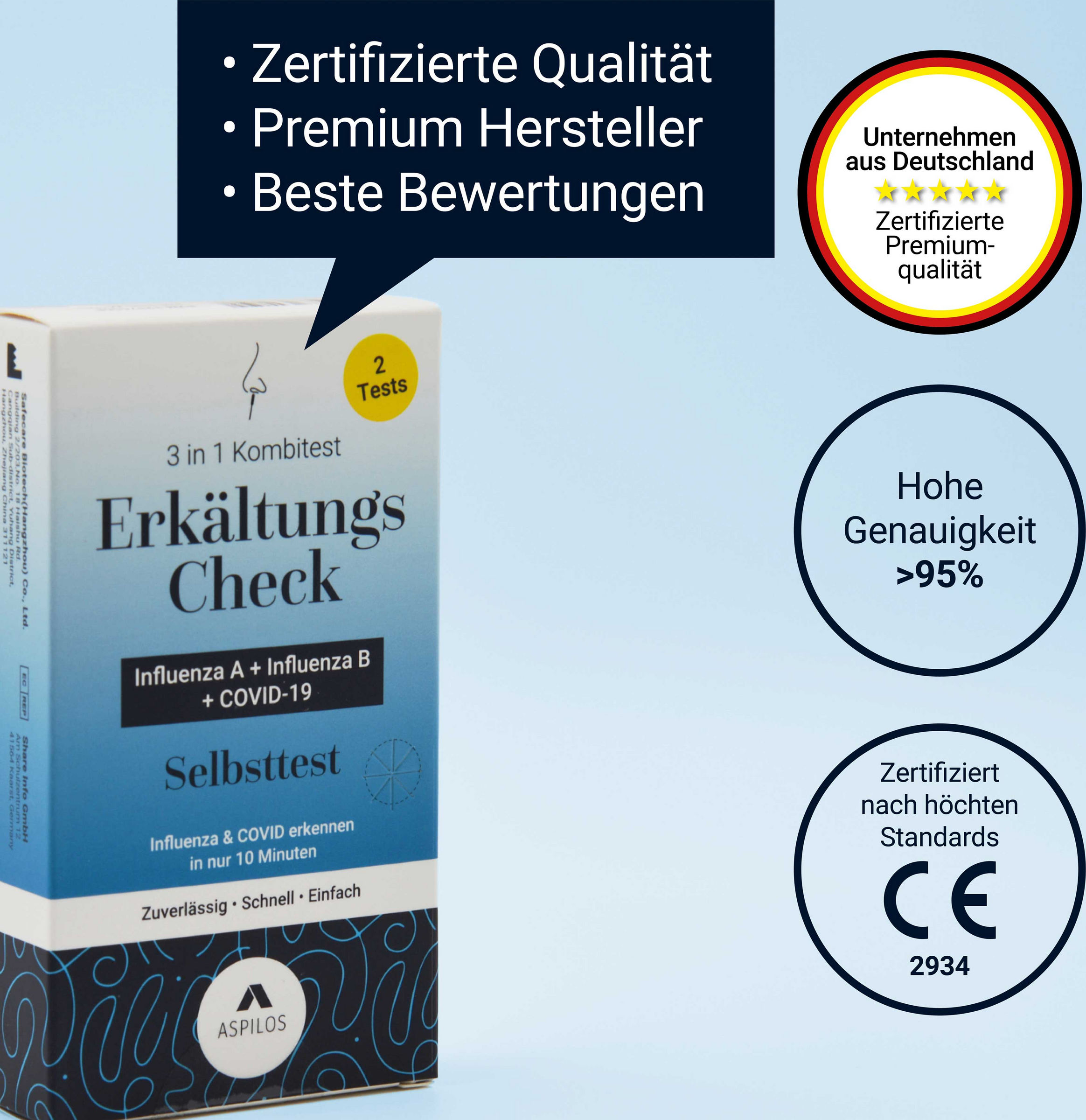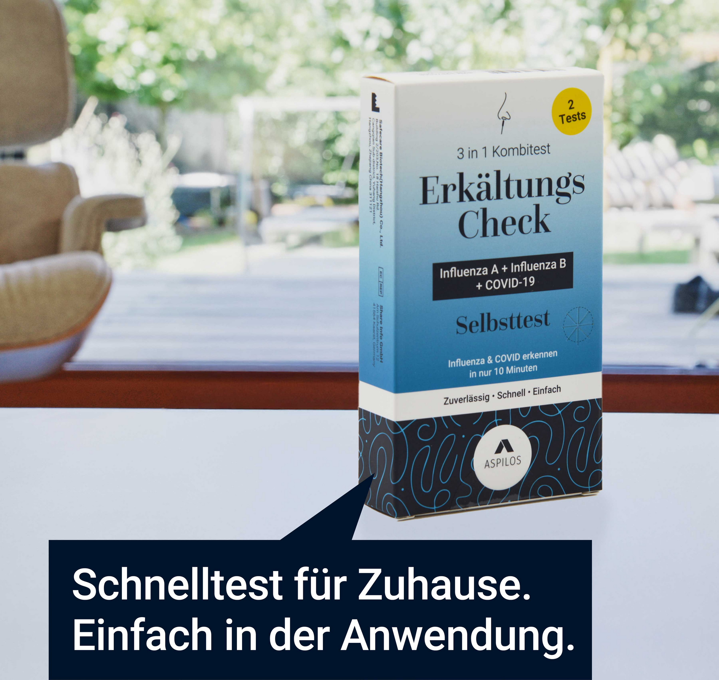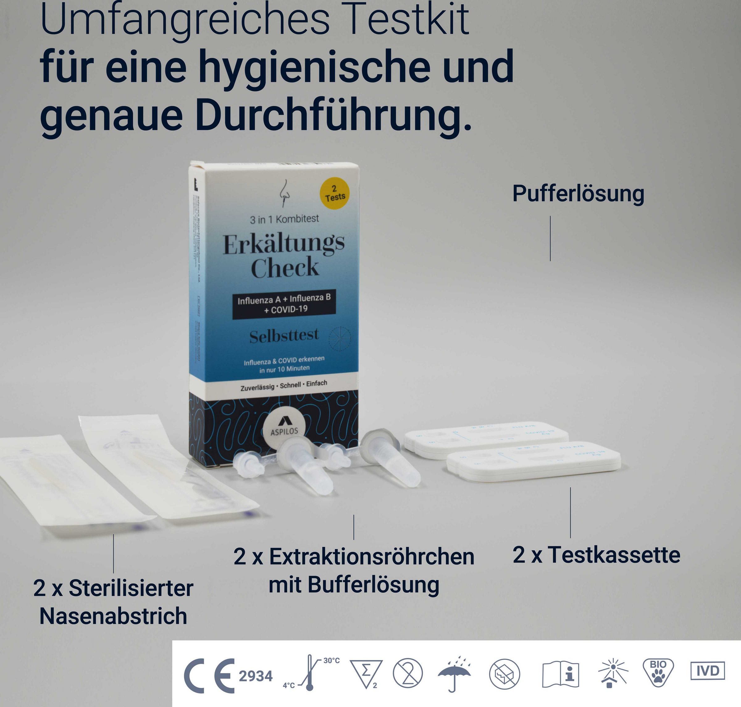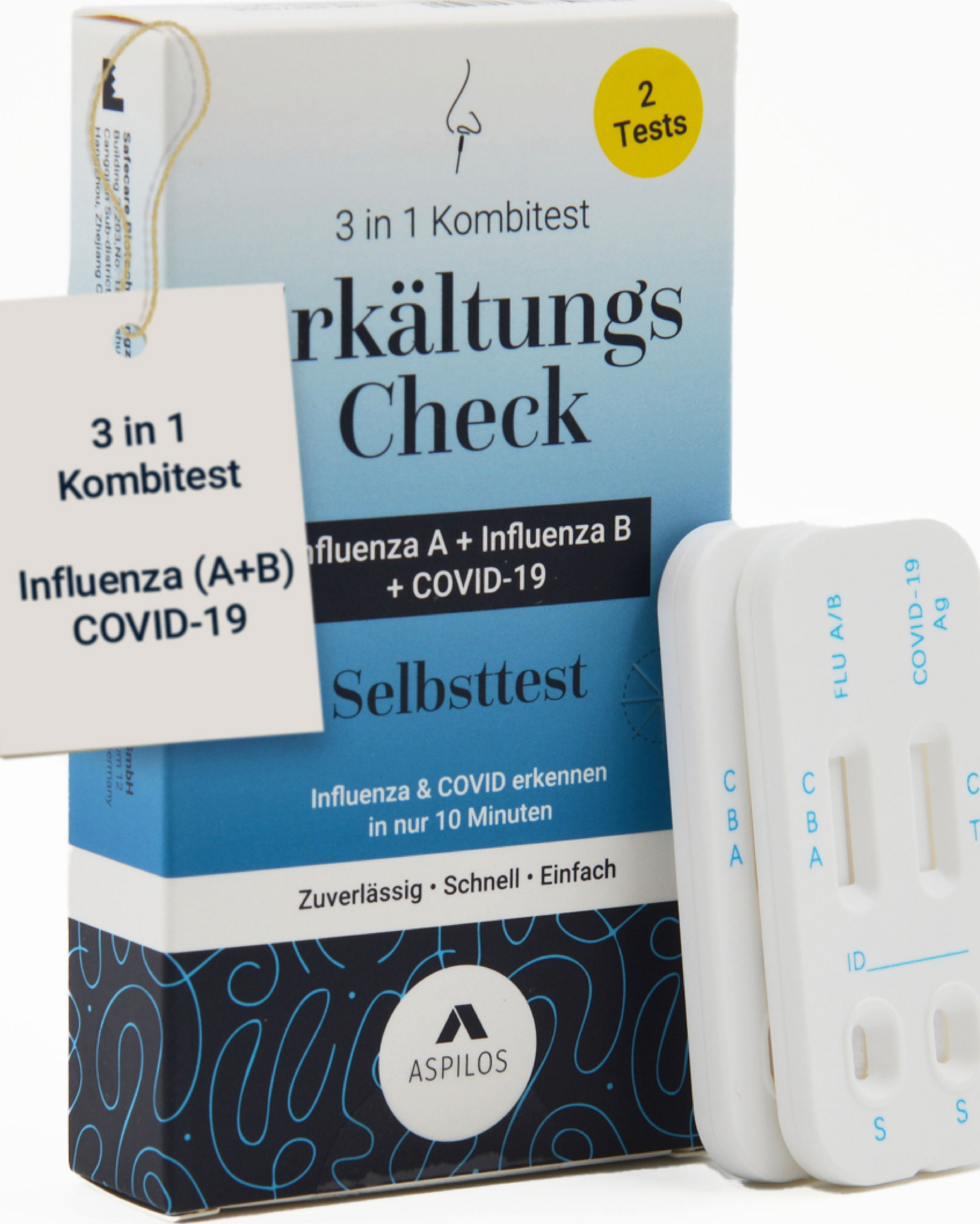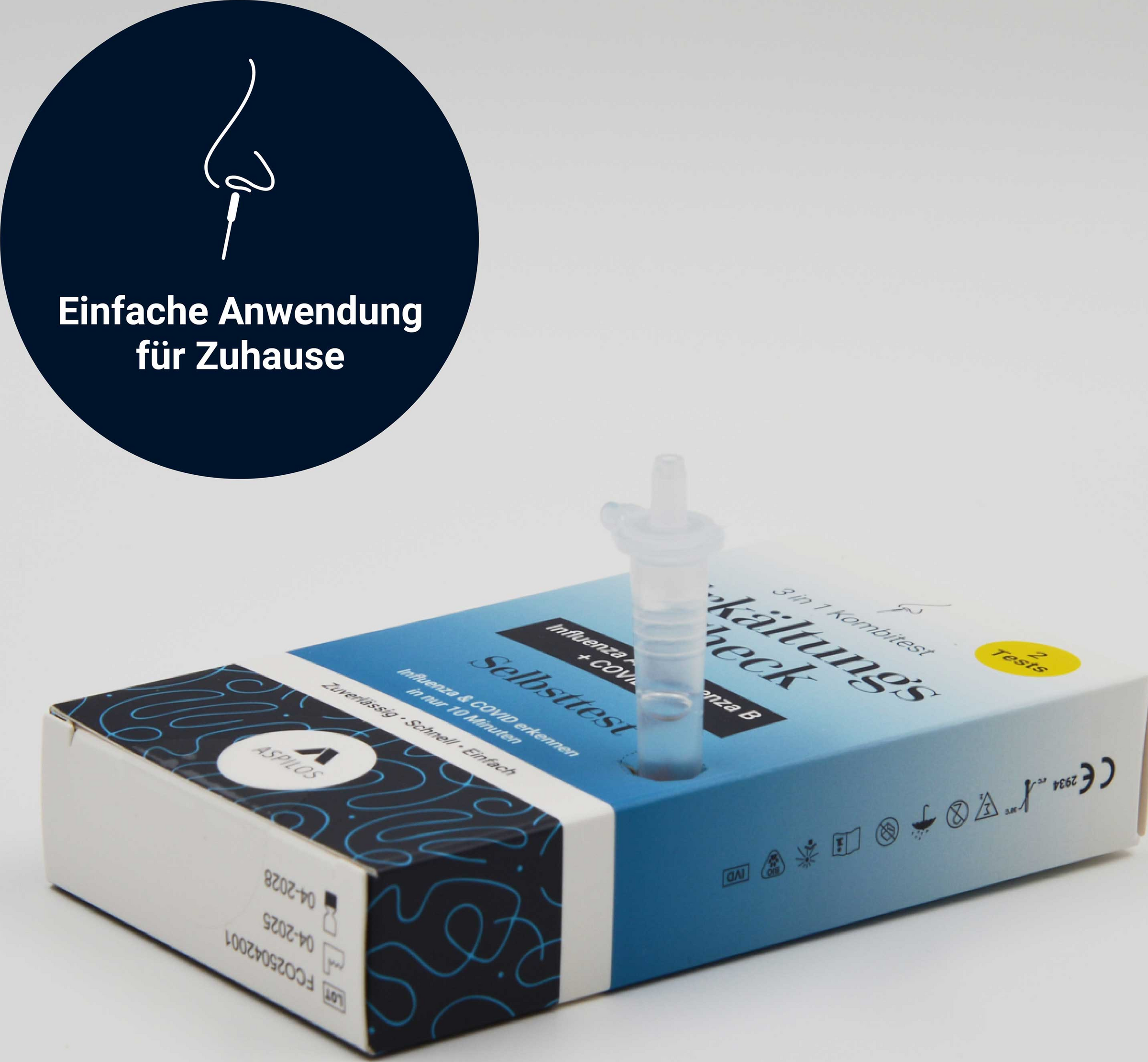 Ist es nun eine Erkältung, die Influenza-Grippe oder Corona? Mit dem Erkältungs-Check als 3in1 Kombi-Schnelltest von Aspilos lässt sich die Frage schnell und einfach beantworten.Der Aspilos Erkältungs Check ist ein zuverlässiger Selbsttest zur gleichzeitigen Erkennung von SARS-CoV-2 (COVID-19) sowie Influenza A und B – den häufigsten Erregern für Erkältungssymptome.