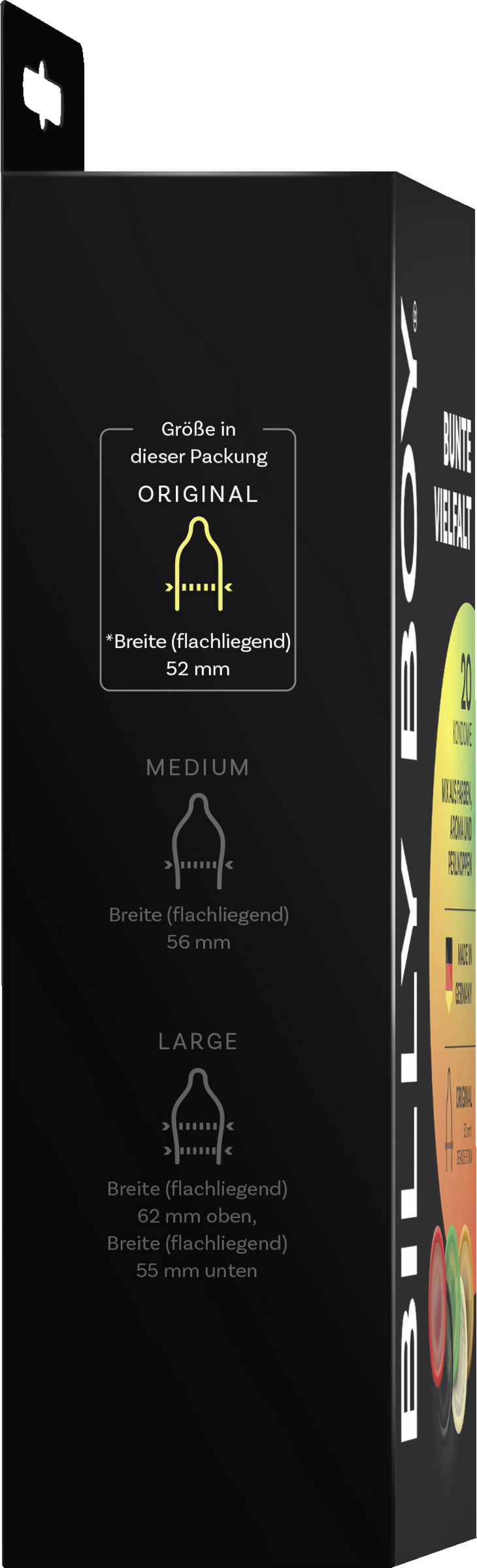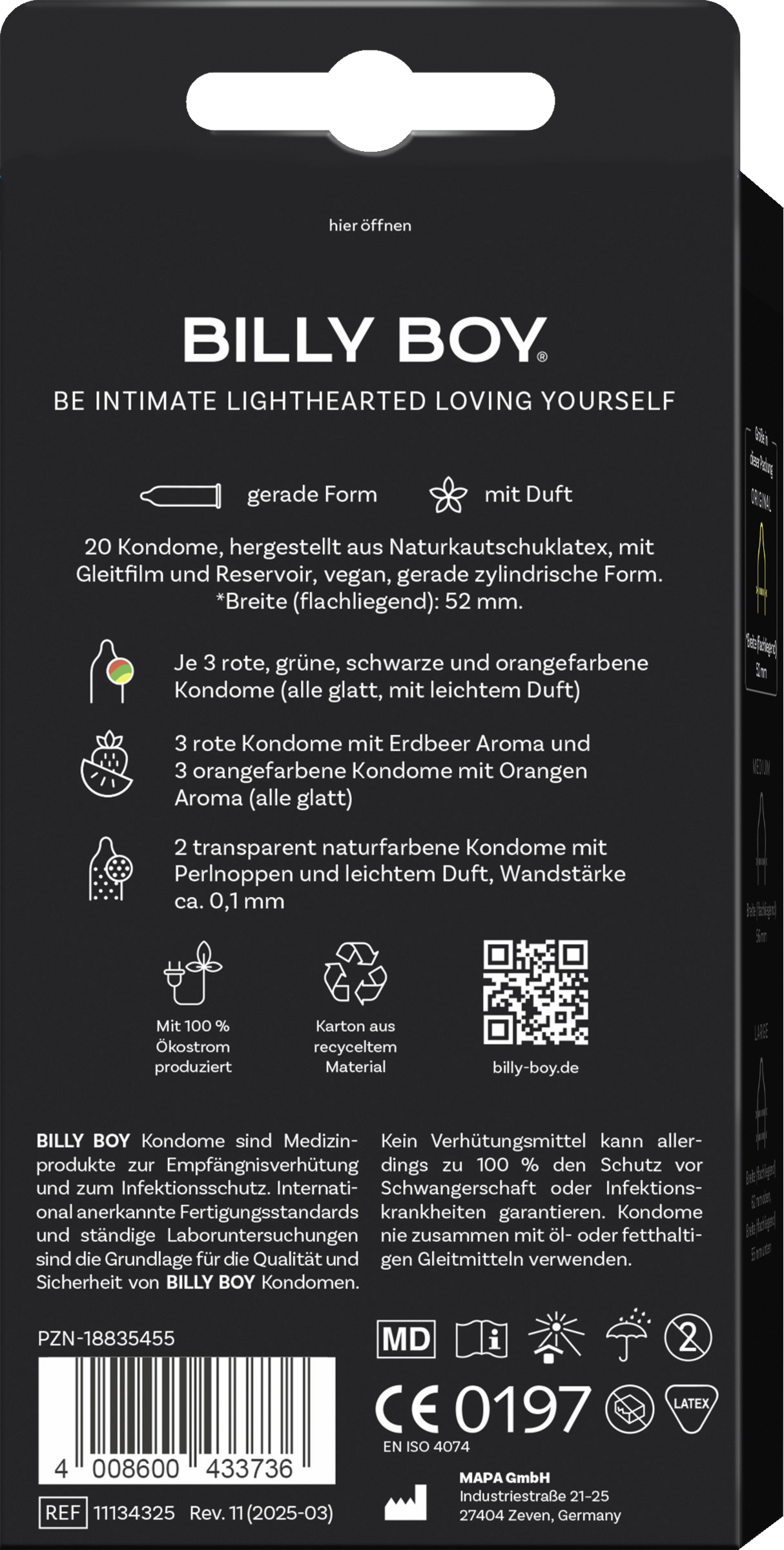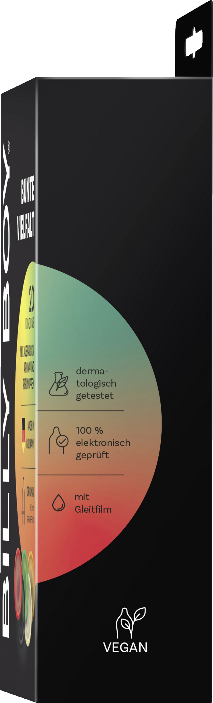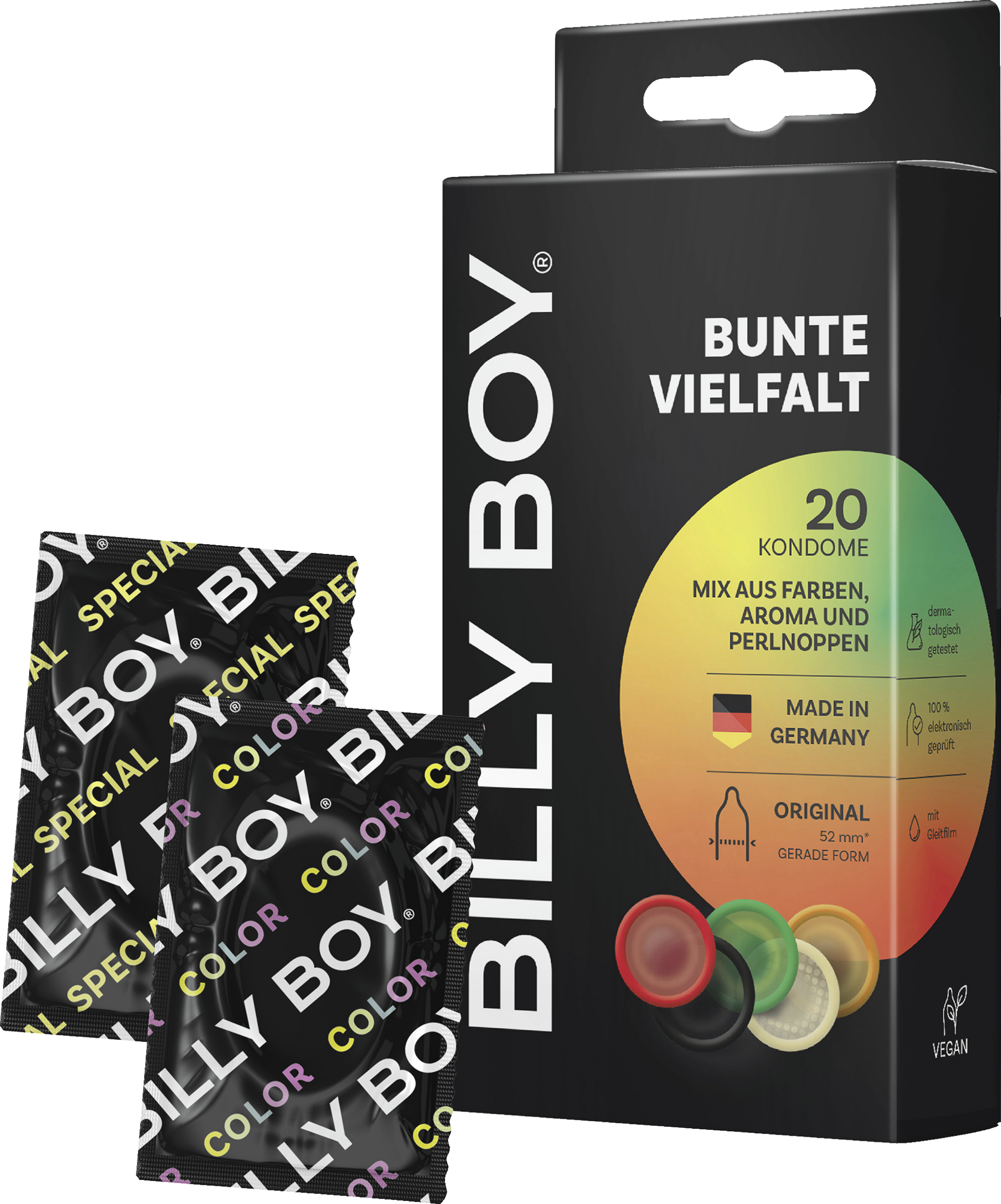 BILLY BOY - Kondome sind Medizinprodukte zur Empfängnisverhütung und zum Infektionsschutz. International anerkannte Fertigungsstandards und ständige Laboruntersuchungen sind die Grundlage für die Qualität und Sicherheit von BILLY BOY - Kondomen. Kein Verhütungsmittel kann allerdings zu 100% den Schutz vor Schwangerschaft oder Infektionskrankheiten garantieren. Kondome nie zusammen mit öl- oder fetthaltigen Gleitmitteln verwenden.