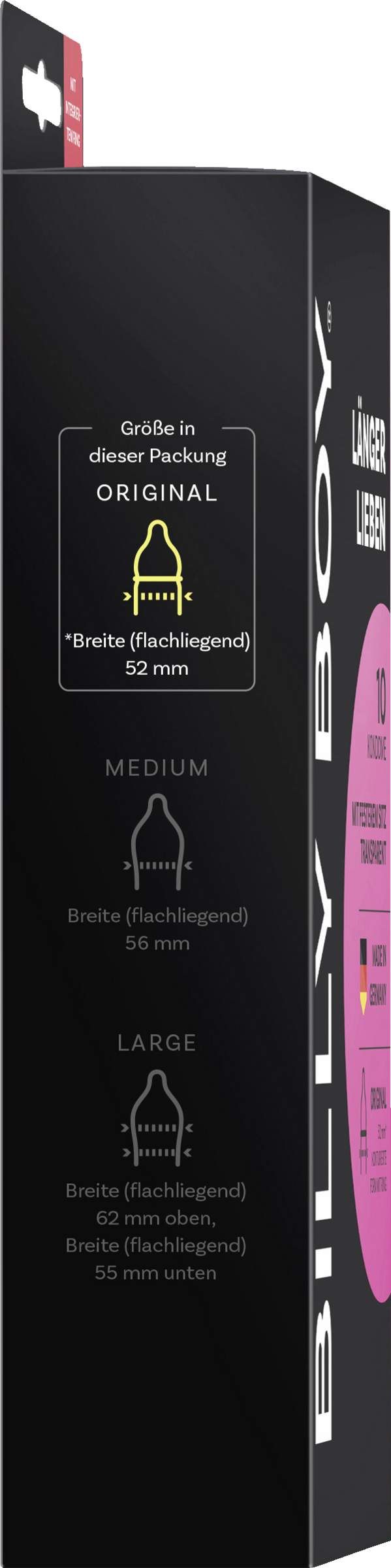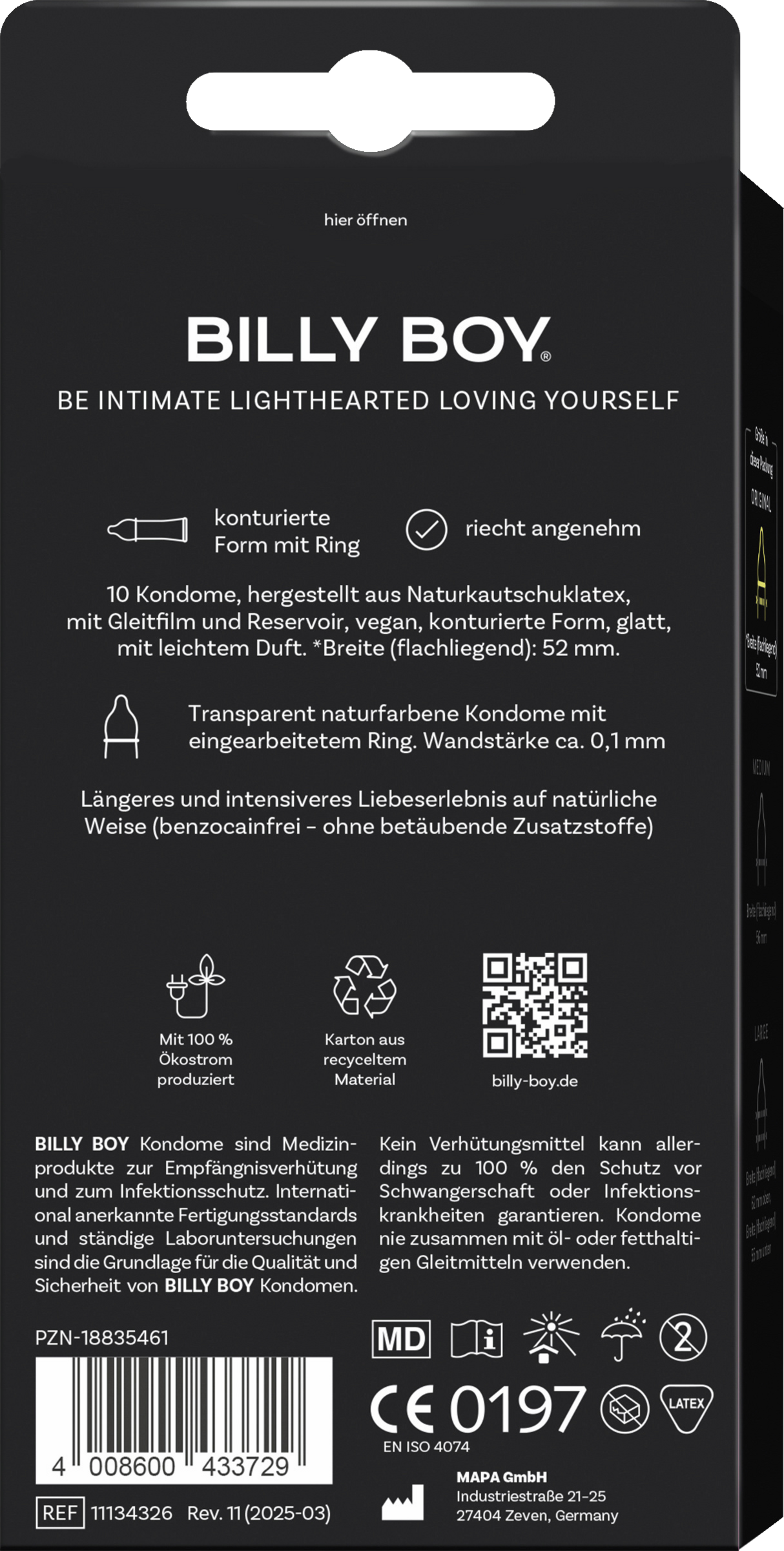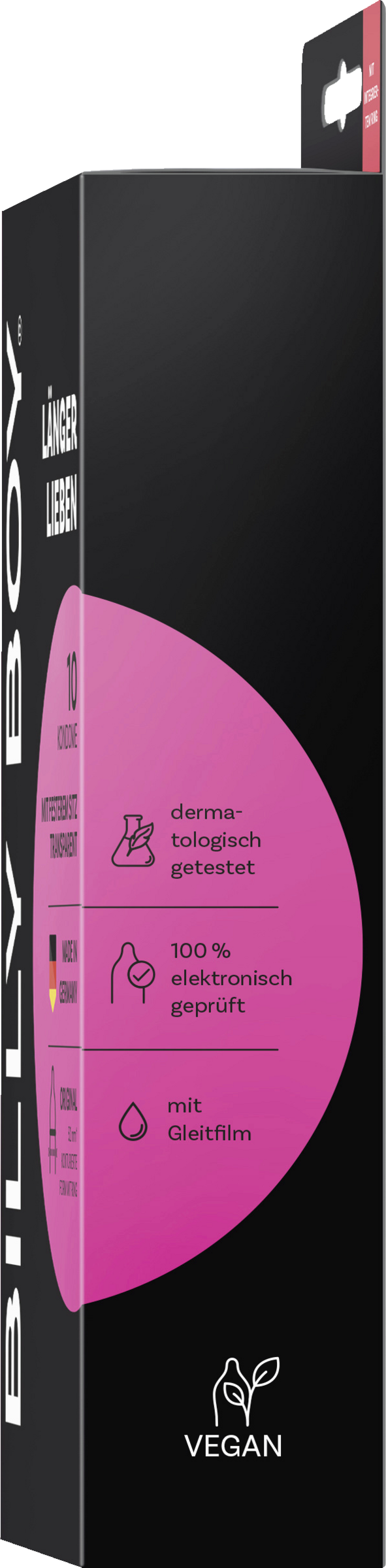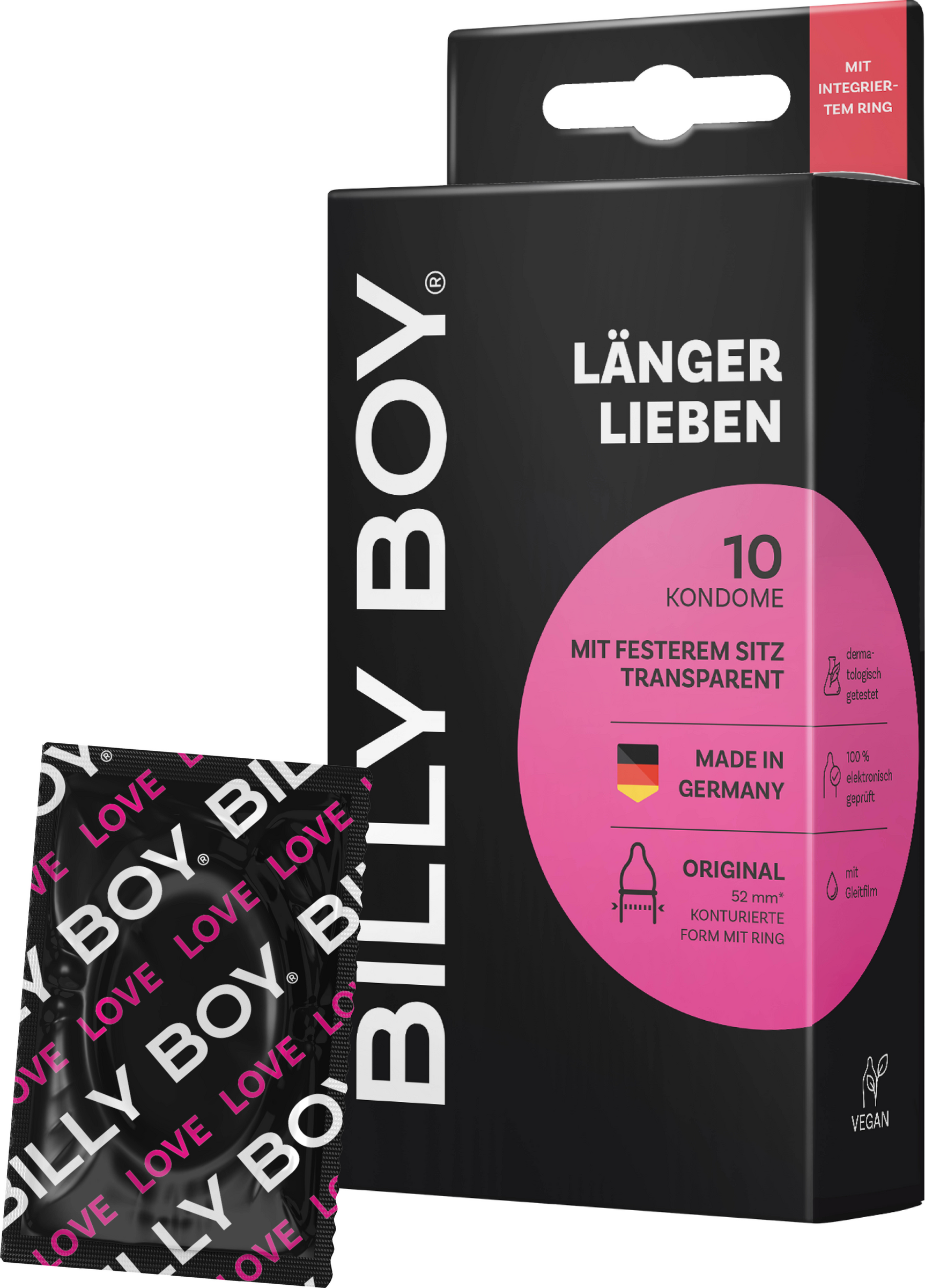 BILLY BOY - Kondome sind Medizinprodukte zur Empfängnisverhütung und zum Infektionsschutz. International anerkannte Fertigungsstandards und ständige Laboruntersuchungen sind die Grundlage für die Qualität und Sicherheit von BILLY BOY - Kondomen. Kein Verhütungsmittel kann allerdings zu 100% den Schutz vor Schwangerschaft oder Infektionskrankheiten garantieren. Kondome nie zusammen mit öl- oder fetthaltigen Gleitmitteln verwenden.
