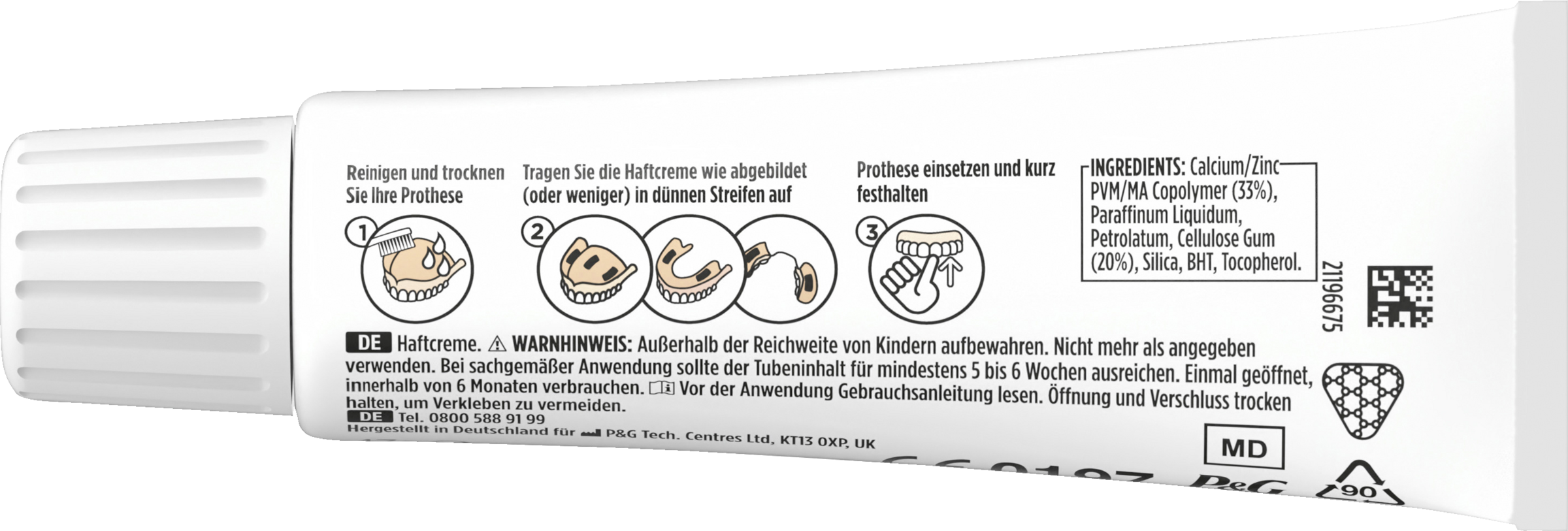 Öffnung und Verschluss trocken halten, um Verkleben zu vermeiden. Reinigen und trocknen Sie Ihre Prothese. Tragen Sie die Haftcreme wie abgebildet (oder weniger) in dünnen Streifen auf. Prothese einsetzen und kurz festhalten. Vor der Anwendung Gebrauchsanleitung lesen. Nicht mehr als angegeben verwenden. Bei sachgemäßer Anwendung sollte der Tubeninhalt für mindestens 5 bis 6 Wochen ausreichen. Einmal geöffnet, innerhalb von 6 Monaten verbrauchen.
