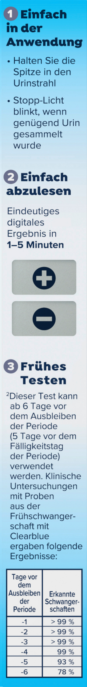 Ergebnisse 6 Tage vor dem Ausbleiben der Periode (5 Tage vor Fälligkeit der Periode). 78% der Schwangerschaften können 6 Tage vor dem Ausbleiben der Periode erkannt werden, 93% der Schwangerschaften 5 Tage vor dem Ausbleiben der Periode und 99% oder mehr 4 Tage vor dem Ausbleiben der Periode.