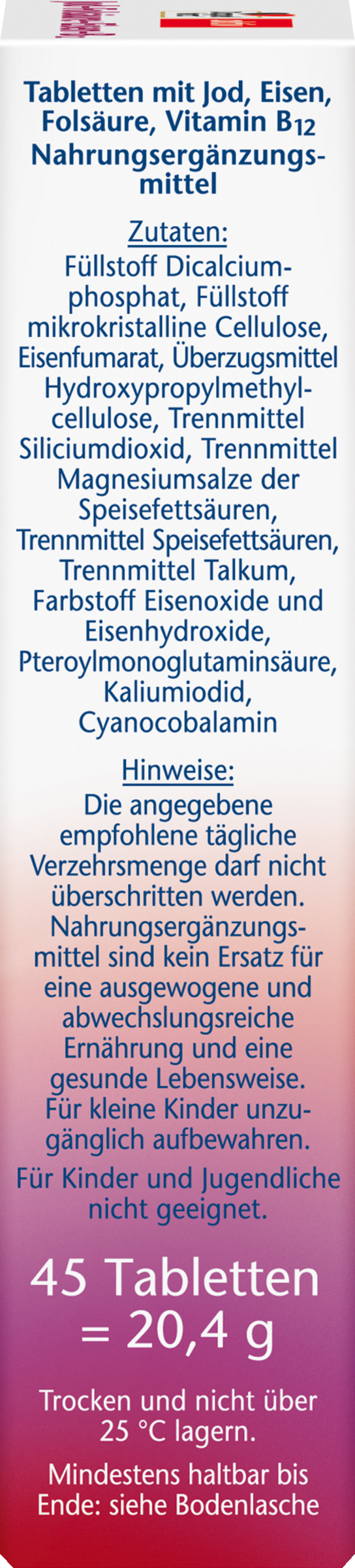 Füllstoff Dicalciumphosphat, Füllstoff mikrokristalline Cellulose, Eisenfumarat, Überzugsmittel Hydroxypropylmethylcellulose, Trennmittel Siliciumdioxid, Trennmittel Magnesiumsalze der Speisefettsäuren, Trennmittel Speisefettsäuren, Trennmittel Talkum, Farbstoff Eisenoxide und Eisenhydroxide, Pteroylmonoglutaminsäure, Kaliumiodid, Cyanocobalamin.
