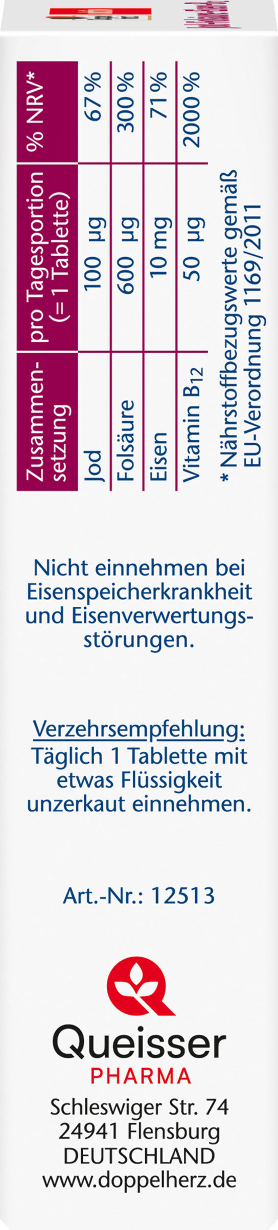 Die angegebene empfohlene tägliche Verzehrsmenge darf nicht überschritten werden. Nahrungsergänzungsmittel sind kein Ersatz für eine ausgewogene und abwechslungsreiche Ernährung und eine gesunde Lebensweise. Für Kinder und Jugendliche nicht geeignet. Nicht einnehmen bei Eisenspeicherkrankheit und Eisenverwertungsstörungen.