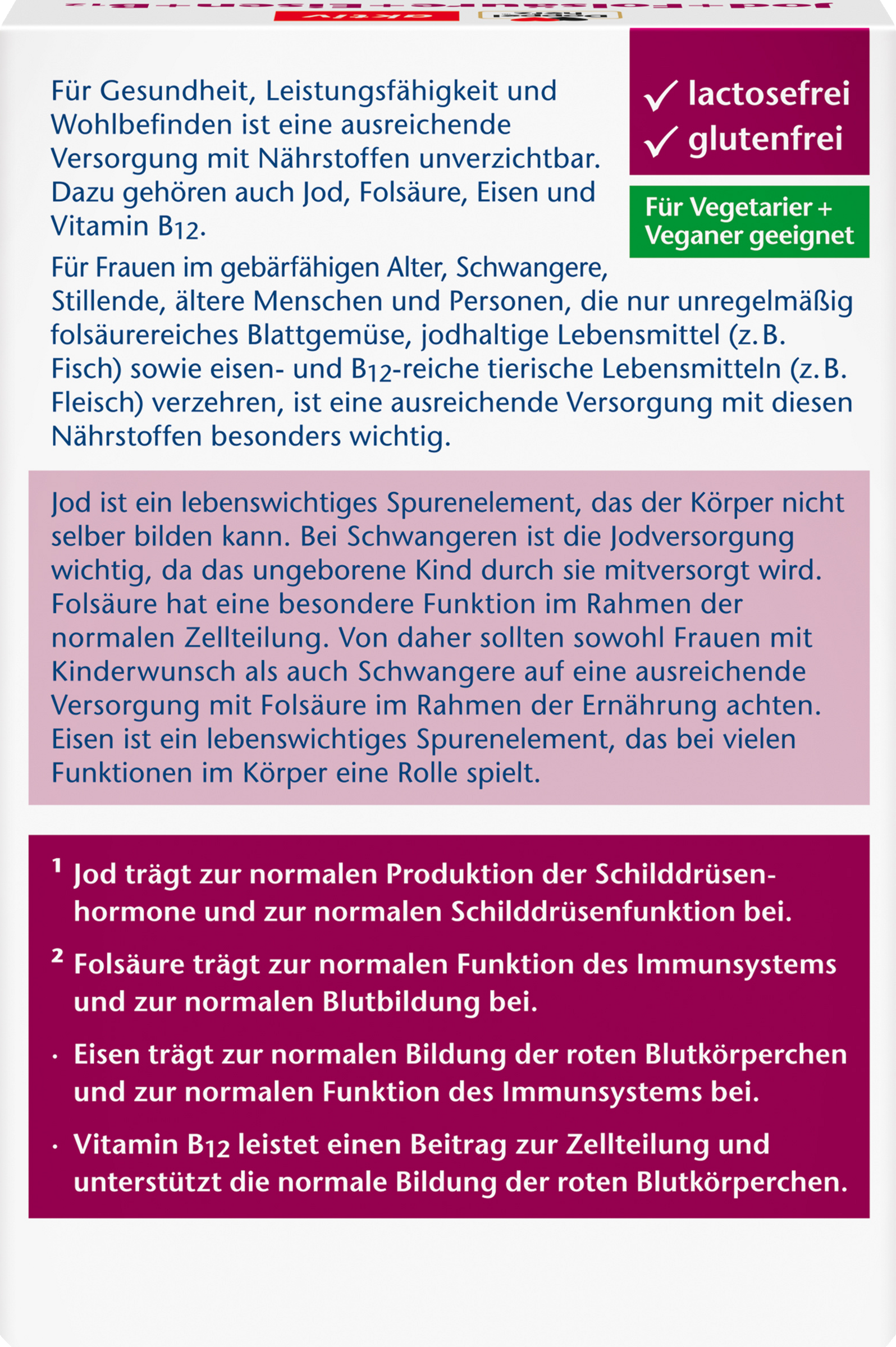 Jod ist ein lebenswichtiges Spurenelement, welches zur normalen Funktion der Schilddrüse beiträgt. Bei Schwangeren ist die Jodversorgung wichtig, da das ungeborene Kind durch sie mitversorgt werden kann. Eisen ist ein lebenswichtiges Spurenelement, das für viele Funktionen im Körper eine Rolle spielt. Eisen ist an der Bildung der roten Blutkörperchen, dem Sauerstofftransport im Blut und dem normalen Energiestoffwechsel beteiligt. Da der Körper Eisen nicht selbst bilden kann und täglich eine bestimmte Menge an Eisen verliert, ist er auf eine ausreichende Zufuhr mit der Nahrung angewiesen. In bestimmten Situationen ist der Bedarf an Eisen zudem erhöht und eine ausreichende Versorgung über die Nahrung nicht immer gegeben. Eine betont pflanzliche oder unausgewogene Ernährung kann eisenarm sein oder Bestandteile enthalten (z. B. schwarzer Tee, Kaffee), die die Eisenaufnahme stören. Folsäure hat eine besondere Funktion im Rahmen der normalen Zellteilung. Von daher sollten sowohl Frauen mit Kinderwunsch als auch Schwangere auf eine ausreichende Versorgung mit Folsäure im Rahmen der Ernährung achten. Vitamin B12 und Folsäure spielen eine Rolle bei der normalen Blutbildung und tragen zur Verringerung von Müdigkeit und Erschöpfung bei. Lebensmittel pflanzlicher Herkunft enthalten normalerweise geringe Mengen an Vitamin B12. Daher sollten Personen, die wenig oder gar keine tierischen Lebensmittel essen, besonders auf die Vitamin B12 Zufuhr achten.
