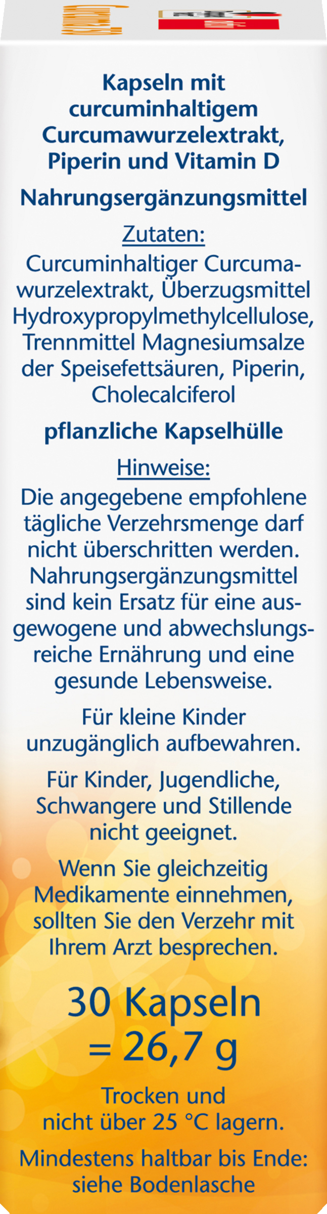 Curcuminhaltiger Curcumawurzelextrakt, Überzugsmittel Hydroxypropylmethylcellulose, Trenmittel Magnesiumsalze der Speisefettsäuren, Piperin, Cholecalciferol