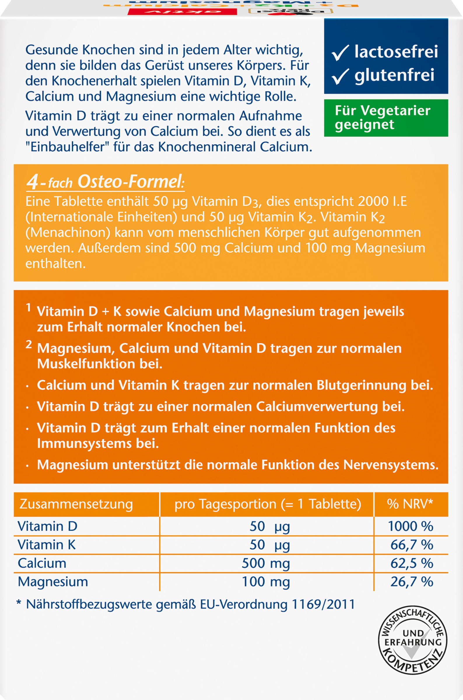 - Vitamin D + K sowie Calcium und Magnesium tragen jeweils zum Erhalt normaler Knochen bei