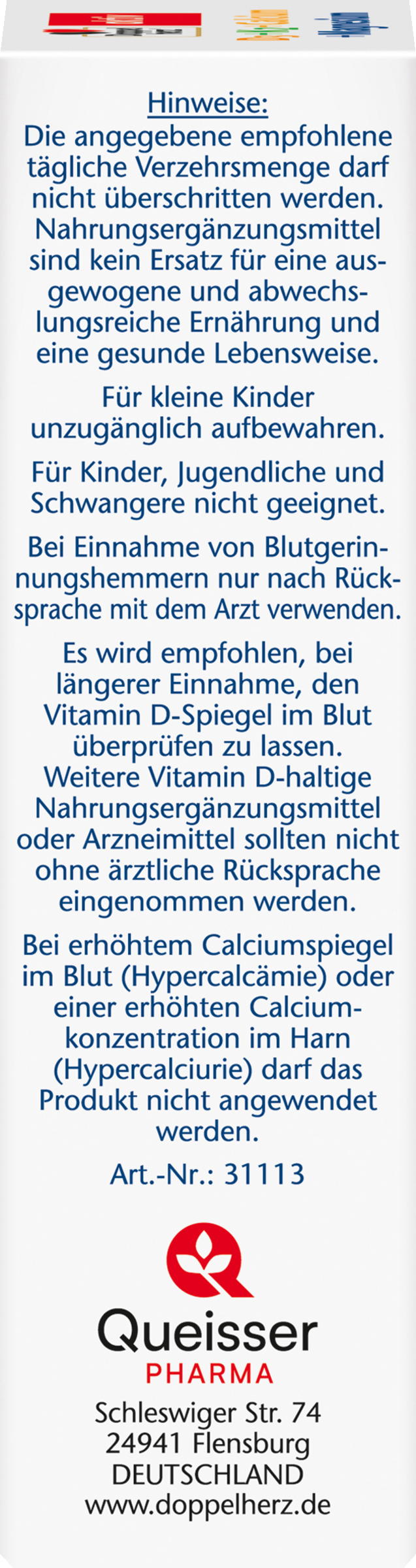 Die angegebene empfohlene tägliche Verzehrsmenge darf nicht überschritten werden. Nahrungsergänzungsmittel sind kein Ersatz für eine ausgewogene und abwechslungsreiche Ernährung und eine gesunde Lebensweise. Für kleine Kinder unzugänglich aufbewahren. Für Kinder, Jugendliche und Schwangere nicht geeignet. Bei Einnahme von Blutgerinnungshemmern nur nach Rücksprache mit dem Arzt verwenden. Es wird empfohlen, bei längerer Einnahme, den Vitamin D-Spiegel im Blut überprüfen zu lassen. Weitere Vitamin D-haltige Nahrungsergänzungsmittel oder Arzneimittel sollten nicht ohne ärztliche Rücksprache eingenommen werden. Bei erhöhtem Calciumspiegel im Blut (Hypercalcämie) oder einer erhöhten Calciumkonzentration im Harn (Hypercalciurie) darf das Produkt nicht angewendet werden.