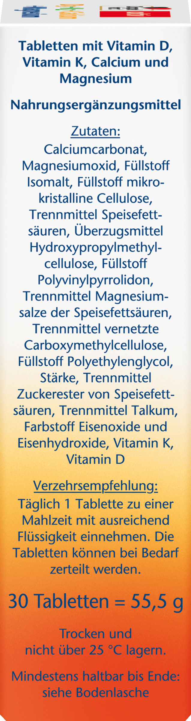 Calciumcarbonat, Magnesiumoxid, Füllstoff Isomalt, Füllstoff mikrokristalline Cellulose, Trennmittel Speisefettsäuren, Überzugsmittel Hydroxypropylmethylcellulose, Füllstoff Polyvinylpyrrolidon, Trennmittel Magnesiumsalze der Speisefettsäuren, Trennmittel vernetzte Carboxymethylcellulose, Füllstoff Polyethylenglycol, Stärke, Trennmittel Zuckerester von Speisefettsäuren, Trennmittel Talkum, Farbstoff Eisenoxide und Eisenhydroxide, Vitamin K, Vitamin D