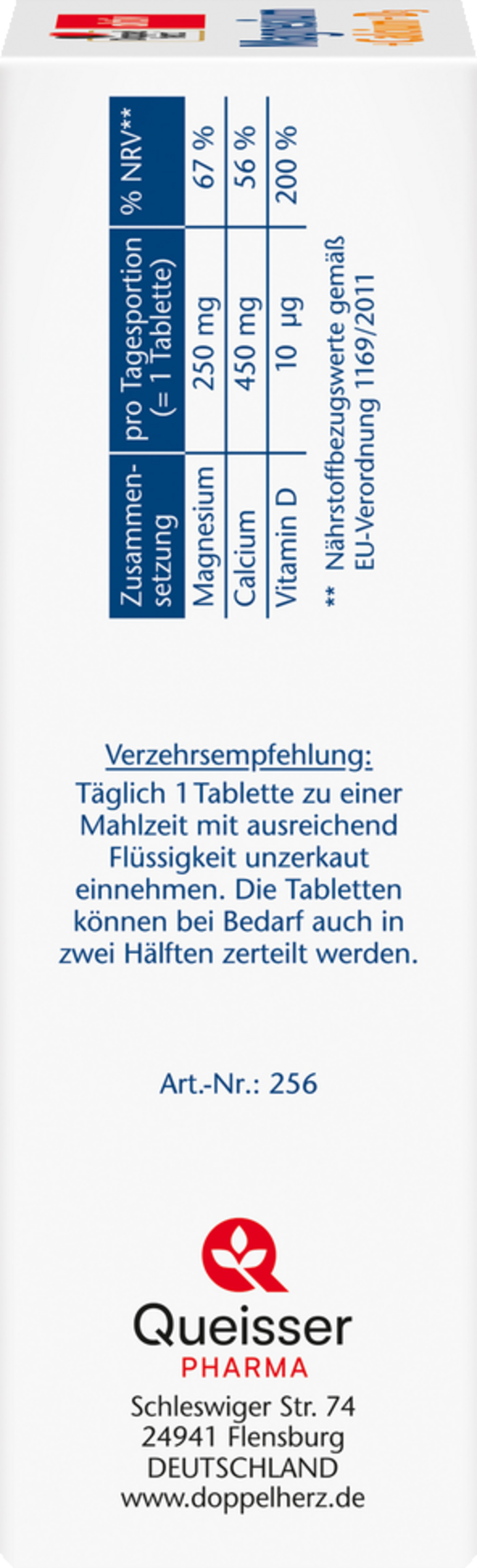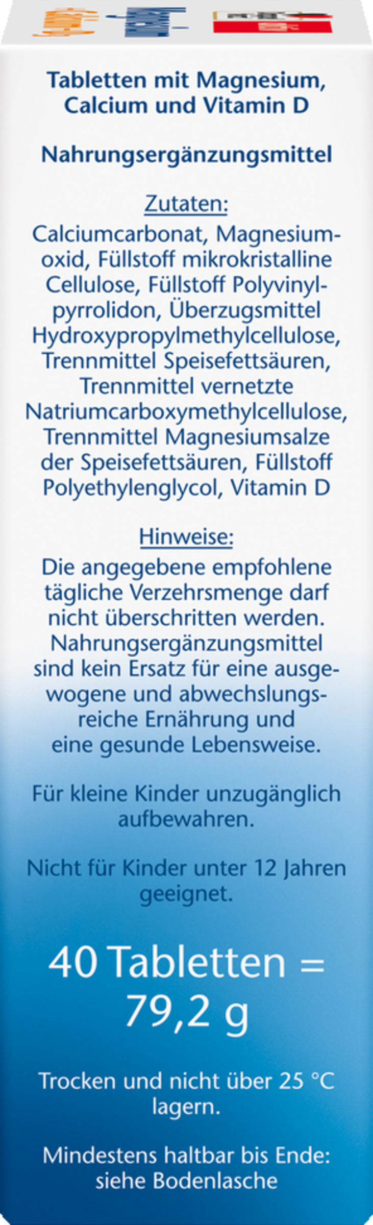 Calciumcarbonat, Magnesiumoxid, Füllstoff mikrokristalline Cellulose, Trennmittel Speisefettsäuren, Trennmittel vernetzte Carboxymethylcellulose, Überzugsmittel Hydroxypropylmethylcellulose, Trennmittel Talkum, Füllstoff Polyvinylpyrrolidon, Trennmittel Magnesiumsalze der Speisefettsäuren, Farbstoff Titandioxid, Überzugsmittel Hydroxypropylcellulose, Kokosöl, Cholecalciferol