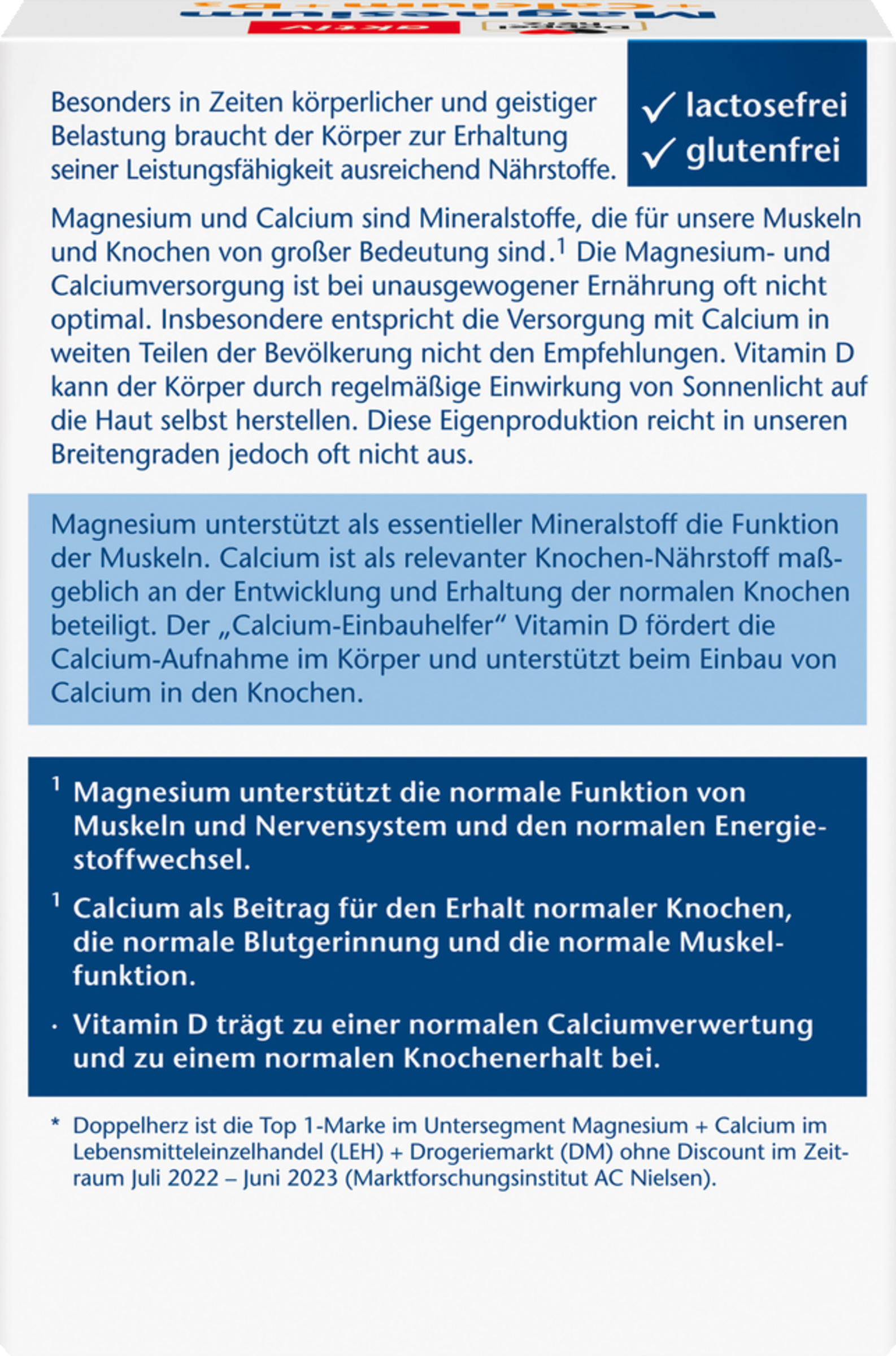Magnesium und Calcium sind Mineralstoffe, die einen Beitrag zum normalen Knochenerhalt und zur Muskelfunktion leisten. Der "Calcium-Einbauhelfer" Vitamin D trägt zu einer normalen Verwertung von Calcium, zum normalen Knochenerhalt und zur normalen Muskelfunktion bei.