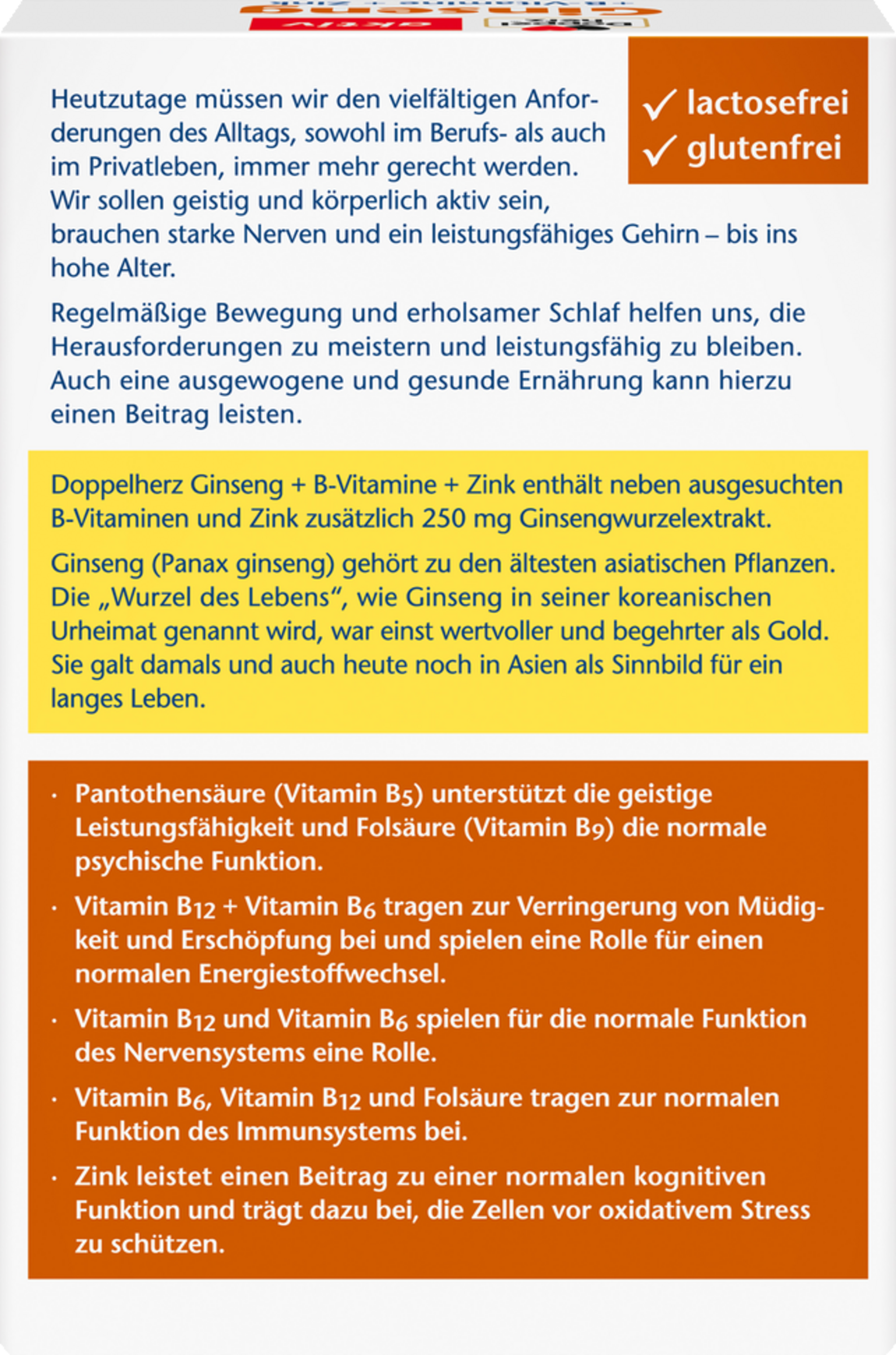 Doppelherz Ginseng + B-Vitamine + Zink enthält neben ausgesuchten B-Vitaminen und Zink zusätzlich 250 mg Ginsengwurzelextrakt. Ginseng (Panax ginseng) gehört zu den ältesten asiatischen Pflanzen. Die „Wurzel des Lebens“, wie Ginseng in seiner koreanischen Urheimat genannt wird, war einst wertvoller und begehrter als Gold. Sie galt damals und auch heute noch in Asien als Sinnbild für ein langes Leben.