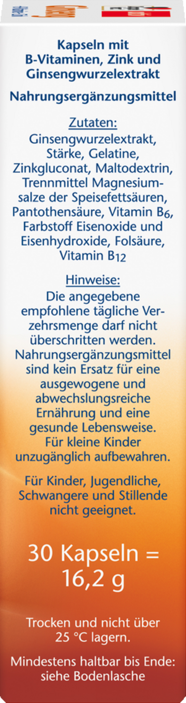 Ginsengwurzelextrakt, Stärke, Gelatine, Zinkgluconat, Maltodextrin, Trennmittel Magnesiumsalze der Speisefettsäuren, Calcium-D-pantothenat, Pyridoxinhydrochlorid, Farbstoff Eisenoxide und Eisenhydroxide, Pteroylmonoglutaminsäure, Cyanocobalamin