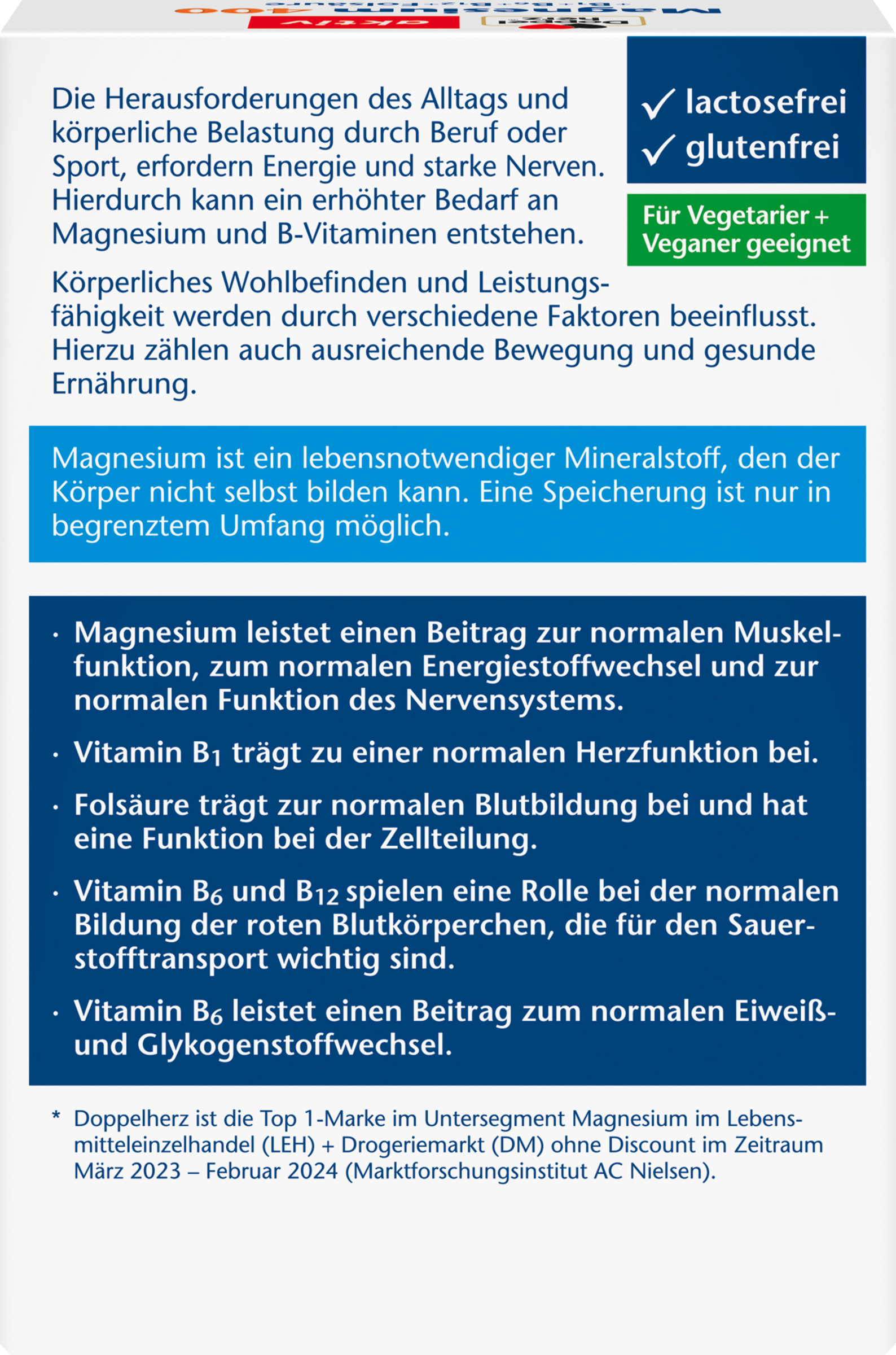 Die Tabletten von Doppelherz enthalten 400 mg Magnesium in sinnvoller Kombination mit den Vitaminen B1, B6, B12 und Folsäure.