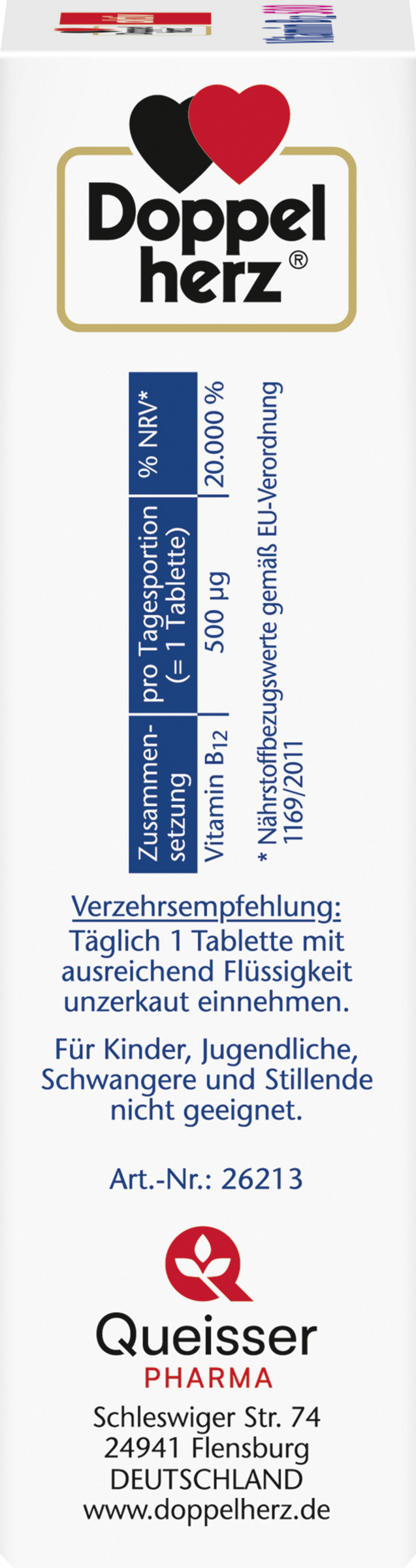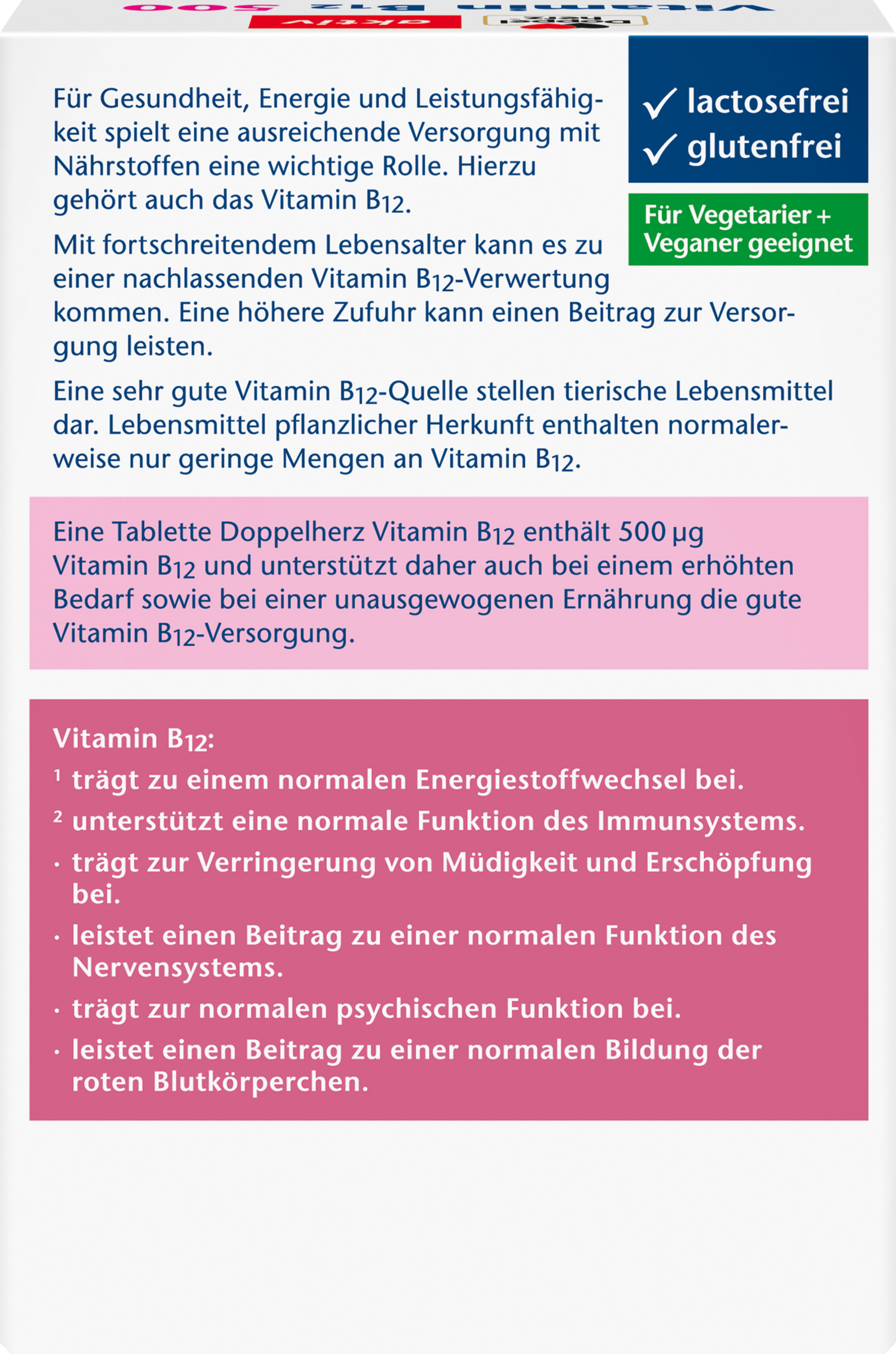 Mit fortschreitendem Lebensalter kann es zu einer nachlassenden Vitamin B12-Verwertung kommen. Eine höhere Zufuhr kann einen Beitrag zur Versorgung leisten. Eine sehr gute Vitamin B12-Quelle stellen tierische Lebensmittel dar. Lebensmittel pflanzlicher Herkunft enthalten normalerweise nur geringe Mengen an Vitamin B12.Eine Tablette Doppelherz Vitamin B12 enthält 500 μg Vitamin B12 und unterstützt daher auch bei einem erhöhten Bedarf sowie bei einer unausgewogenen Ernährung die gute Vitamin B12-Versorgung.