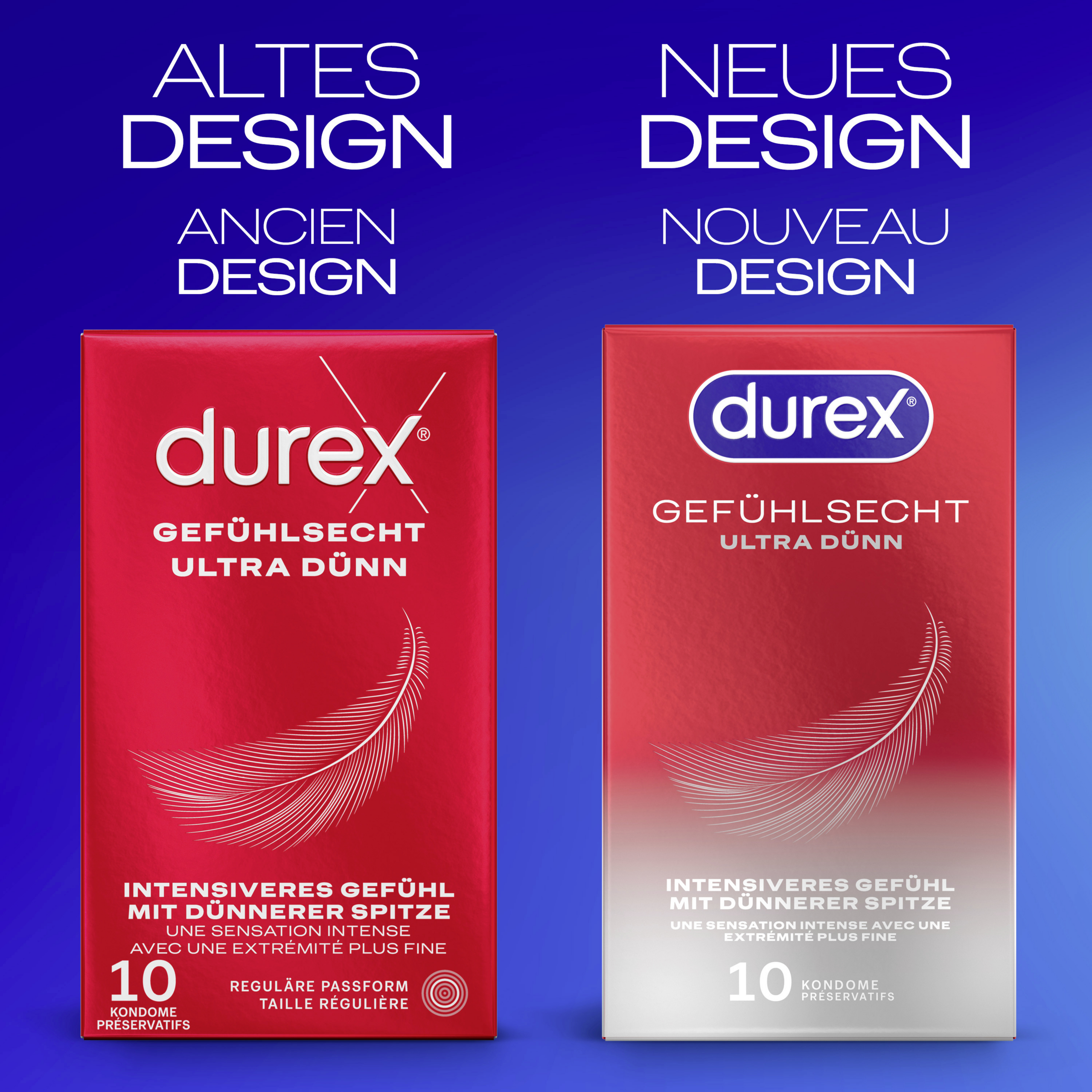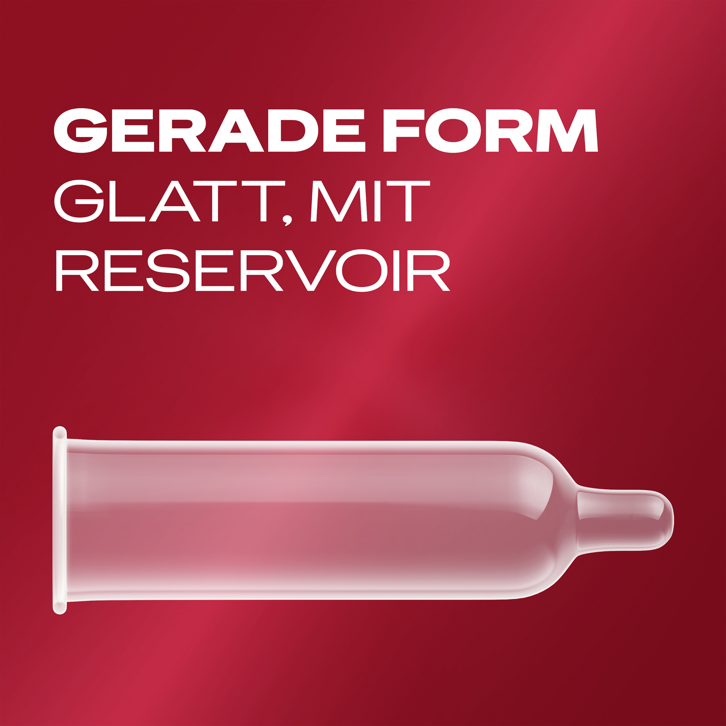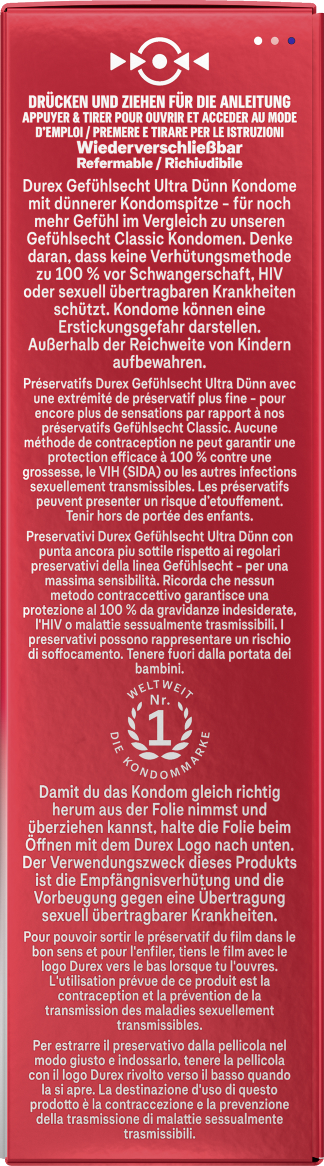 Die Durex Gefühlsecht Ultra Kondome sind an der Spitze noch dünner – für noch mehr Gefühl. Sie haben eine nominale Breite von 54 mm (reguläre Passform) und sind mit Silikongleitgel befeuchtet – so wird der Sex für euch noch angenehmer. Die glatte, gerade Form mit Reservoir sorgt für einen komfortablen Sitz. Dank der neuen Formel mit speziellen Inhaltsstoffen riechen die Kondome außerdem angenehm. Damit ihr auch immer gut geschützt seid, ist es wichtig, die richtige Kondomgröße zu verwenden. Ein zu großes Kondom kann abrutschen, ein zu kleines Kondom kann platzen. Denn jeder Mensch ist anders, aber ein Kondom sollte für alle stets bequem und sicher sein. Durex Kondome durchlaufen 5 Qualitätstests und sind dermatologisch getestet. Zudem ist jedes einzelne Kondom zu 100 % elektronisch geprüft.