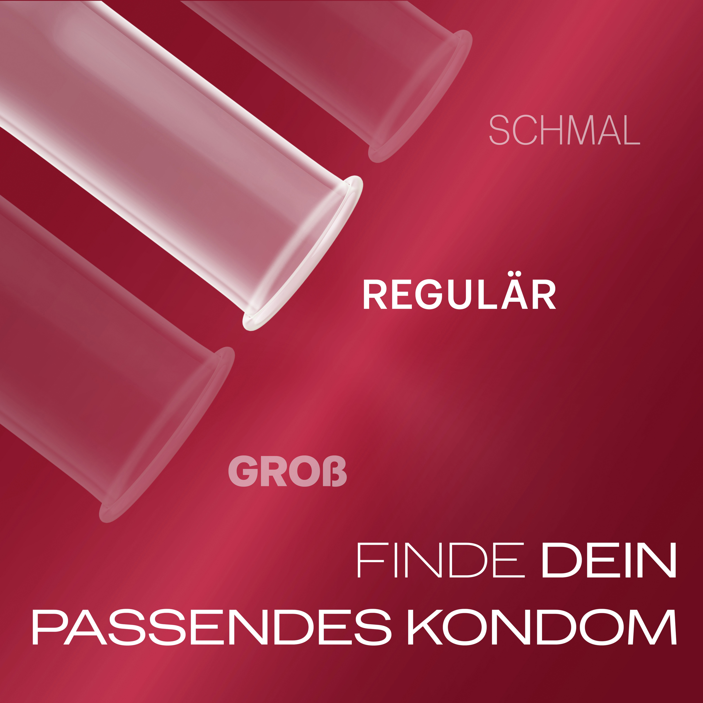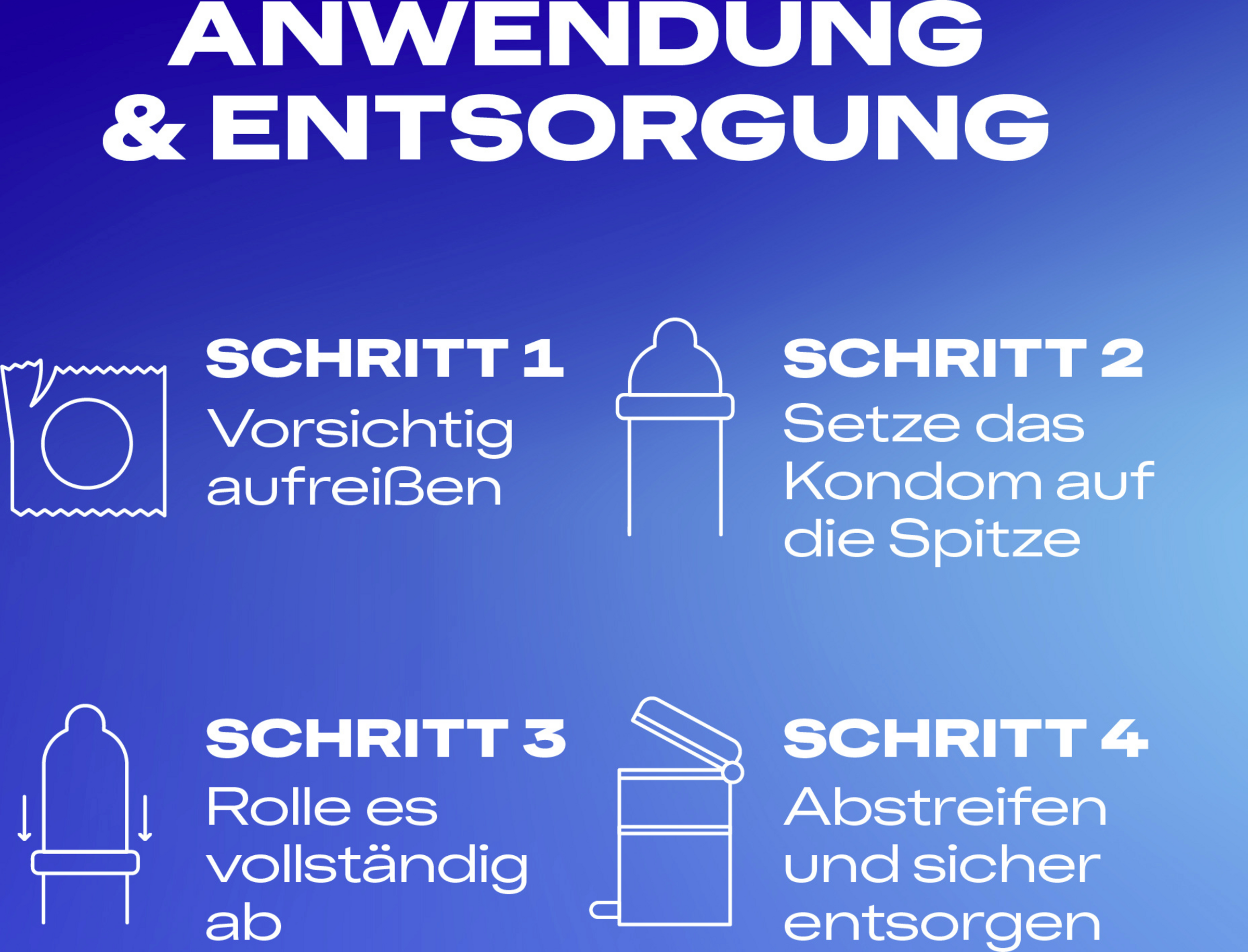 Bitte beachte die Informationen auf der Innenseite dieser Packung, insbesondere, wenn du Kondome für Anal- oder Oralsex benutzt. Denke daran, dass keine Verhütungsmethode zu 100 % vor Schwangerschaft, HIV oder sexuell übertragbaren Krankheiten schützt. Kondome können eine Erstickungsgefahr darstellen. Außerhalb der Reichweite von Kindern aufbewahren. Überprüfe vor der Verwendung das Verfallsdatum auf der Verpackung. Ist die Kondomfolie offensichtlich beschädigt, wirf das Kondom weg und benutze ein neues aus einer unbeschädigten Verpackung. Benutze jedes Kondom nur einmal. Eine Wiederverwendung erhöht das Risiko einer Beschädigung oder Infektion.
