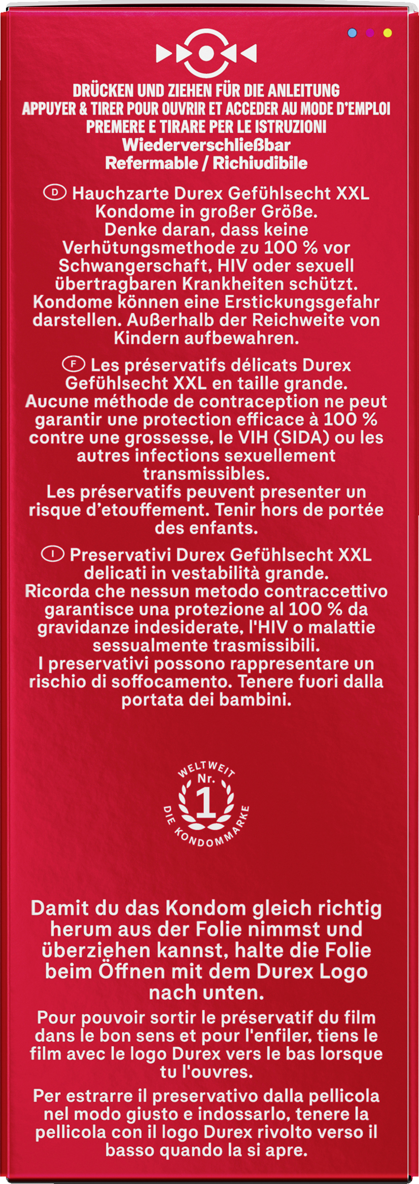 Bitte die Anwendungshinweise auf der Packung vor der Verwendung sorgfältig durchlesen. Damit du das Kondom gleich richtig herum aus der Folie nimmst und überziehen kannst, halte die Folie beim Öffnen mit dem Durex Logo nach unten. Benutze nur Gleitmittel, die für die Verwendung mit Kondomen empfohlen werden – das Gel wird einfach außen auf das bereits angelegte Kondom aufgetragen.