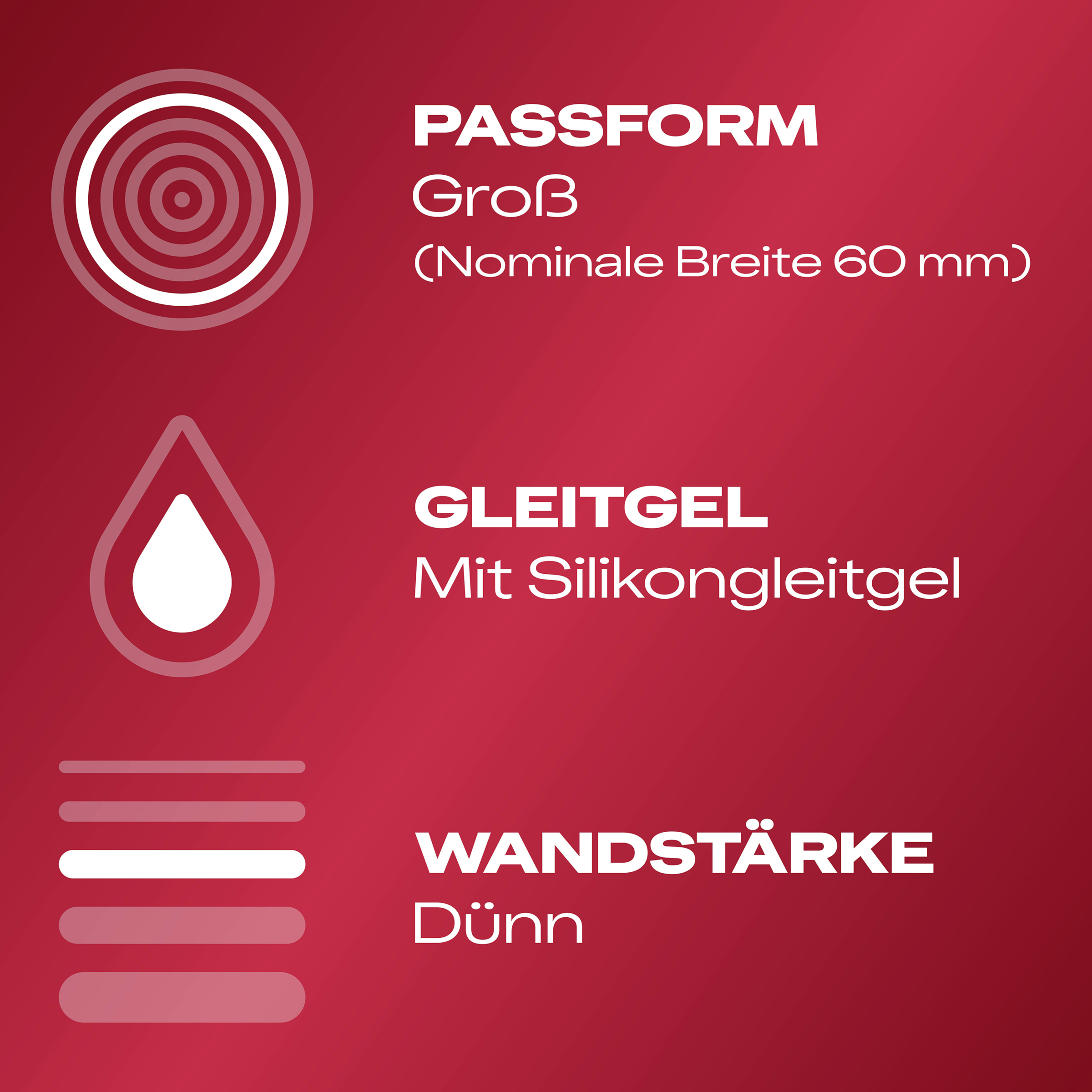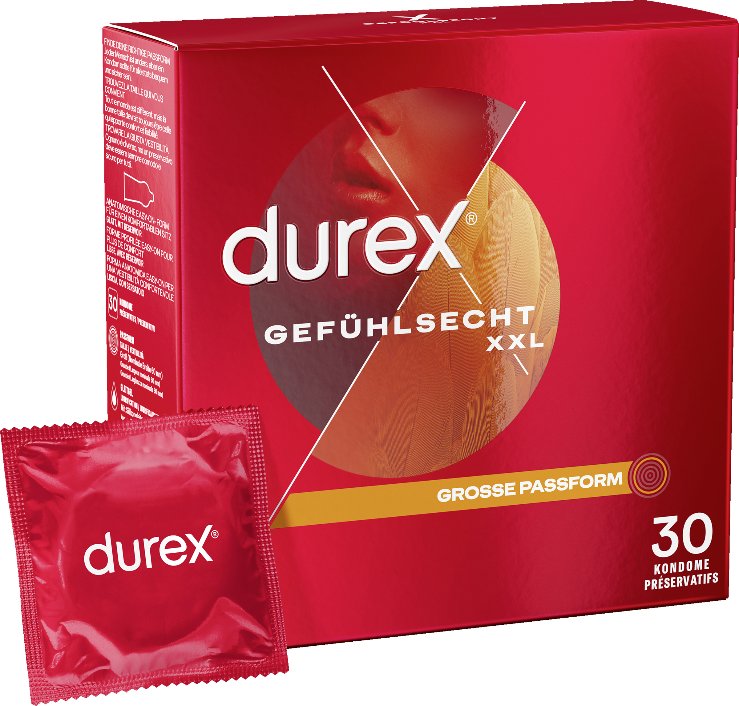 Die Gefühlsecht XXL Kondome sind dünn für ein intensives Gefühl und haben eine nominale Breite von 60 mm (große Passform).