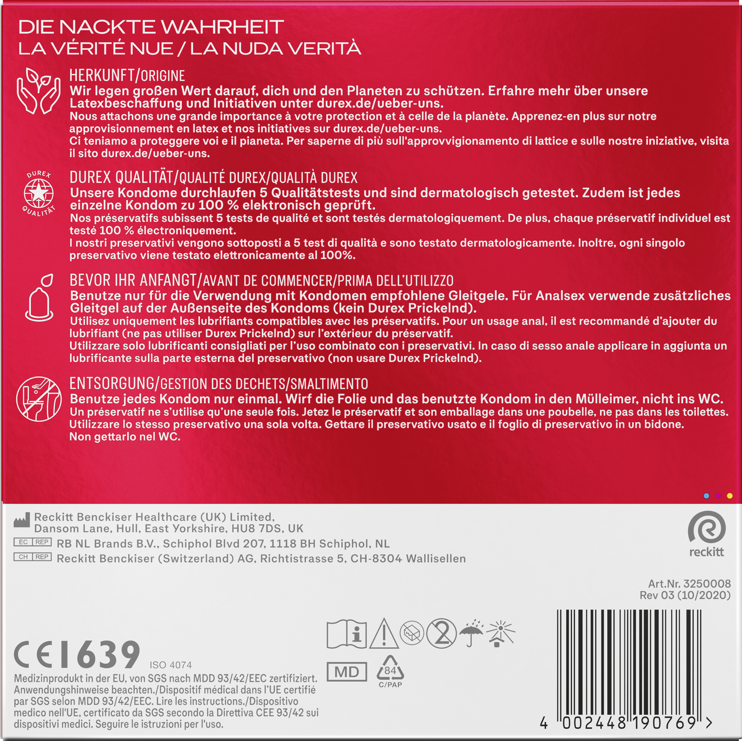 Bitte beachte die Informationen auf der Innenseite dieser Packung, insbesondere, wenn du Kondome für Anal- oder Oralsex benutzt. Denke daran, dass keine Verhütungsmethode zu 100 % vor Schwangerschaft, HIV oder sexuell übertragbaren Krankheiten schützt. Kondome können eine Erstickungsgefahr darstellen. Außerhalb der Reichweite von Kindern aufbewahren. Überprüfe vor der Verwendung das Verfallsdatum auf der Verpackung. Ist die Kondomfolie offensichtlich beschädigt, wirf das Kondom weg und benutze ein neues aus einer unbeschädigten Verpackung. Benutze jedes Kondom nur einmal. Eine Wiederverwendung erhöht das Risiko einer Beschädigung oder Infektion.