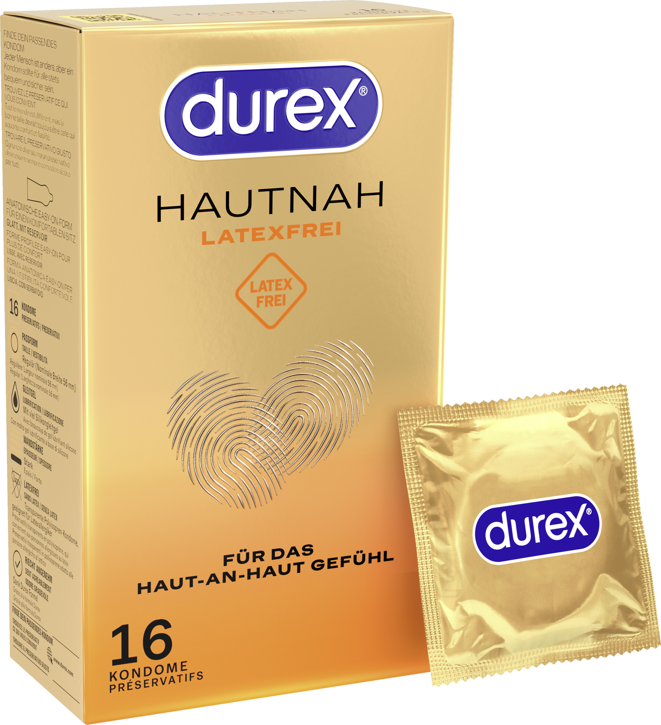 Die Durex Hautnah Latexfrei Kondome sind aus Polyisopren gefertigt - für ein natürliches Haut-an-Haut-Gefühl. Durch die Befeuchtung mit viel Silikongleitgel wird der Sex für euch noch angenehmer. Die Kondome sind transparent und haben eine anatomische Easy-On-Form, wodurch sie bequem sitzen. Die nominale Breite beträgt 56 mm (reguläre Passform). 100 % aller Durex Kondome sind elektronisch geprüft. Zudem durchläuft jede Charge fünf Qualitätstests. Damit ihr auch immer gut geschützt seid, ist es wichtig, die richtige Kondomgröße zu verwenden. Ein zu großes Kondom kann abrutschen, ein zu kleines Kondom kann platzen. Jeder Mensch ist anders, aber ein Kondom sollte für alle stets bequem und sicher sein. Damit du das Kondom gleich richtig herum aus der Folie nimmst und überziehen kannst, halte die Folie beim Öffnen mit dem Durex Logo nach unten.