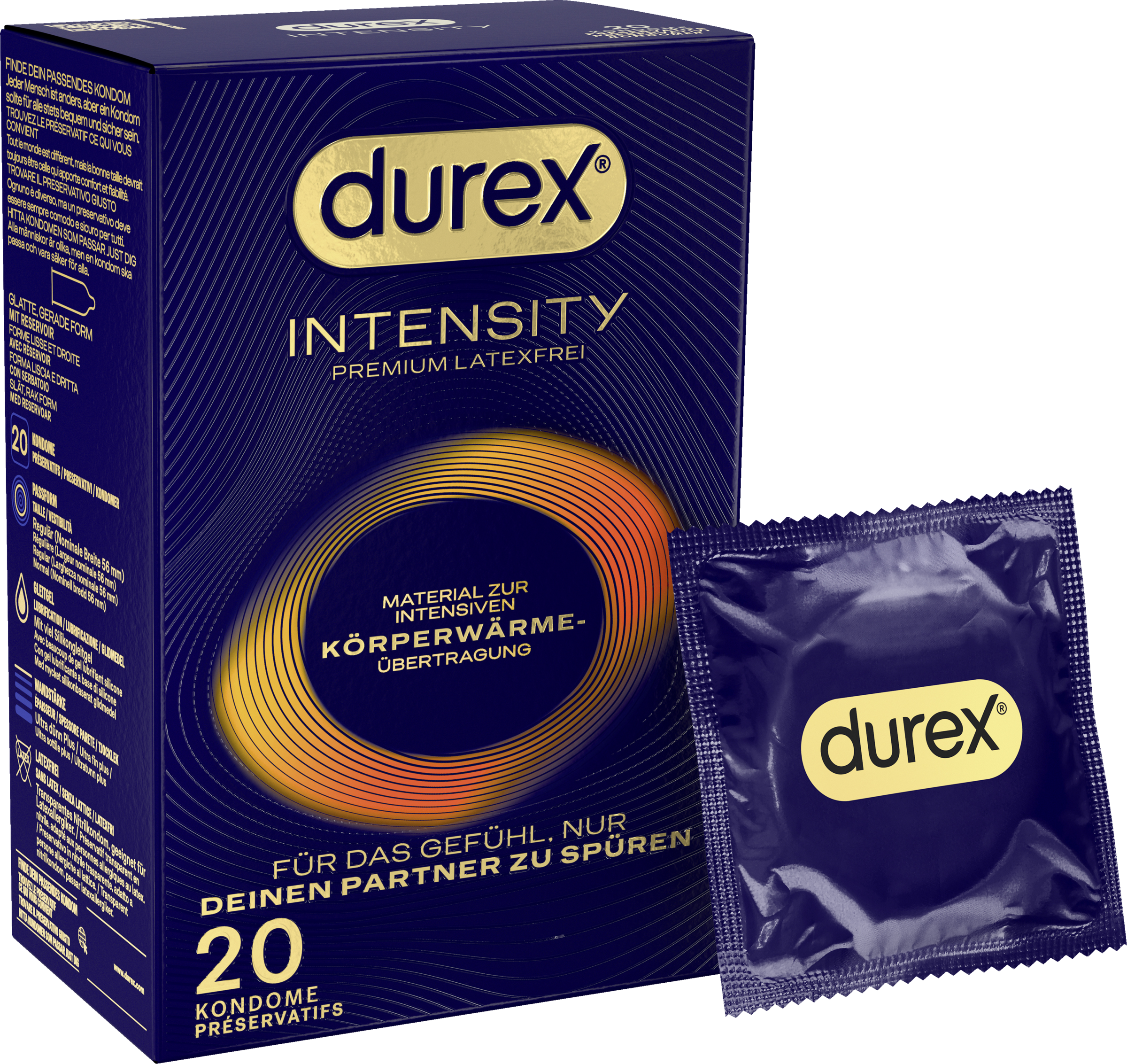 Die latexfreien Durex Intensity Kondome sind die dünnsten Kondome (ultra dünn plus) von Durex und aus Nitril gefertigt – für eine intensive Körperwärmeübertragung und das Gefühl, nur deinen Partner zu spüren. Durch die Befeuchtung mit viel Silikongleitgel wird der Sex für euch noch angenehmer. Die Kondome sind transparent, haben eine gerade Form und eine nominale Breite von 56 mm (reguläre Passform). Damit ihr auch immer gut geschützt seid, ist es wichtig, die richtige Kondomgröße zu verwenden. Ein zu großes Kondom kann abrutschen, ein zu kleines Kondom kann platzen. Jeder Mensch ist anders, aber ein Kondom sollte für alle stets bequem und sicher sein. 100 % aller Durex Kondome sind elektronisch geprüft. Zudem durchläuft jede Charge fünf Qualitätstests.