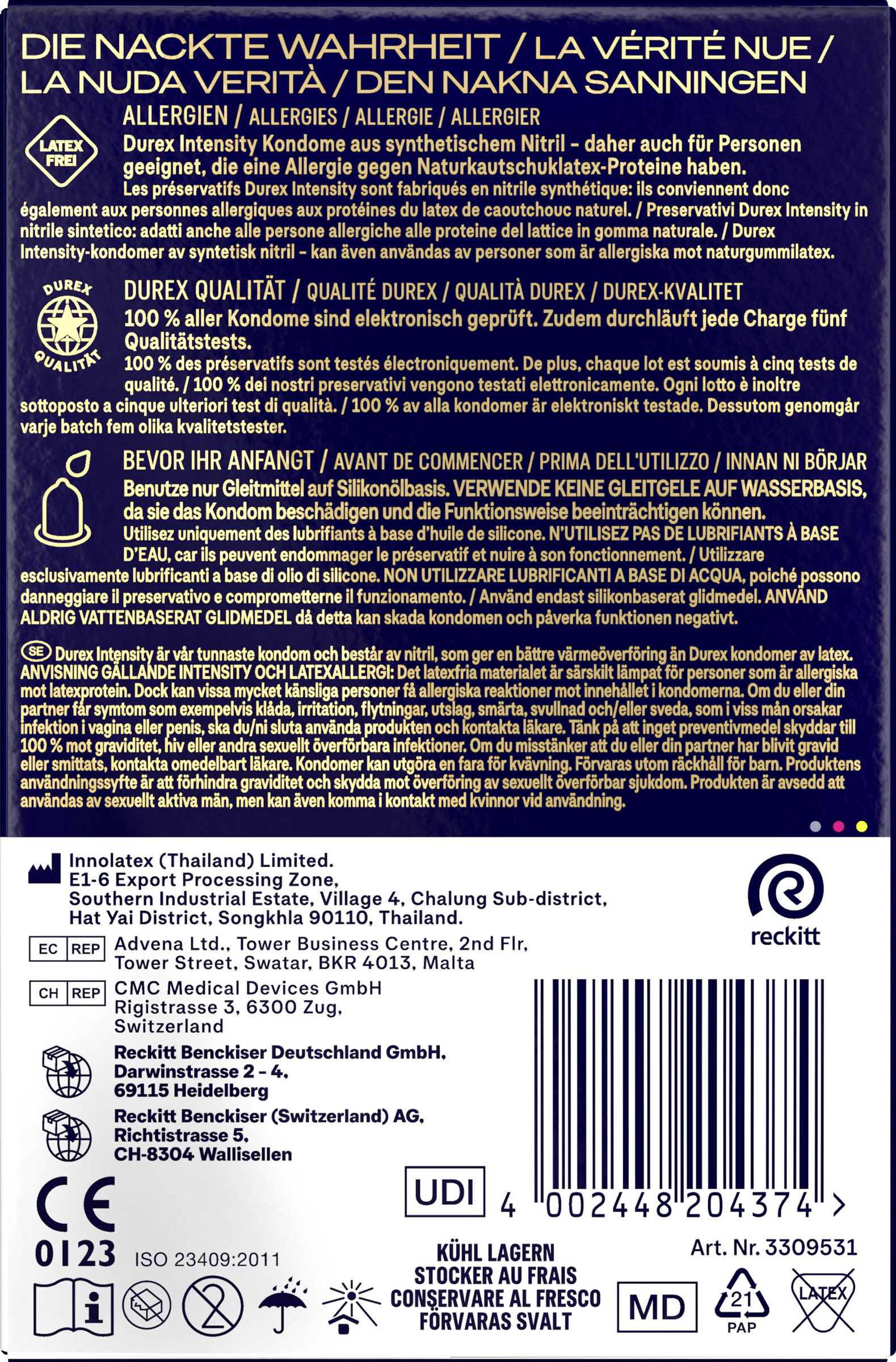 HINWEISE ZU INTENSITY UND LATEXALLERGIEN: Dieses latexfreie Material ist speziell für Personen geeignet, die allergisch gegen Latexproteine sind. Dennoch kann es bei einigen sehr empfindlichen Menschen zu allergischen Reaktionen auf die Inhaltsstoffe der Kondome kommen. Wenn bei dir oder deinem Partner Juckreiz, Reizungen, Ausfluss, Ausschlag, Schmerzen, Schwellungen und/oder Brennen auftreten, die in gewissem Maße eine Infektion der Vagina oder des Penis verursachen, Anwendung einstellen und Arzt aufsuchen. Denke daran, dass keine Verhütungsmethode zu 100 % vor Schwangerschaft, HIV oder sexuell übertragbaren Krankheiten schützt. Bei der Vermutung, dass du oder deine Partnerin schwanger geworden ist oder sich infiziert hat, kontaktiere sofort einen Arzt. Kondome können eine Erstickungsgefahr darstellen. Außerhalb der Reichweite von Kindern aufbewahren. Verwende nur Gleitmittel auf Silikonölbasis. VERWENDE KEINE GLEITMITTEL AUF WASSERBASIS, da sie das Kondom beschädigen und die Funktionsweise beeinträchtigen können. Einige topische Medikamente, die auf den Penis oder die Vagina aufgetragen werden, können Kondome beschädigen. STOPPE DIE BENUTZUNG: Wenn du während der Benutzung Unwohlsein oder Reizungen verspürst. Nicht wiederverwenden. Bei beschädigter Verpackung nicht verwenden.