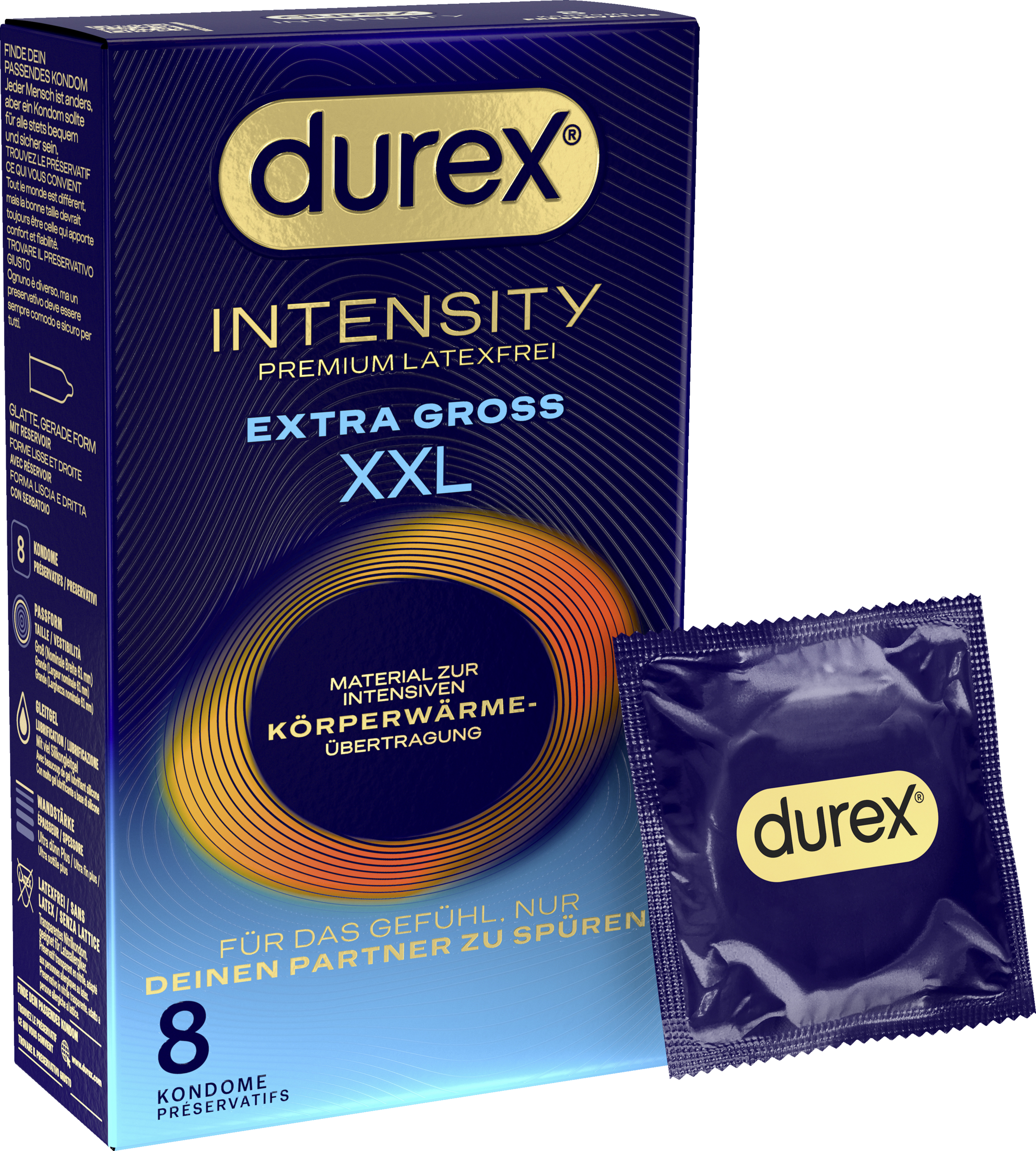 Die latexfreien Durex Intensity Kondome sind unsere dünnsten Kondome (ultra dünn plus) und aus Nitril gefertigt - für eine intensive Körperwärmeübertragung und das Gefühl, nur deinen Partner zu spüren. Durch die Befeuchtung mit viel Silikongleitgel wird der Sex für euch noch angenehmer. Die Kondome sind transparent, haben eine gerade Form und eine nominale Breite von 56 mm (reguläre Passform). Damit ihr auch immer gut geschützt seid, ist es wichtig, die richtige Kondomgröße zu verwenden. Ein zu großes Kondom kann abrutschen, ein zu kleines Kondom kann platzen. Jeder Mensch ist anders, aber ein Kondom sollte für alle stets bequem und sicher sein. 100 % aller Durex Kondome sind elektronisch geprüft. Zudem durchläuft jede Charge fünf Qualitätstests. Damit du das Kondom gleich richtig herum aus der Folie nimmst und überziehen kannst, halte die Folie beim Öffnen mit dem Durex Logo nach unten.