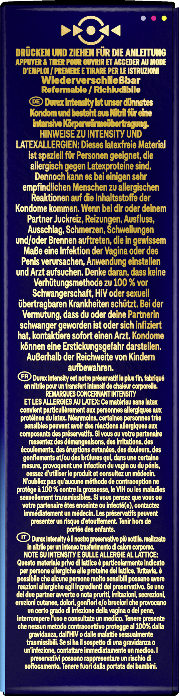 HINWEISE ZU INTENSITY UND LATEXALLERGIEN: Dieses latexfreie Material ist speziell für Personen geeignet, die allergisch gegen Latexproteine sind. Dennoch kann es bei einigen sehr empfindlichen Menschen zu allergischen Reaktionen auf die Inhaltsstoffe der Kondome kommen. Wenn bei dir oder deinem Partner Juckreiz, Reizungen, Ausfluss, Ausschlag, Schmerzen, Schwellungen und/oder Brennen auftreten, die in gewissem Maße eine Infektion der Vagina oder des Penis verursachen, Anwendung einstellen und Arzt aufsuchen. Denke daran, dass keine Verhütungsmethode zu 100 % vor Schwangerschaft, HIV oder sexuell übertragbaren Krankheiten schützt. Bei der Vermutung, dass du oder deine Partnerin schwanger geworden ist oder sich infiziert hat, kontaktiere sofort einen Arzt. Kondome können eine Erstickungsgefahr darstellen. Außerhalb der Reichweite von Kindern aufbewahren. Verwende nur Gleitmittel auf Silikonölbasis. VERWENDE KEINE GLEITMITTEL AUF WASSERBASIS, da sie das Kondom beschädigen und die Funktionsweise beeinträchtigen können. Einige topische Medikamente, die auf den Penis oder die Vagina aufgetragen werden, können Kondome beschädigen. STOPPE DIE BENUTZUNG: Wenn du während der Benutzung Unwohlsein oder Reizungen verspürst. Nicht wiederverwenden. Bei beschädigter Verpackung nicht verwenden.