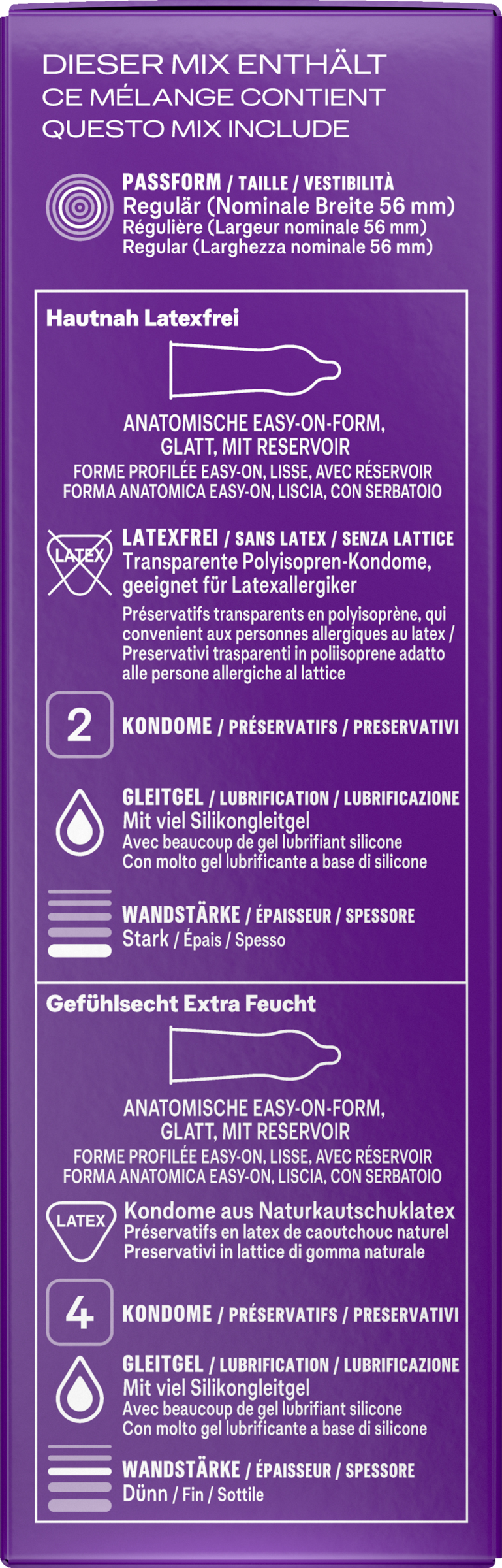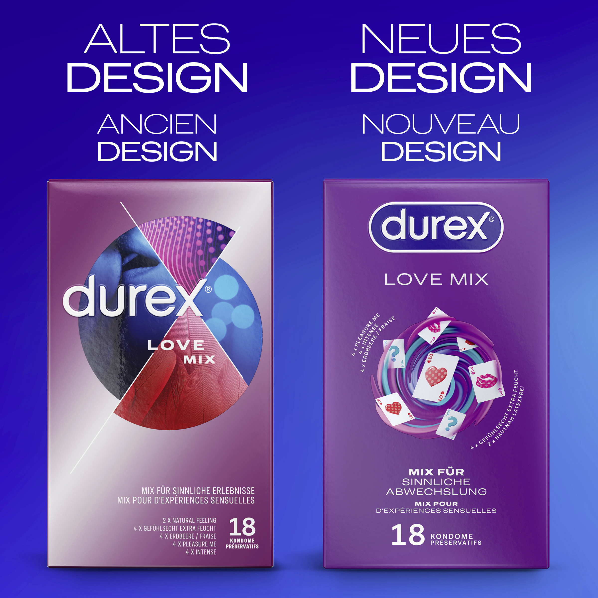 Manchmal macht es Spaß, etwas Neues auszuprobieren! Entdecke den Durex Love Mix mit extra dünnen Kondomen, hauchzarten und extra befeuchteten Kondomen, Kondomen mit Erdbeergeschmack, gerippten & genoppten Kondomen sowie gerippten & genoppten Kondomen mit stimulierendem Gel. Dieser Mix enthält Kondome mit unterschiedlichen Größen und Passformen (Größe ca. 52 + 56 mm). Verwende stets das Kondom, das sich für dich bequem und sicher anfühlt, mit der Größe, die zu dir passt.,