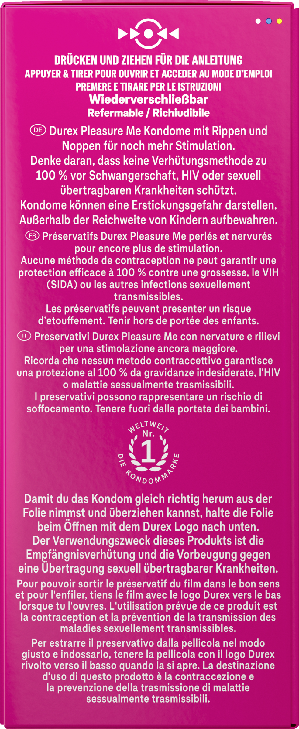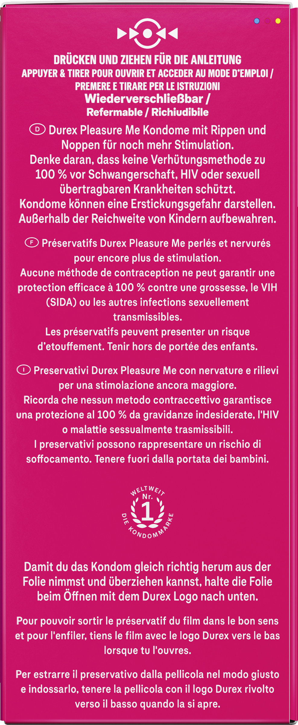 Durex Pleasure Me Kondome sind gerippt und genoppt, um für eine besonders sinnliche sexuelle Stimulation zu sorgen.ntensive Empfindungen für sie und damit extra Vergnügen auch für ihn – ohne Abstriche bei der Sicherheit.