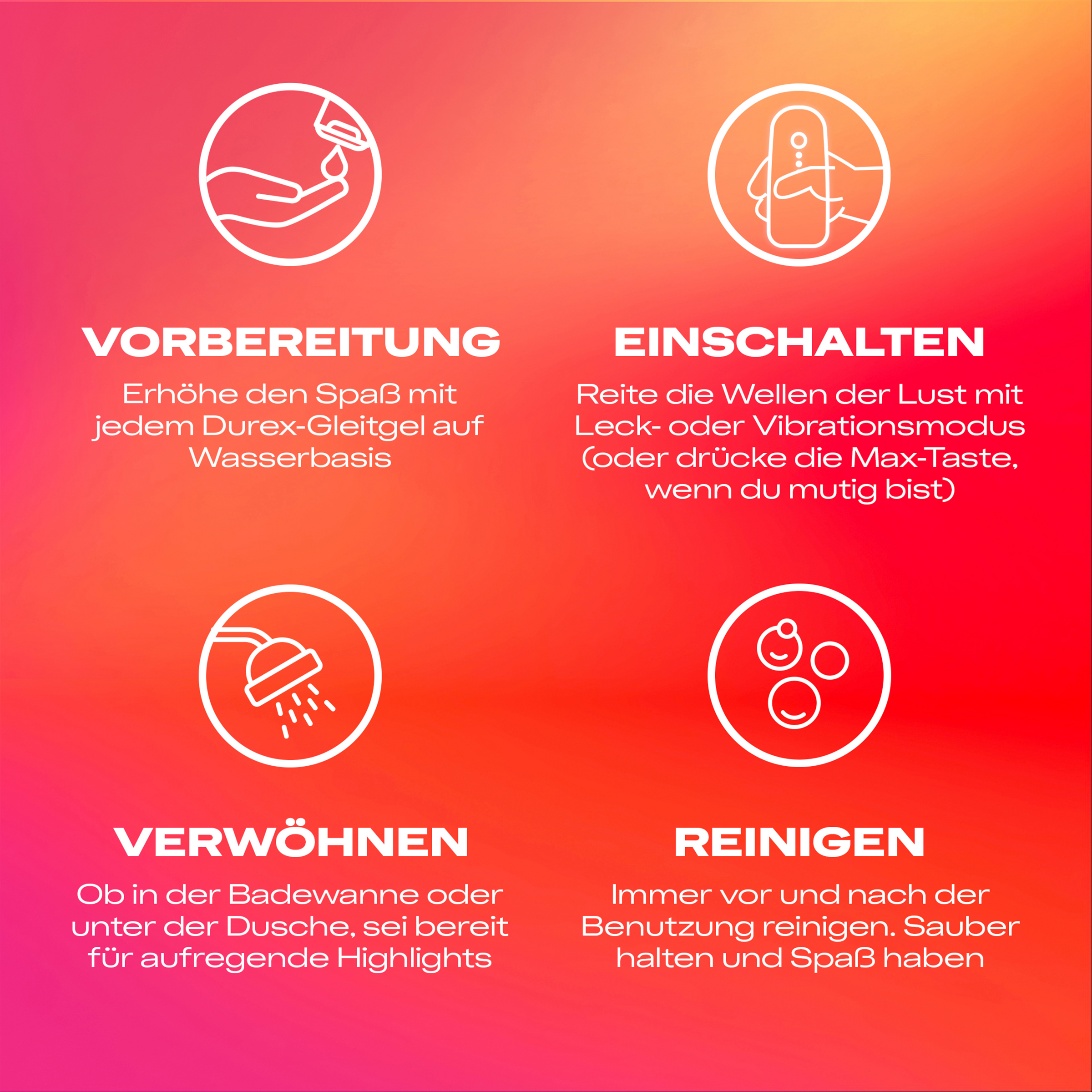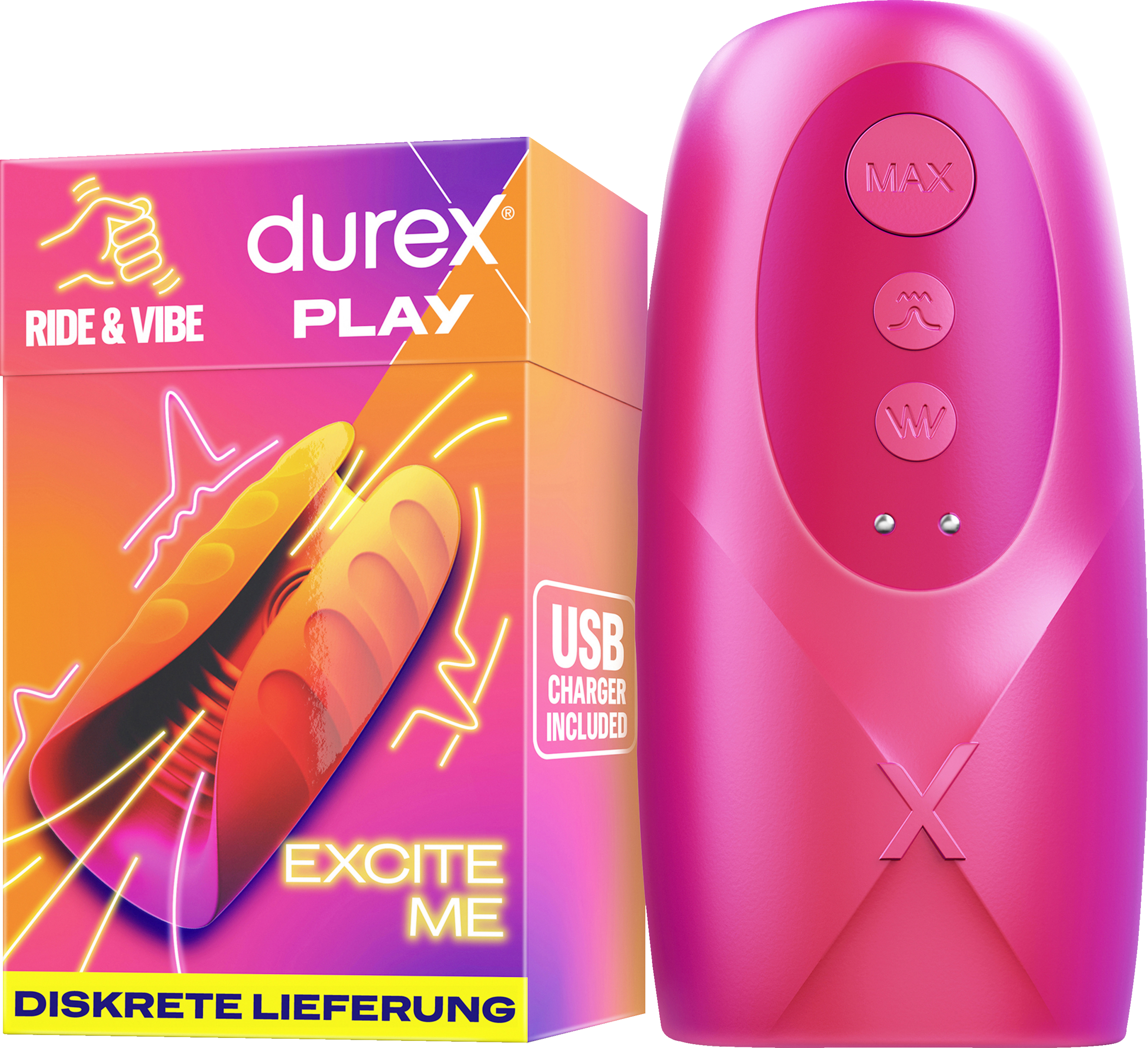 Bitte bewahre die Packungsbeilage auf, da sie wichtige Informationen zur Verwendung und Entsorgung des Produkts enthält. Diese Verpackung ist manipulationssicher. Kontrolliere das Gerät vor Gebrauch. Nicht verwenden, falls das Produkt beschädigt ist. Sexspielzeug ist zum Spaß, zum Ausprobieren und zum Vergnügen da; falls sich die Verwendung dieses Masturbators unangenehm oder schmerzhaft anfühlt, solltest du sofort damit aufhören. Sollten die Symptome weiter bestehen, suche bitte einen Arzt auf. Intensive Vibrationen und/oder übermäßiger Gebrauch können bei manchen Menschen ein Kribbeln oder einen Gefühlsverlust verursachen. Falls dies bei dir der Fall ist, höre auf, das Spielzeug zu benutzen, bis die normalen Empfindungen zurückkehren, und probiere es mit einer niedrigeren Einstellung. Sollten die Symptome weiter bestehen, suche bitte einen Arzt auf. Falls du einen Herzschrittmacher hast, wende dich bitte vor der Anwendung an deinen Arzt. Dieses Spielzeug ist kein Verhütungsmittel und schützt nicht vor sexuell übertragbaren Krankheiten. Uns liegt viel daran, dass du Spaß hast, aber wir empfehlen, dieses Spielzeug nicht zu teilen. Wenn du beschließt, das Spielzeug mit jemandem zu teilen, befolge bitte unbedingt die Anweisungen zur Reinigung. Reinige dein Spielzeug nach jeder Benutzung und zwischen jedem Partner. Das Hauptmaterial des Spielzeugs ist Silikon. Du kannst es mit jedem Durex-Gleitgel auf Wasserbasis verwenden (nicht in dieser Packung enthalten). Verwende keine Gleitmittel auf Öl oder Silikonbasis, Massageöle, Handcremes usw. zusammen mit diesem Produkt. Mehr Informationen auf: www.durex.com
