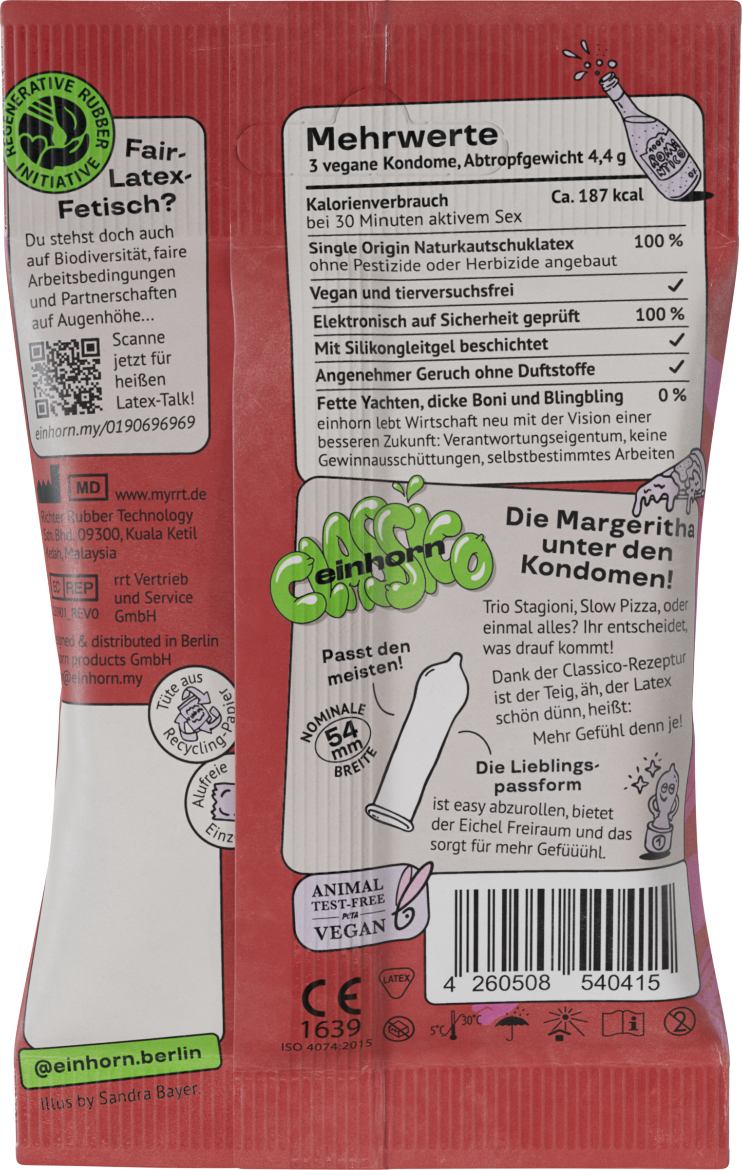 Neu überarbeitet. Genauso sicher, aber dünner für noch mehr Gefühl: 3 einhorn Kondome (nominale Breite: 54 mm, anatomische Form) aus Naturkautschuklatex, verpackt in einer großen Chipstüte. Ein Designobjekt ohne peinliches Einkaufserlebnis, dafür mit jeder Menge Spaß. Kein Plastik in der Sekundärverpackung, kein Alu in der Primärverpackung und ein Kondom aus 100% regenerativem Latex! Nachhaltig und fair! einhorn Kondome besitzen eine besondere Passform und sorgen an der Spitze für ein besonderes Freiheitsgefühl. Sie sind glockenförmig, mit Reservoir und gleitmittelbeschichtet. Naturfarben. Ihre nominale Breite beträgt 54 mm. Vegan und tierversuchsfrei.