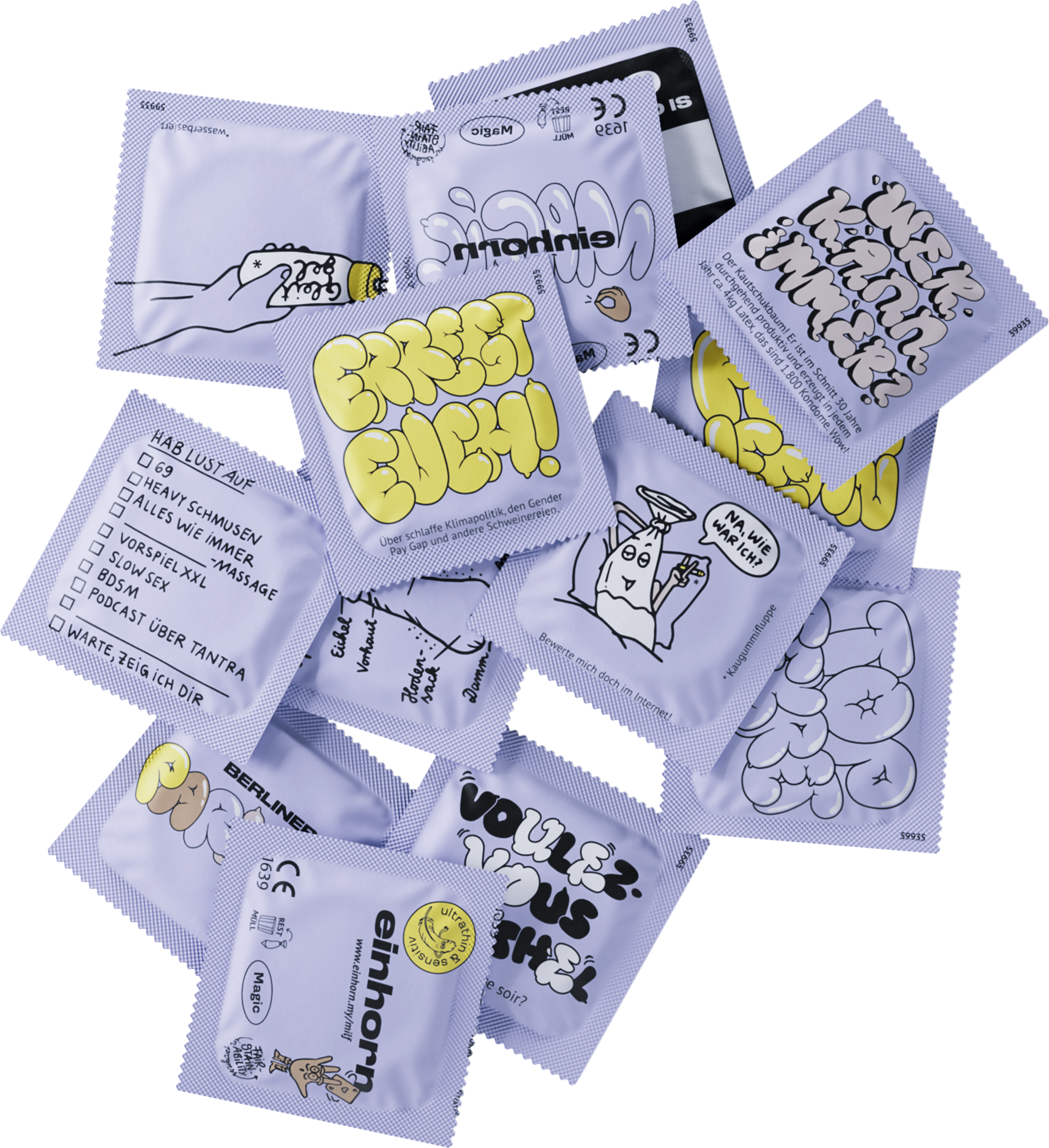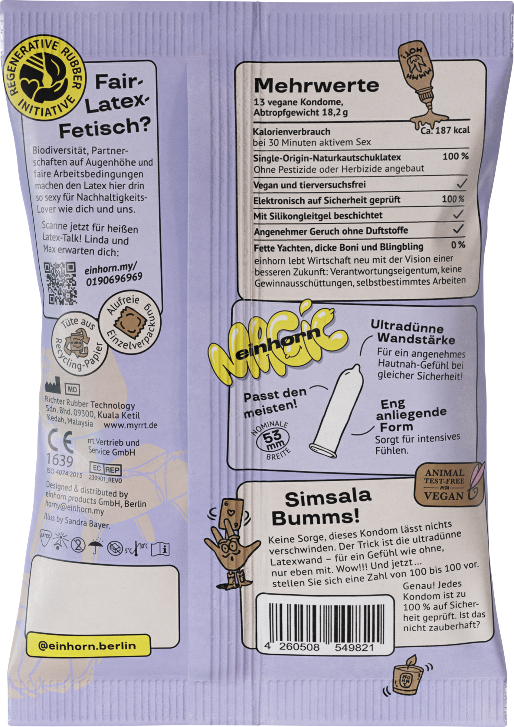 Neu überarbeitet. Genauso sicher, aber ultradünn für noch mehr Gefühl: 13 einhorn Kondome (nominale Breite: 53 mm, straight) aus Naturkautschuklatex, verpackt in einer großen Chipstüte. Ein Designobjekt ohne peinliches Einkaufserlebnis, dafür mit jeder Menge Spaß. Kein Plastik in der Sekundärverpackung, kein Alu in der Primärverpackung und ein Kondom aus 100% regenerativem Latex! Nachhaltig und fair! Diese einhorn ist ultradünn in Passform straight. Mit Reservoir und gleitmittelbeschichtet. Naturfarben. Ihre nominale Breite beträgt 53 mm. Vegan und tierversuchsfrei.