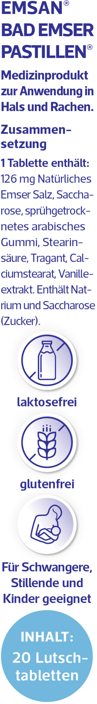 Bad Emser Pastillen® ohne Menthol wirken auf Basis ihres einzigartigen Mineralkomplexes. Dadurch befeuchten sie Mund und Rachen und lösen aktiv zähe Beläge. Das beruhigt die entzündete oder gereizte Rachenschleimhaut, fördert die Funktion des Stimmorgans und stärkt die lokale Abwehrkraft.