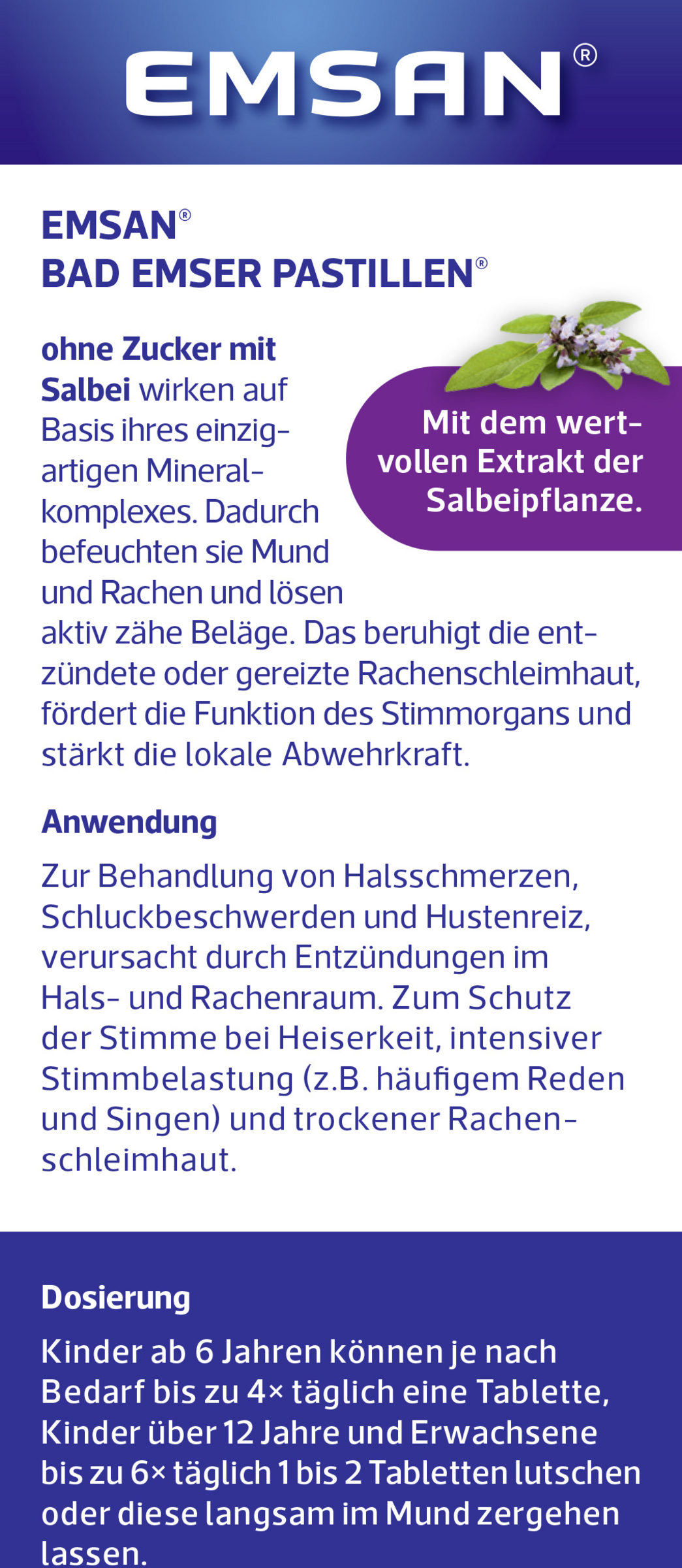 Bei den ersten Anzeichen einer Erkältung wie Halsschmerzen, Kratzen im Hals oder beginnendem Hustenreiz, sowie bei starker Stimmbelastung können Kinder ab 6 Jahren je nach Bedarf bis zu 4-mal täglich eine Tablette, Kinder über 12 Jahre und Erwachsene können bis zu 6-mal täglich 1 bis 2 Tabletten lutschen oder im Mund zergehen lassen. Für Patienten, die bestimmte Diäten einzuhalten haben, sind folgende Angaben zu beachten: 1 Tablette enthält ca. 0,00063 mg Iod (als Iodid) und ca. 40 mg Natrium. Bei bekannten Allergien gegenüber den Inhaltsstoffen sollten Sie Bad Emser Pastillen® ohne Zucker mit Salbei nicht anwenden.