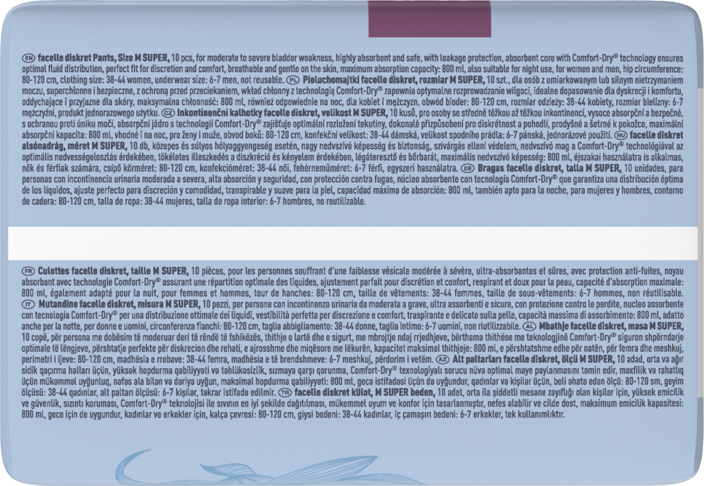 Der Saugkern mit Comfort-Dry® Technologie sorgt für eine optimale Flüssigkeitsverteilung. Die Flüssigkeit wird schnell und sicher ins Innere der Pants geleitet, für ein langanhaltendes Trockenheitsgefühl. Elastische Innenbündchen beugen dem Auslaufen vor und sorgen für maximale Sicherheit.