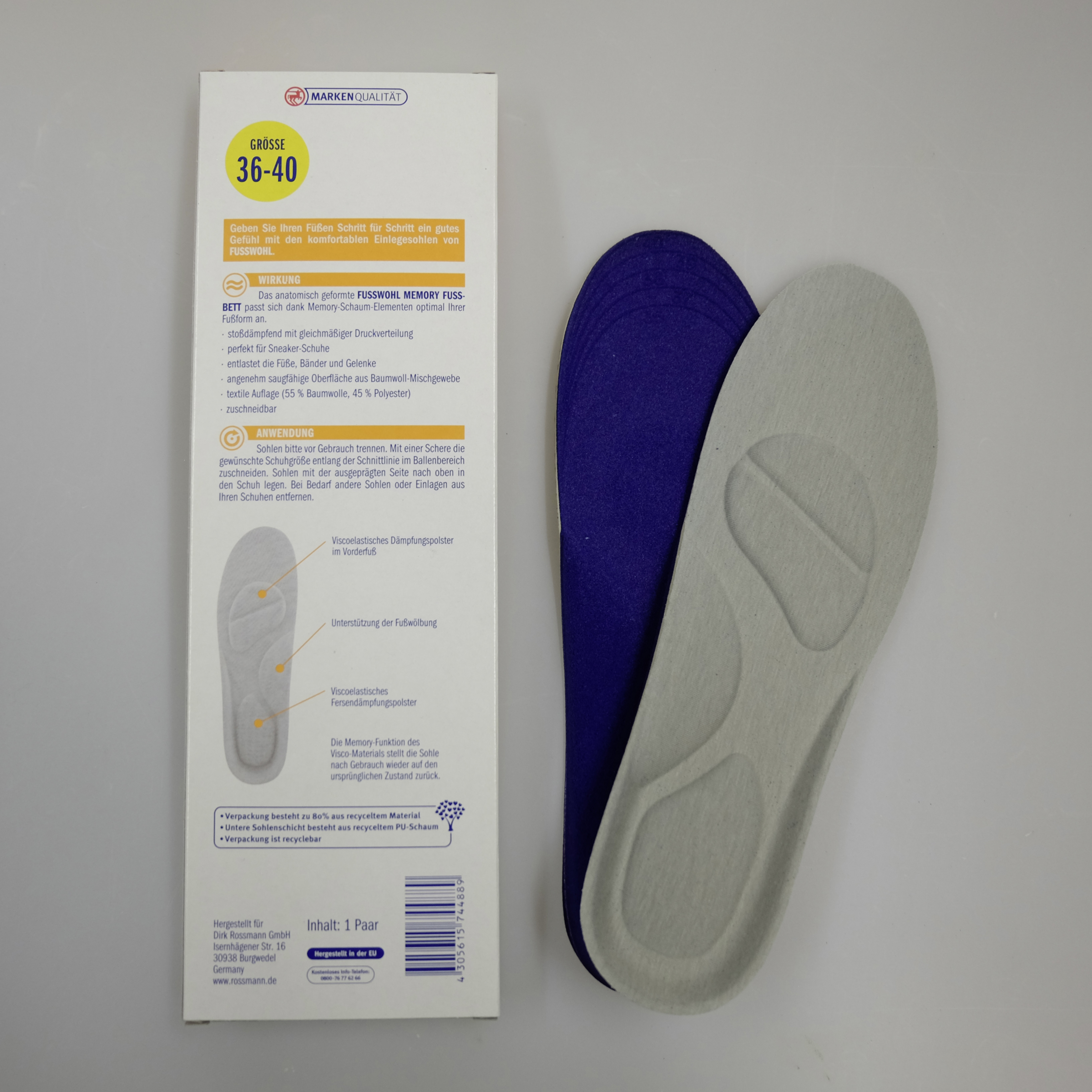 Sohlen bitte vor Gebrauch trennen. Mit einer Schere die gewünschte Schuhgröße entlang der Schnittlinie im Ballenbereich zuschneiden. Sohlen mit der ausgeprägten Seite nach oben in den Schuh legen. Bei Bedarf andere Sohlen oder Einlagen aus Ihren Schuhen entfernen.