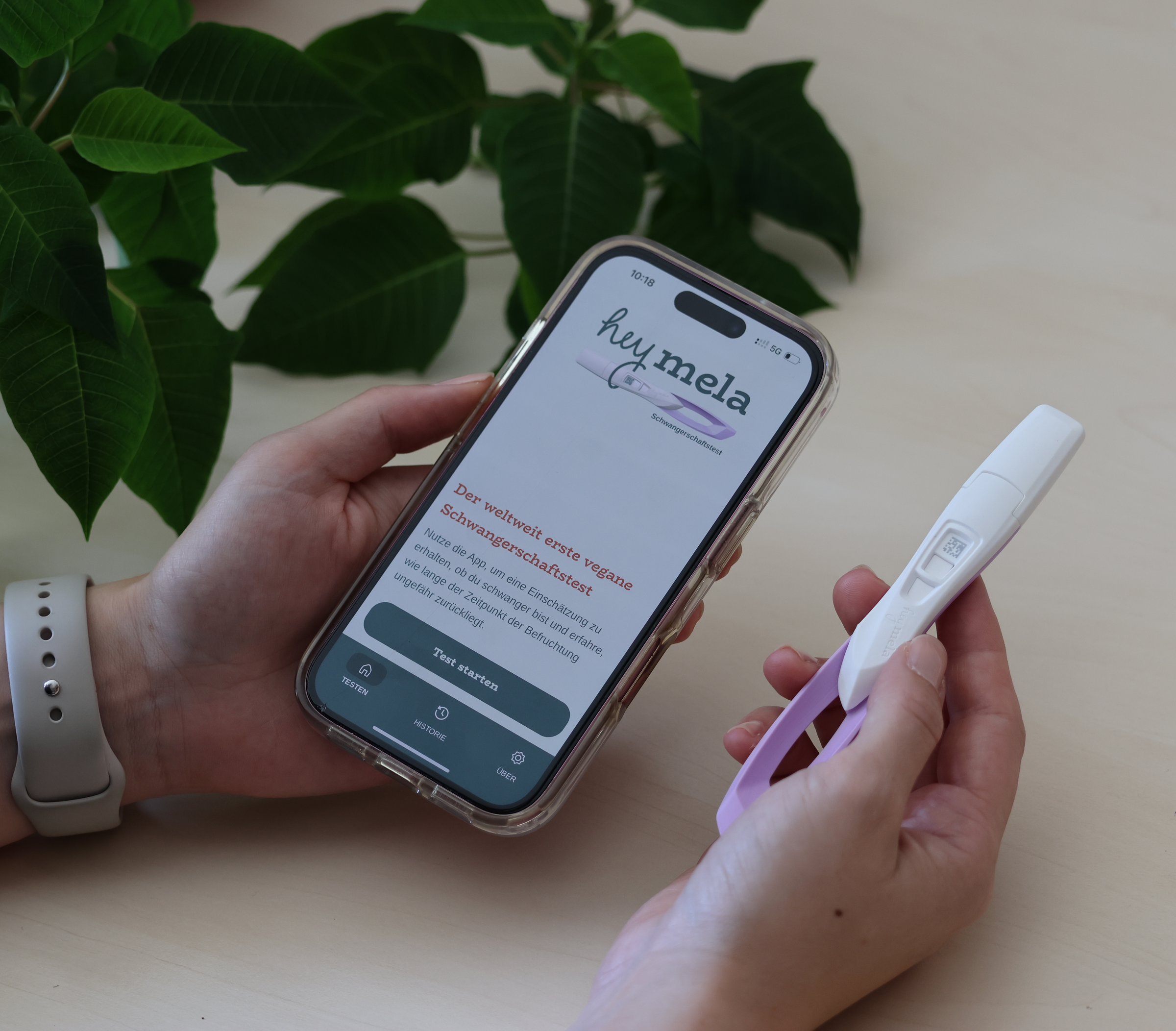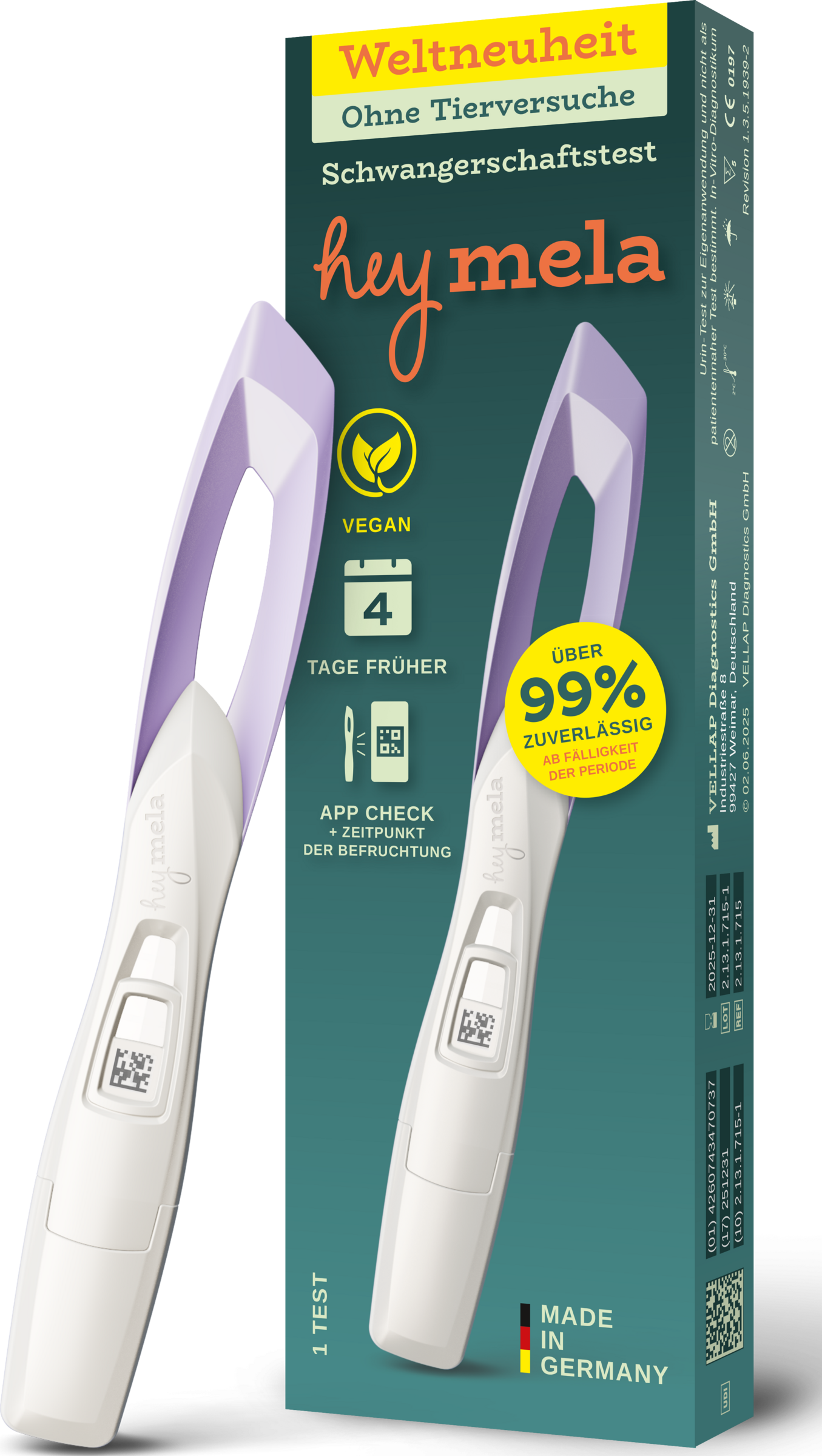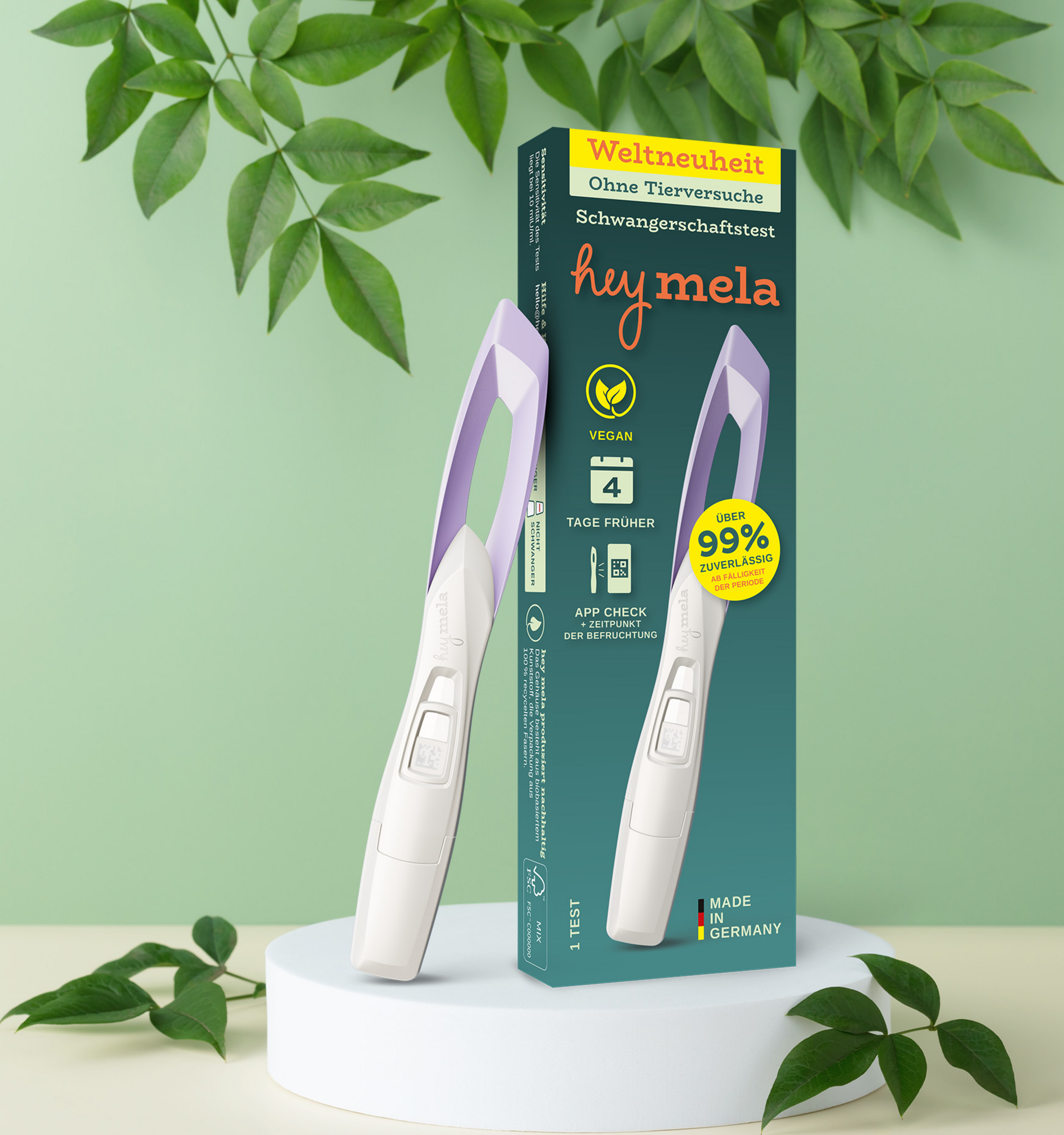Der weltweit erste vegane Schwangerschaftstest: hey mela® erkennt das Hormon hCG mit Antikörpern, die nicht aus Tieren gewonnen werden, sondern aus Kieselalgen stammen – ganz ohne Tierblutseren und Tierversuche. So bekommst du Gewissheit mit gutem Gewissen. Der Test ist über 99 % zuverlässig (ab Fälligkeit der Periode) und kann bereits bis zu 4 Tage vor Fälligkeit angewendet werden. Die Ergebnisanzeige ist klar und intuitiv – optional unterstützt dich der App-Check bei der digitalen Auswertung und gibt einen geschätzten Zeitraum der Befruchtung. Damit Verantwortung nicht an der Verpackung endet, setz der Hersteller auf biobasierten Kunststoff, eine Verpackung aus 100 % recycelten Fasern und eine umweltfreundliche Entsorgung ohne Elektromüll. Entwickelt und hergestellt in Deutschland – für kurze Wege und hohe Qualität.