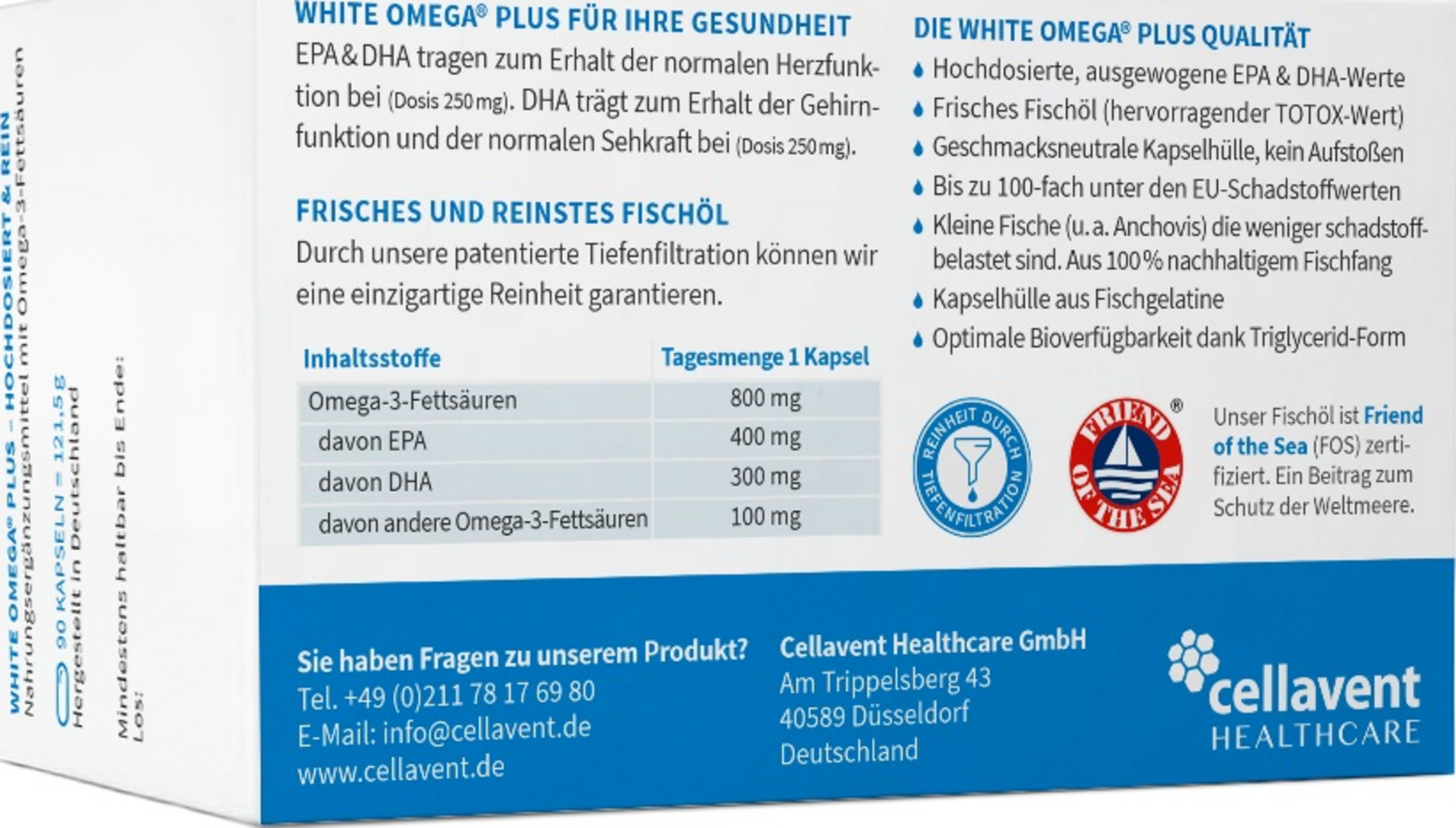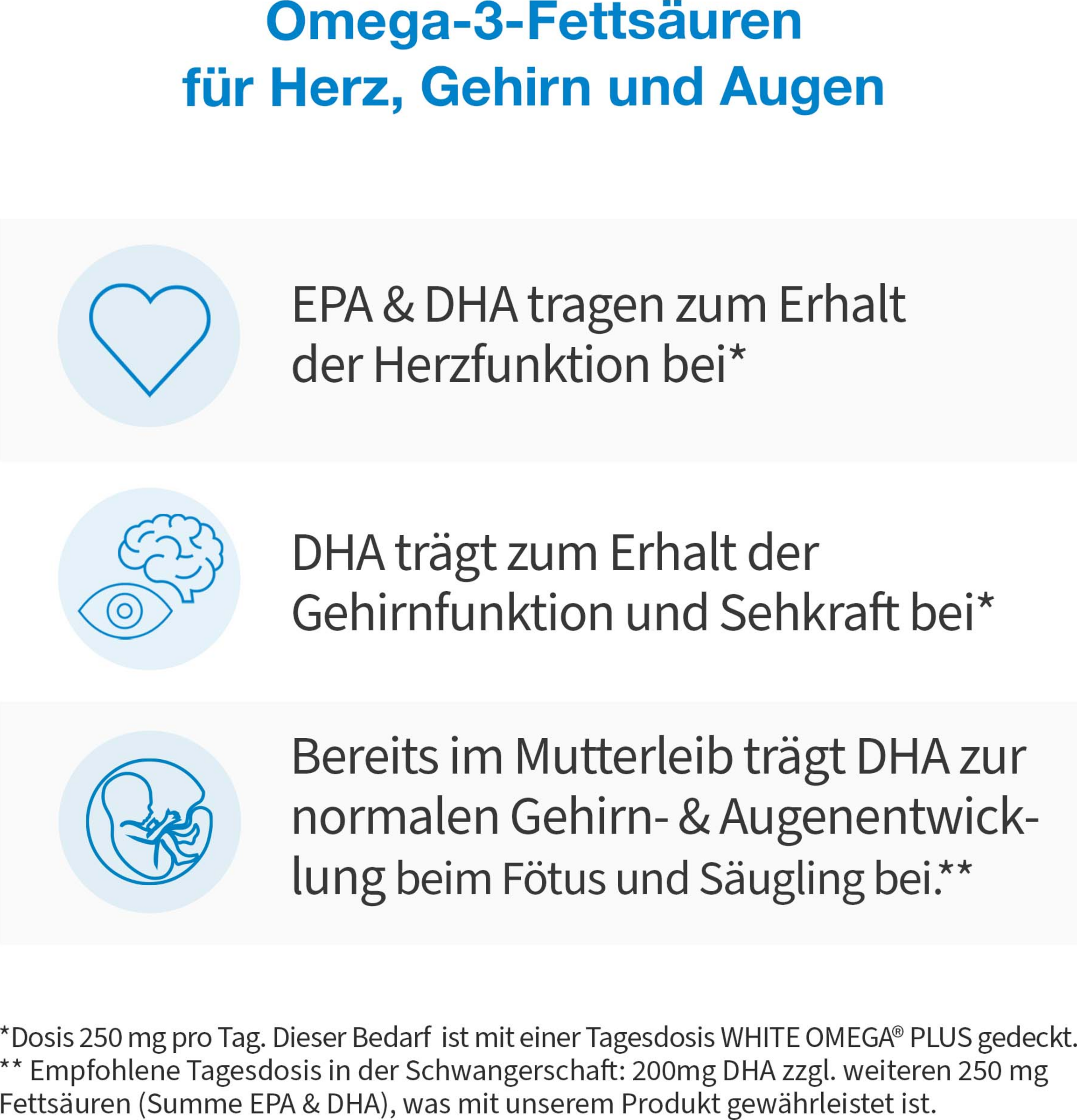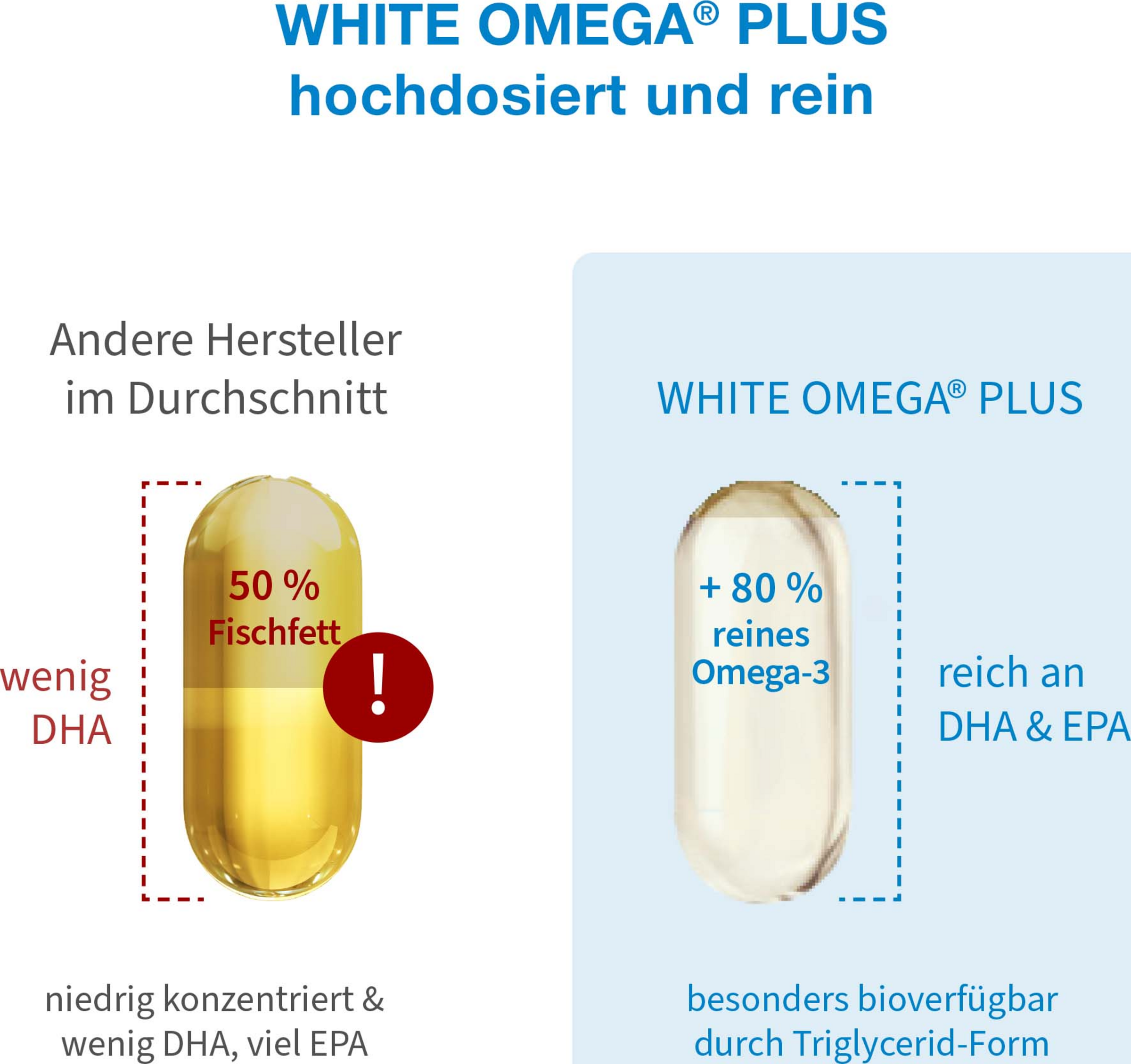 WHITE OMEGA PLUS - das frische, sichere und hochkonzentrierte Omega-3 setzt neue Maßstäbe im Hinblick auf Reinheit und Qualität bei Omega-3-Fischöl-Kapseln. 800 mg Omega-3- Fettsäuren pro Kapseln mit 400 mg EPA und 300 mg DHA in hochbioverfügbarer Triglycerid-Form. 100-fach reiner als herkömmliche Fischöle mit besten TOTOX-Oxidationswerten. Ihrer Gesundheit zuliebe.