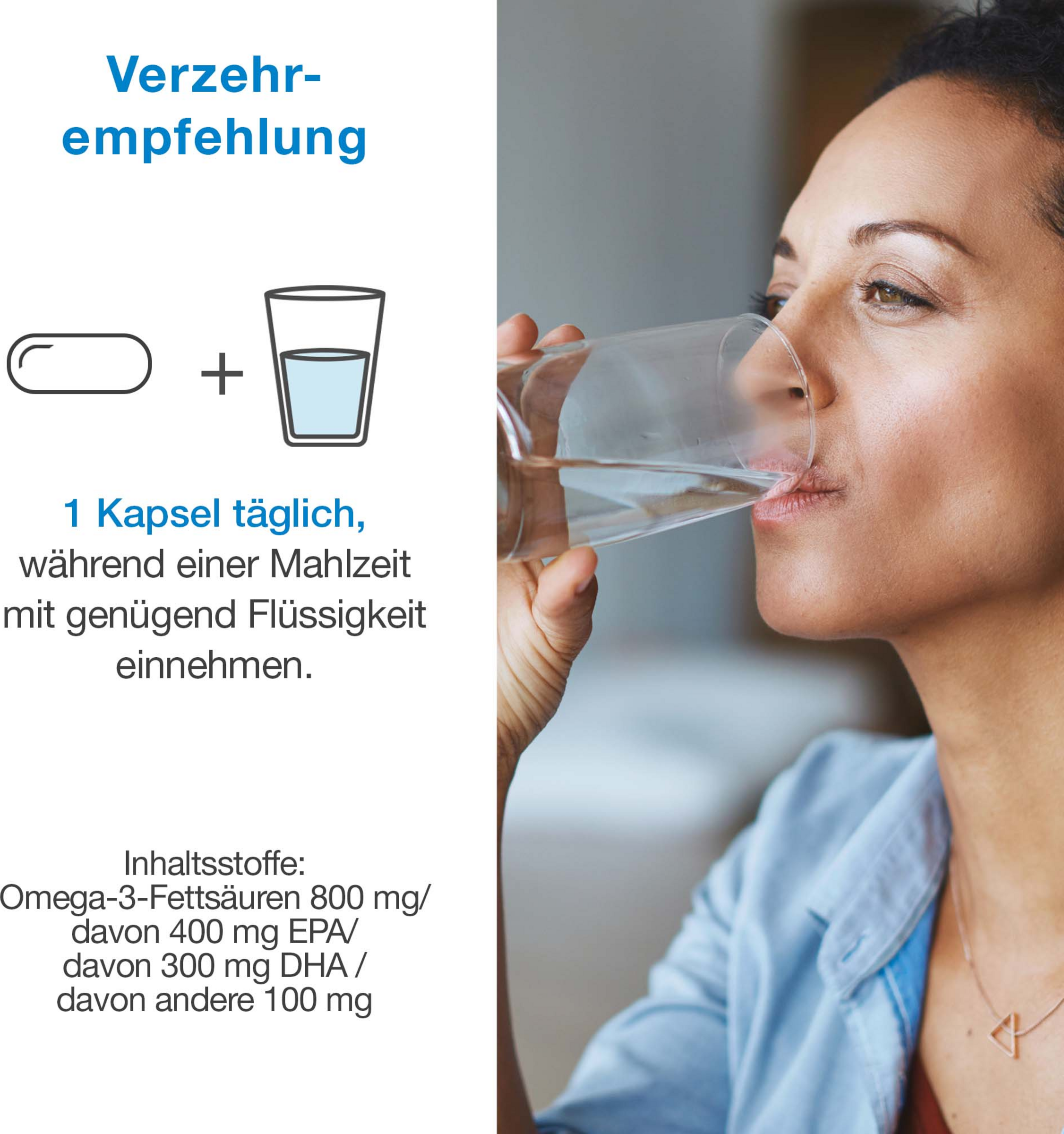 - sichere und hochdosierte Omega-3-Fettsäuren mit 400 mg EPA & 300 mg DHA pro Tagesdosis