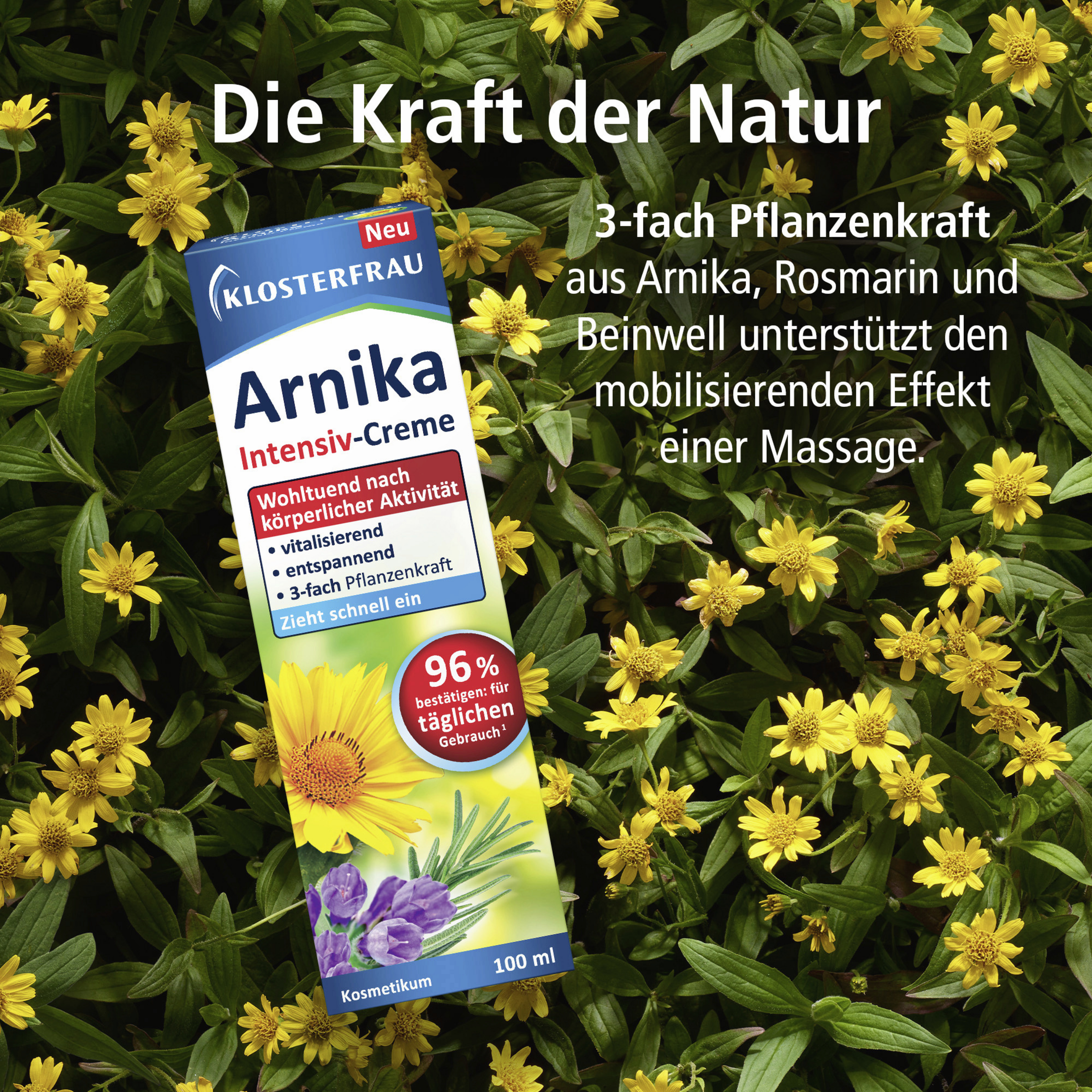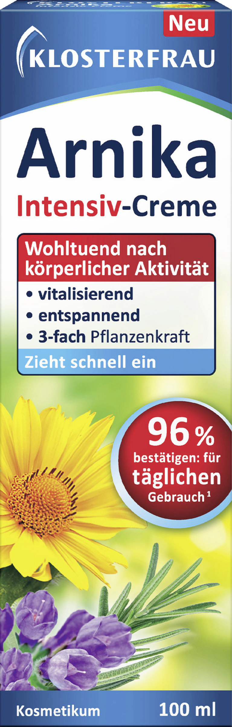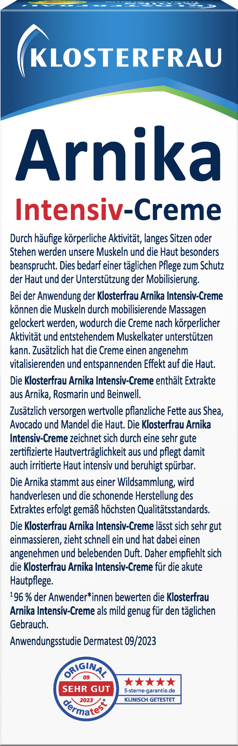 ¹96 % der Anwender*innen bewerten die KLOSTERFRAU Arnika Intensiv-Creme als mild genug für den täglichen Gebrauch. Anwendungsstudie Dermatest 09/2023