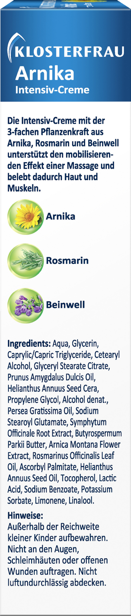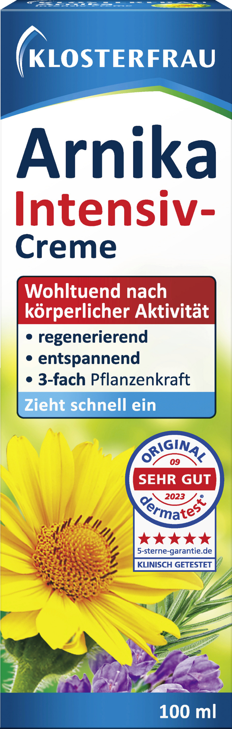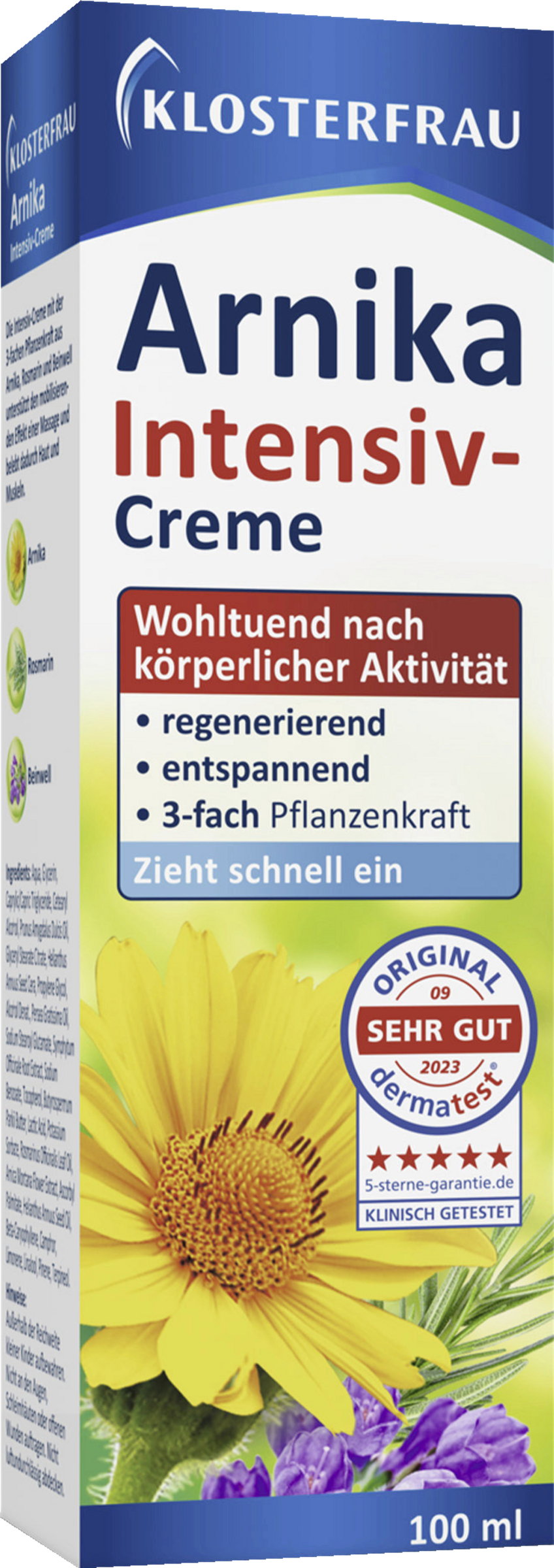Zusätzlich versorgen wertvolle pflanzliche Fette aus Shea, Avocado und Mandel die Haut. Die KLOSTERFRAU Arnika Intensiv-Creme zeichnet sich durch eine sehr gute zertifizierte Hautverträglichkeit aus und pflegt damit auch irritierte Haut intensiv und beruhigt spürbar. Die Arnika stammt aus einer Wildsammlung, wird handverlesen und die schonende Herstellung des Extraktes erfolgt gemäß höchsten Qualitätsstandards.