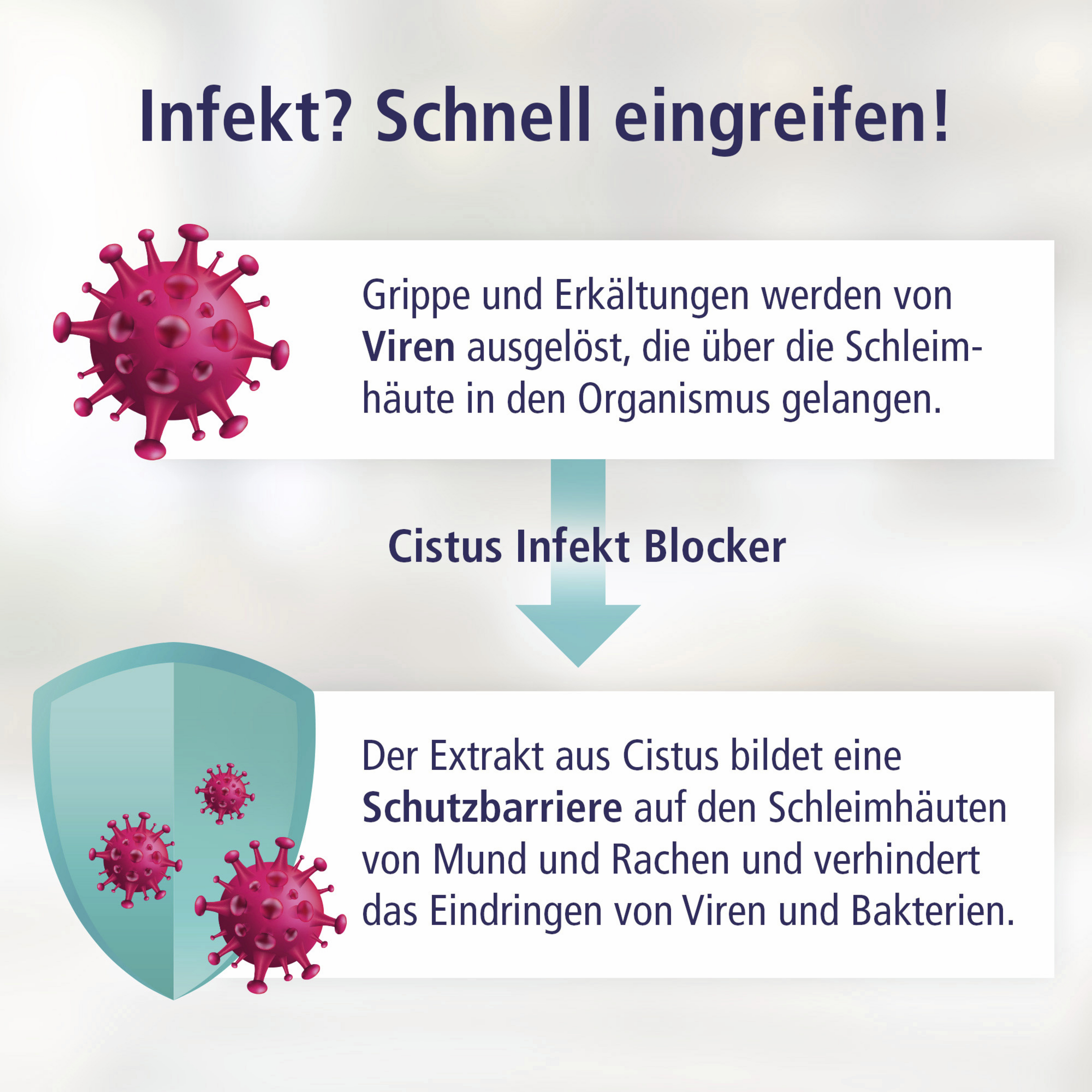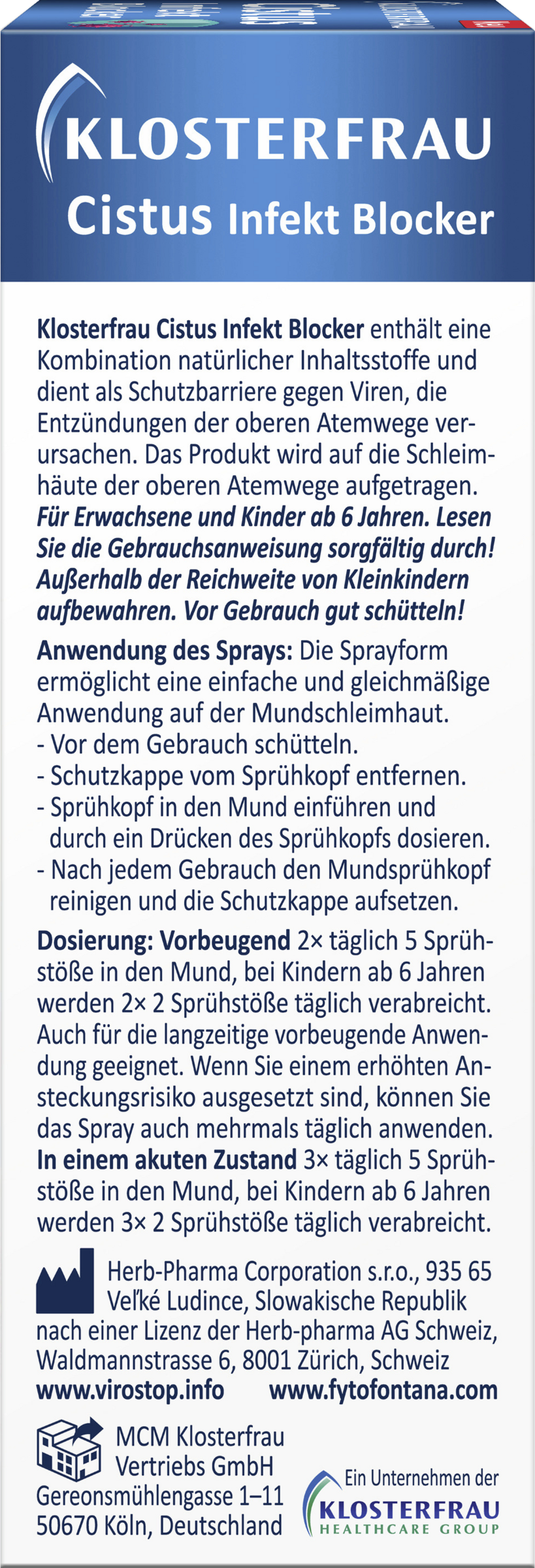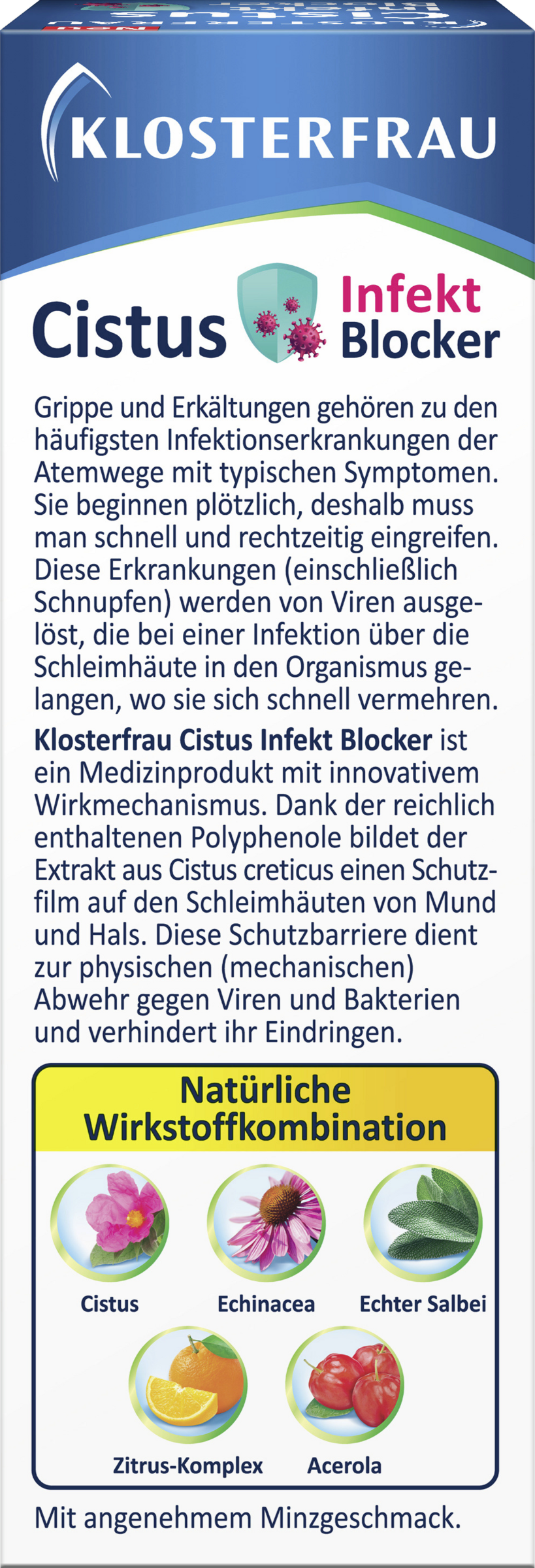 KLOSTERFRAU Cistus Infekt Blocker ist ein Medizinprodukt mit innovativem Wirkmechanismus. Dank der reichlich enthaltenen Polyphenole bildet der Extrakt aus Cistus creticus einen Schutzfilm auf den Schleimhäuten von Mund und Hals. Diese Schutzbarriere dient zur physischen (mechanischen) Abwehr gegen Viren und Bakterien und verhindert ihr Eindringen. Das Medizinprodukt wirkt auf der Schleimhaut der oberen Atemwege - konkret auf der Mundschleimhaut. Weitere Inhaltsstoffe - Zitrus-Bioflavonoide, Purpursonnenhut, Echter Salbei und Barbados-Kirsche (Acerola) verstärken die neutralisierende Wirkung gegen Viren.