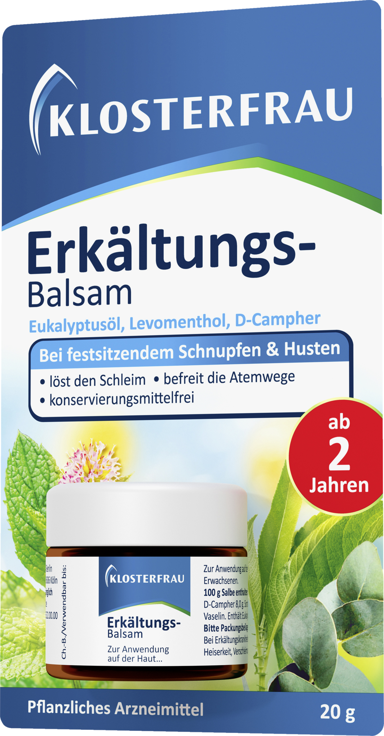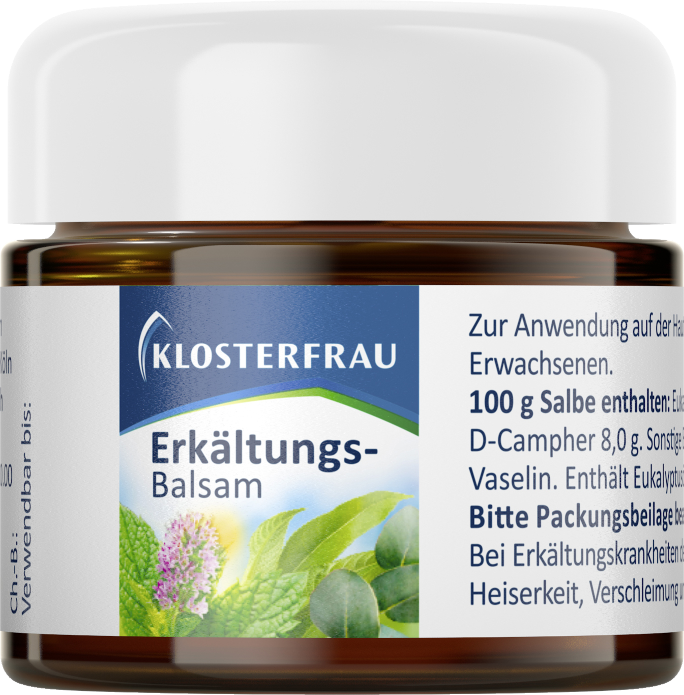 Mit seiner dreifachen Wirkstoffkombination aus Eukalyptus, Kampher und Menthol wirkt der Klosterfrau Erkältungs-Balsam äußerlich angewendet auf natürlichem Weg bei Erkältungskrankheiten der Atemwege wie Schnupfen, Husten und Bronchialkatarrh. Der Klosterfrau Erkältungs-Balsam zur äußerlichen Anwendung fördert die Hautdurchblutung und führt zu einer angenehmen Erwärmung der behandelten Hautpartien. Beim Einreiben werden die wertvollen ätherischen Öle freigesetzt und über die Atemwege aufgenommen, so dass Verschleimungen im Bronchialbereich ebenfalls günstig beeinflusst werden.