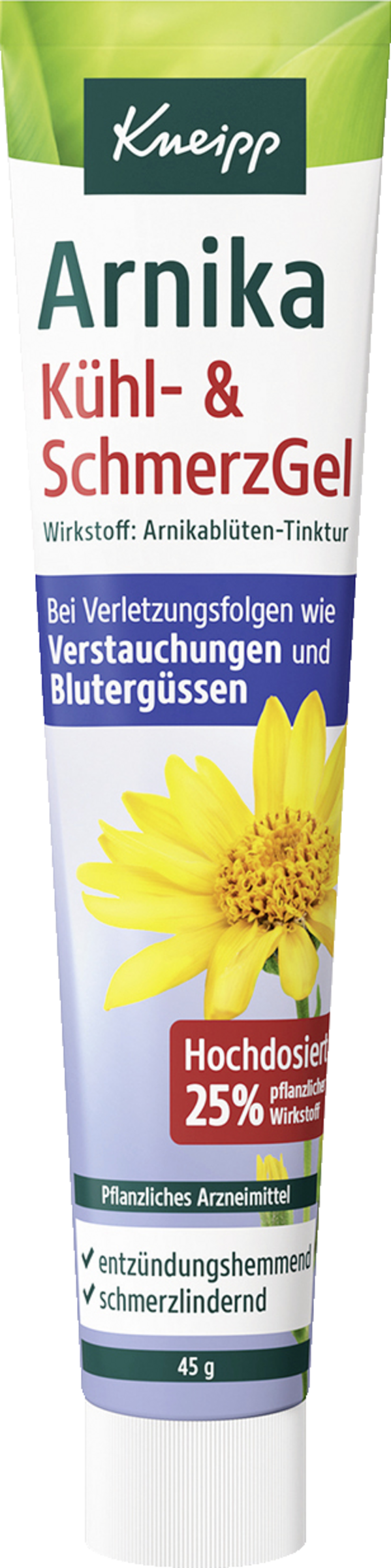 Kneipp® Arnika Kühl- & Schmerz Gel. Wirkstoff: Arnikablüten-Tinktur 25%. Gel zur Anwendung bei Erwachsenen und Heranwachsenden ab 12 Jahren. Zur äußerlichen Anwendung bei Verletzungs- und Unfallfolgen, z.B. bei Blutergüssen (Hämatomen), Verstauchungen (Distorsionen), Prellungen, Quetschungen. Enthält Benzylbenzoat.