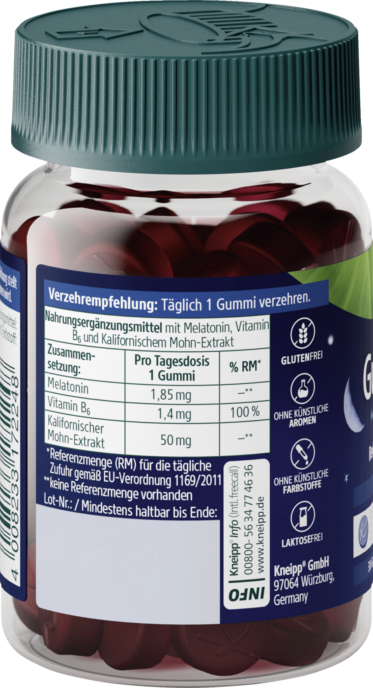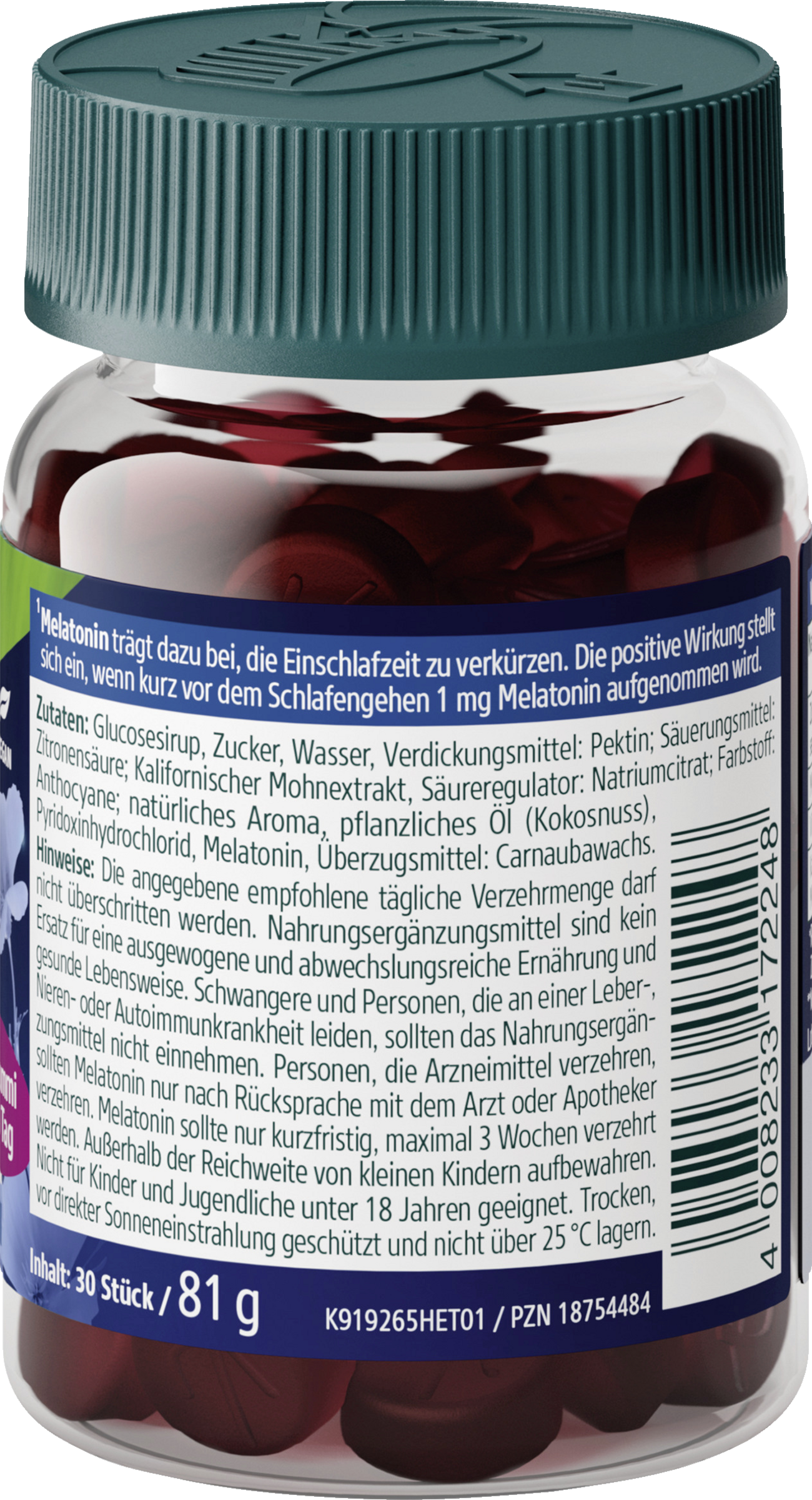 Glucosesirup, Zucker, Wasser, Verdickungsmittel: Pektin; Säuerungsmittel: Zitronensäure; Kalifornischer Mohnextrakt, Säureregulator: Natriumcitrat; Farbstoff: Anthocyane; natürliches Aroma, pflanzliches Öl (Kokosnuss), Pyridoxinhydrochlorid, Melatonin, Überzugsmittel: Carnaubawachs.