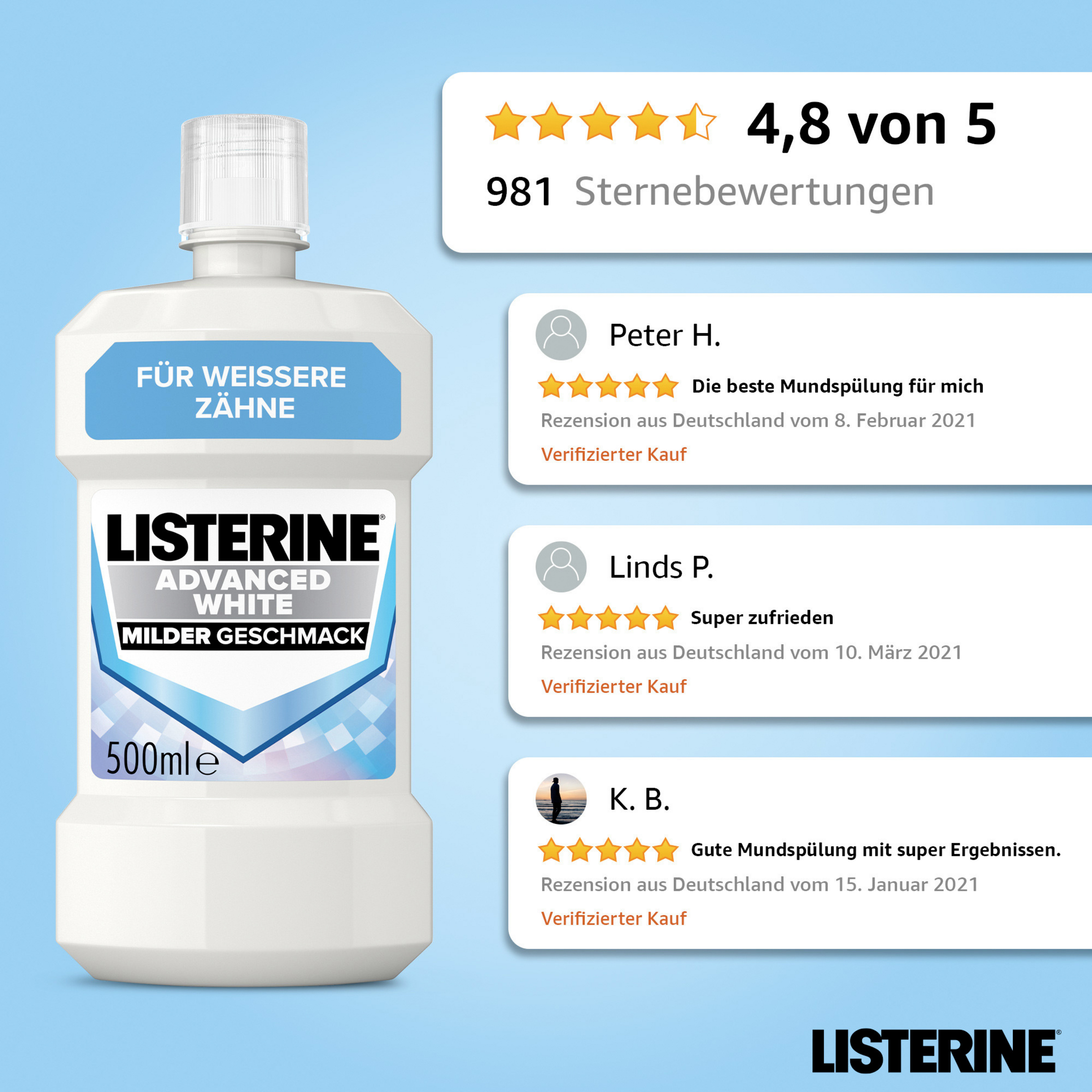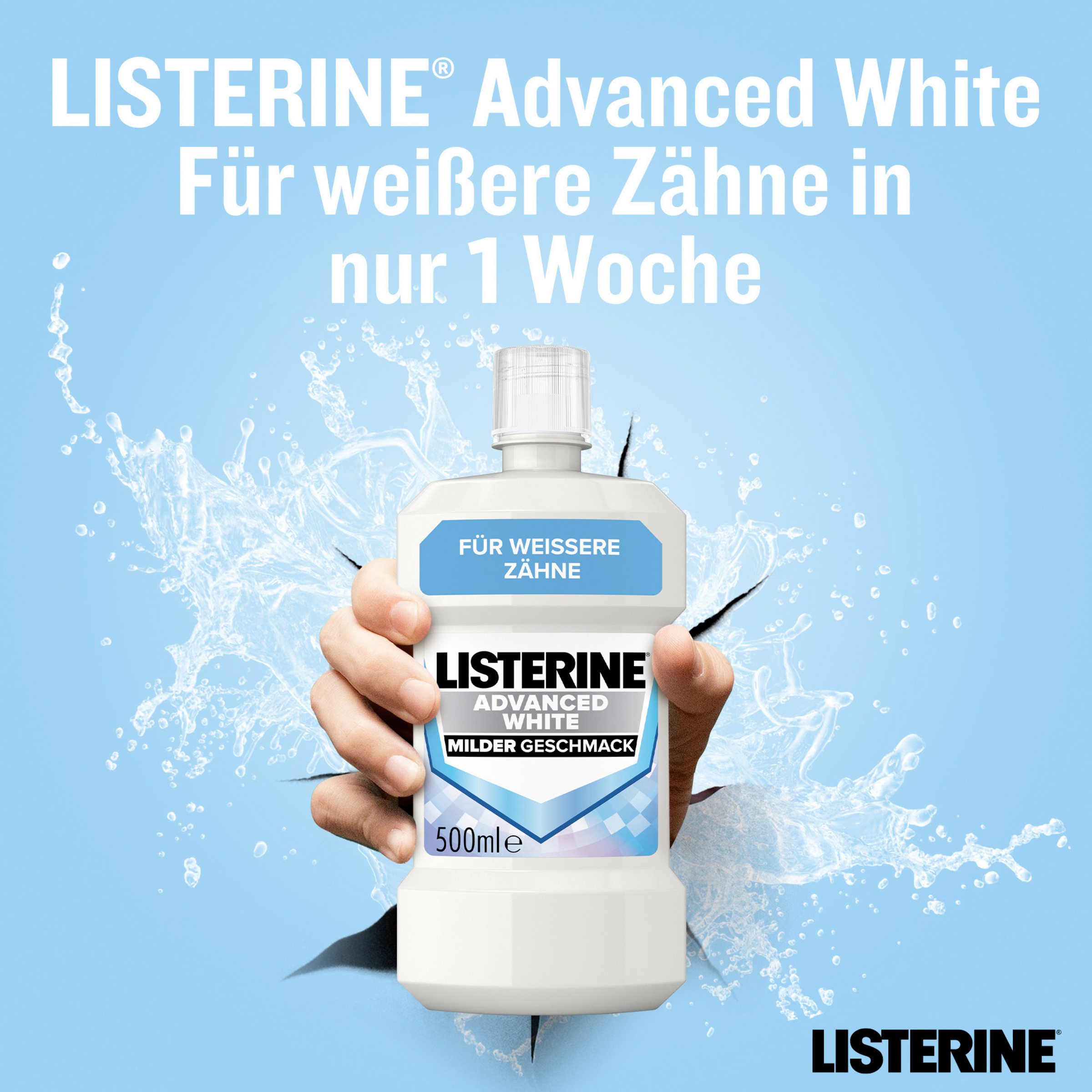 Zweimal am Tag angewendet, löst LISTERINE Advanced White milder Geschmack nachweislich Zahnverfärbungen und beugt neuen vor – für weißere Zähne in nur 1 Woche. Die Mundspülung mit der nicht-abrasiven Whitening Technologie reinigt die Zahnoberfläche, ohne den Zahnschmelz anzugreifen und die kraftvoll ätherischen Öle entfernen bis zu 97% der Bakterien, die Plaque verursachen. Zudem remineralisiert und stärkt sie die Zähne mit Fluorid.