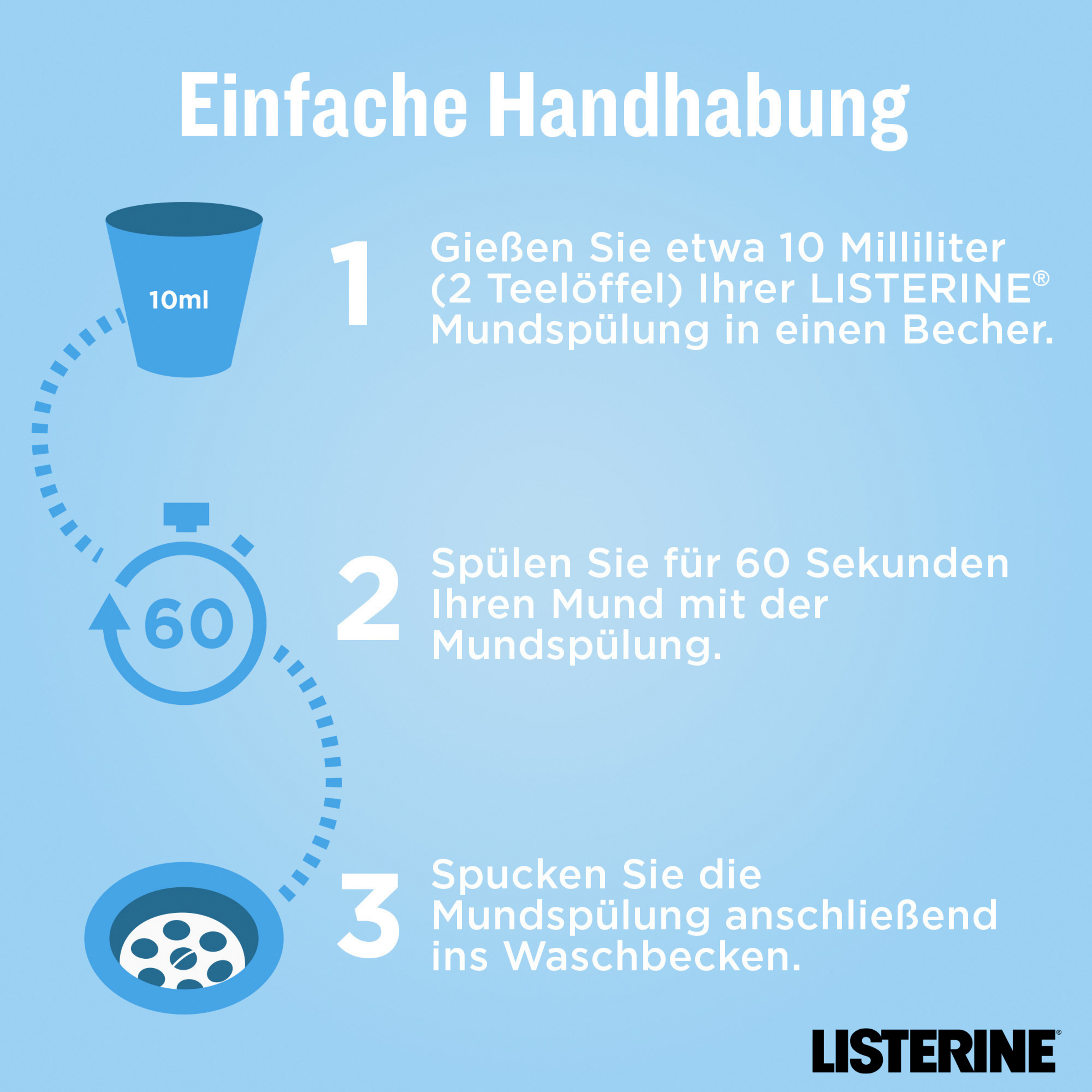 Für den besten Effekt morgens und abends täglich nach dem Zähneputzen spülen. Dazu 10 ml (ca. 2 Teelöffel) in ein Glas geben, ca. 60 Sekunden spülen und anschließend ausspucken. Kindergesicherter Verschluss.